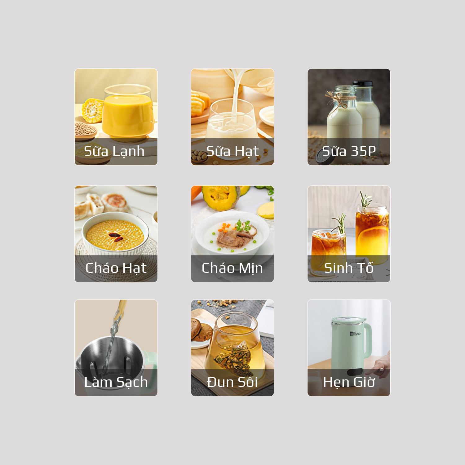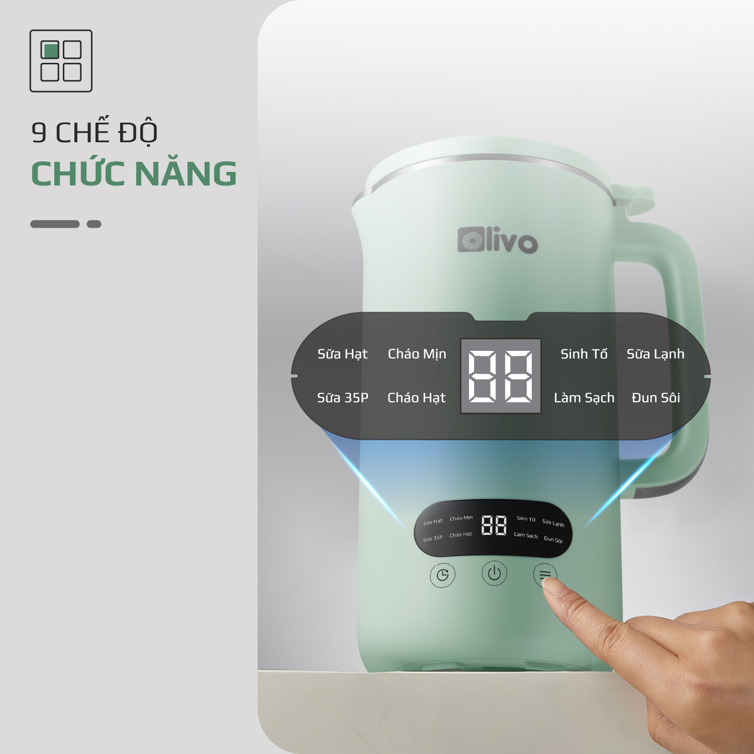 So với phương pháp nấu sữa hạt truyền thống trước kia, máy xay nấu đa năng OLIVO CB1000 giảm các công đoạn xuống một cách tối đa, không cần mất công sơ chế nguyên liệu hay chuẩn bị dụng cụ lỉnh kỉnh. Để mang lại những thao tác thuận tiện cho người dùng, OLIVO CB1000 sở hữu đến 9 chế độ chức năng cài đặt sẵn vô cùng tiện lợi.