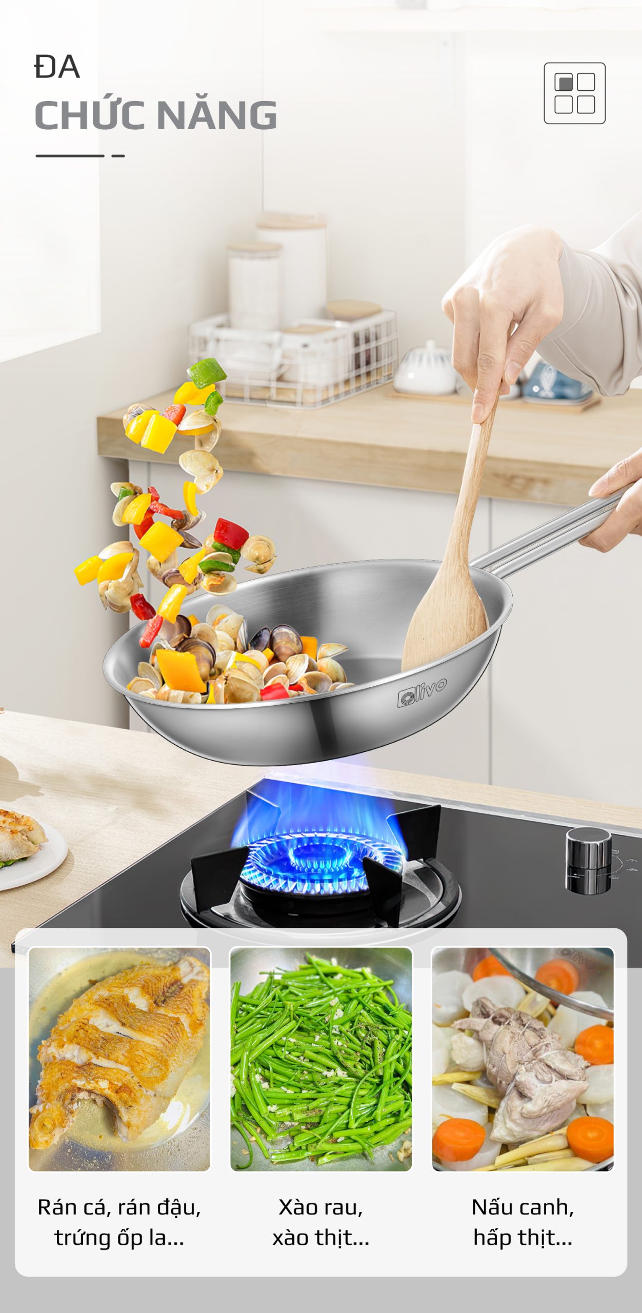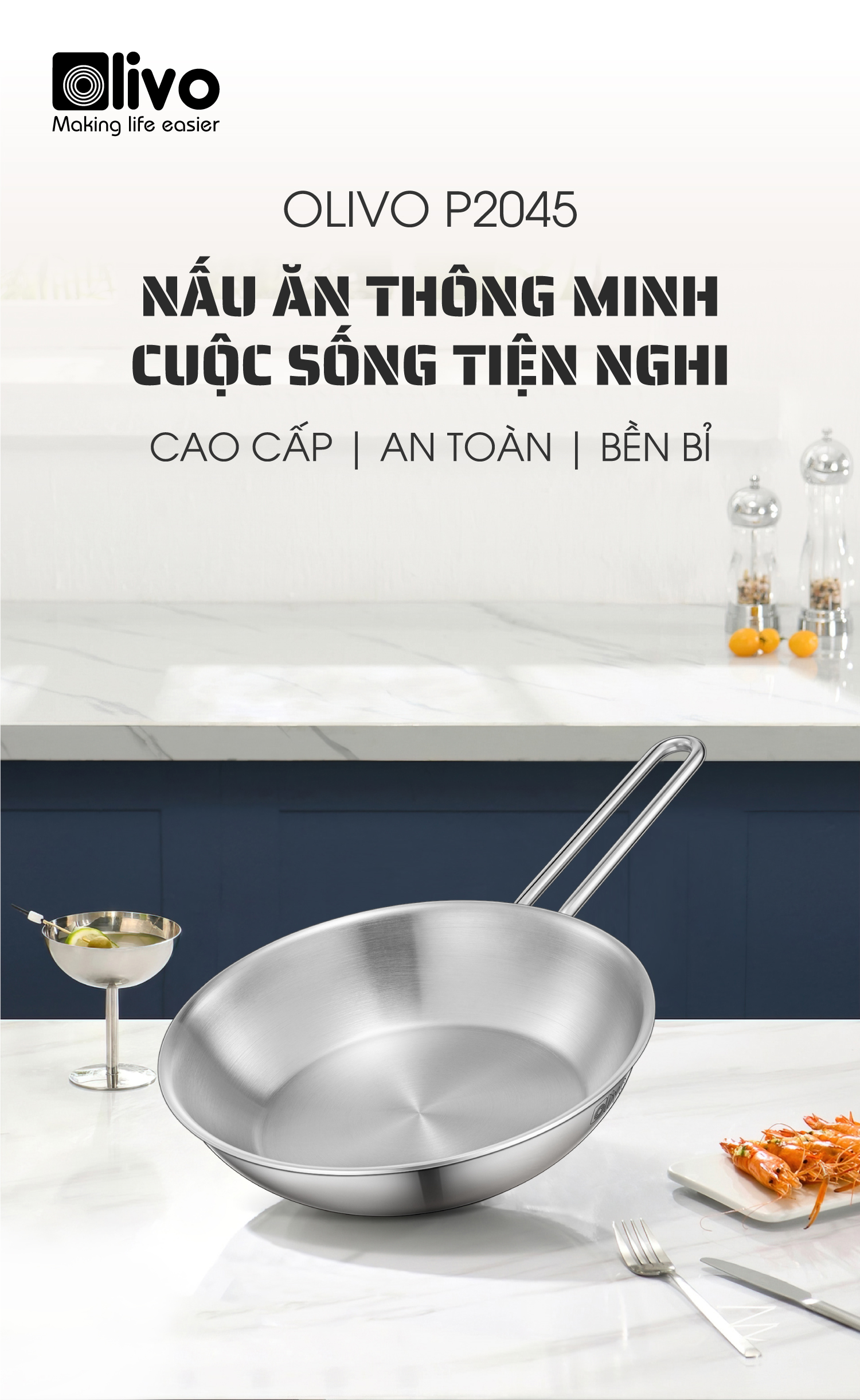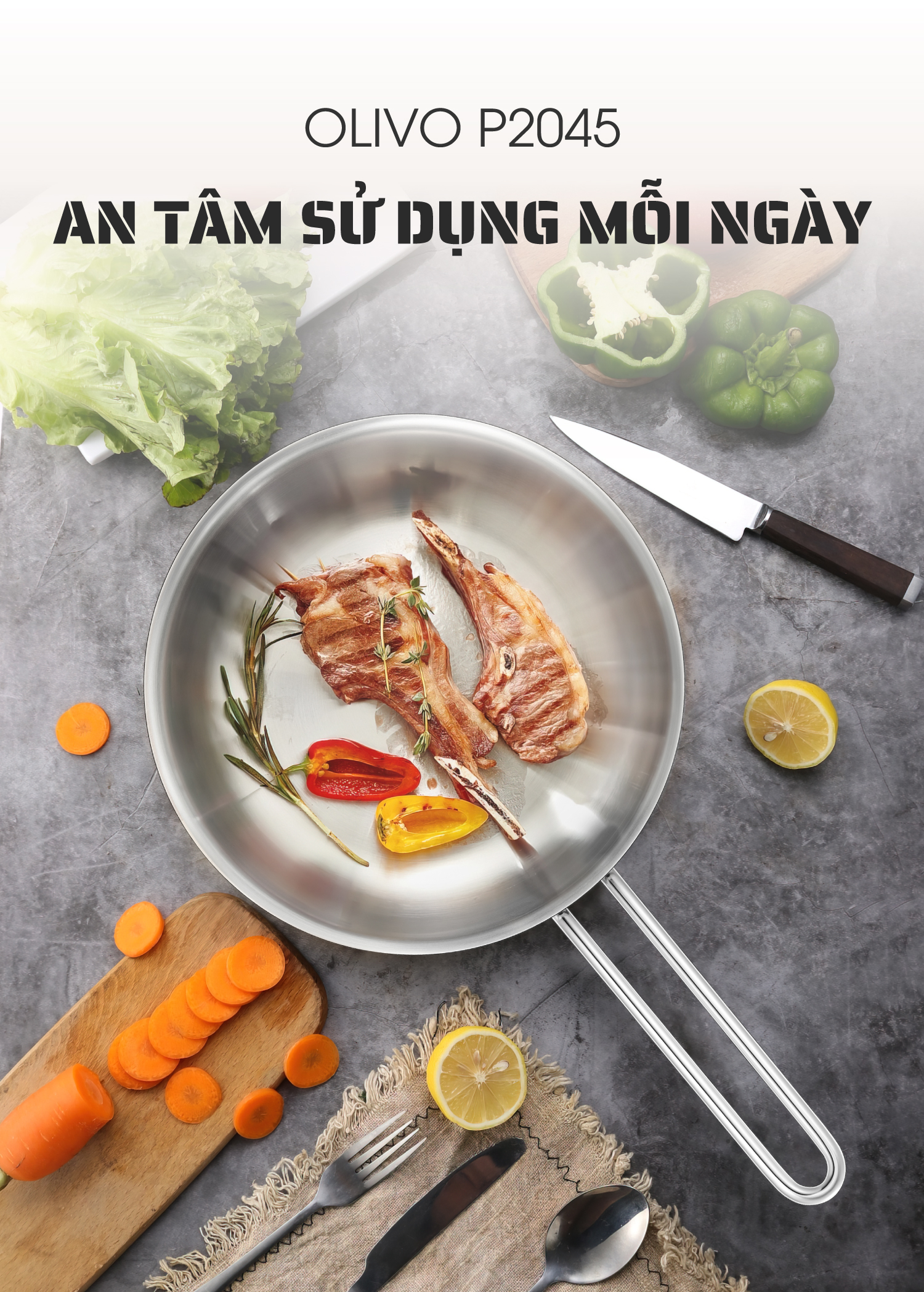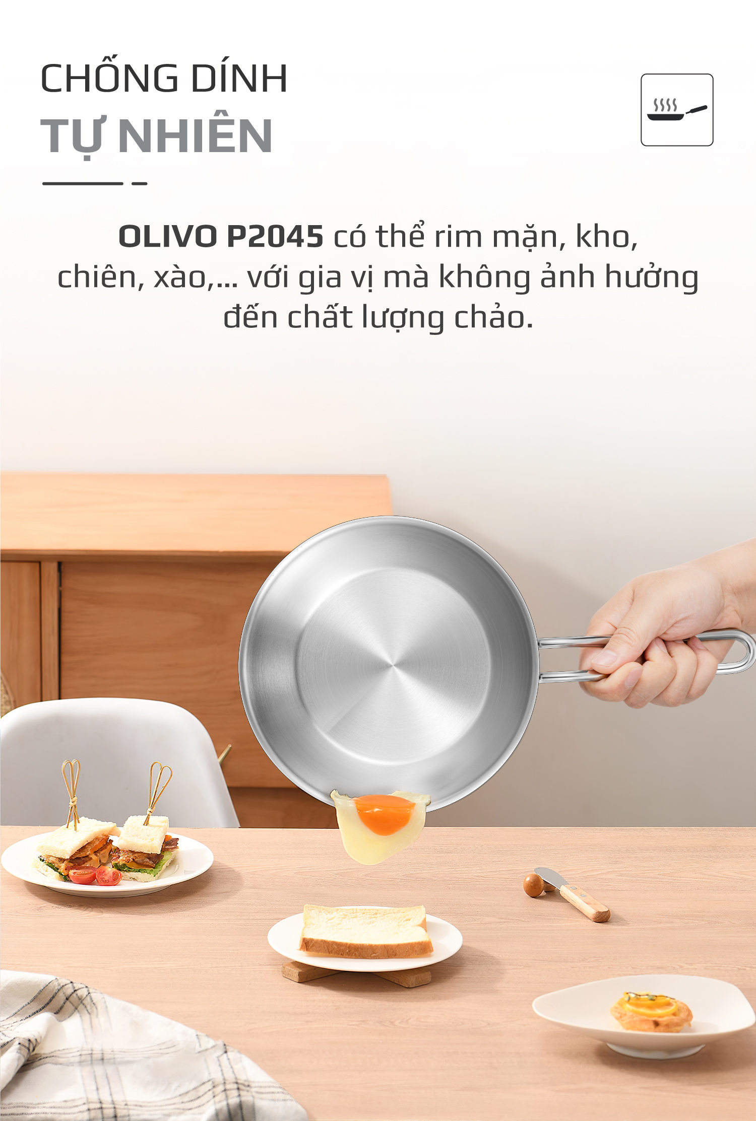 • OLIVO P2045 có thể rim mặn, kho, chiên, xào,… mà không ảnh hưởng đến chất lượng chảo vì chất liệu INOX 304 có khả năng chống dính tự nhiên.