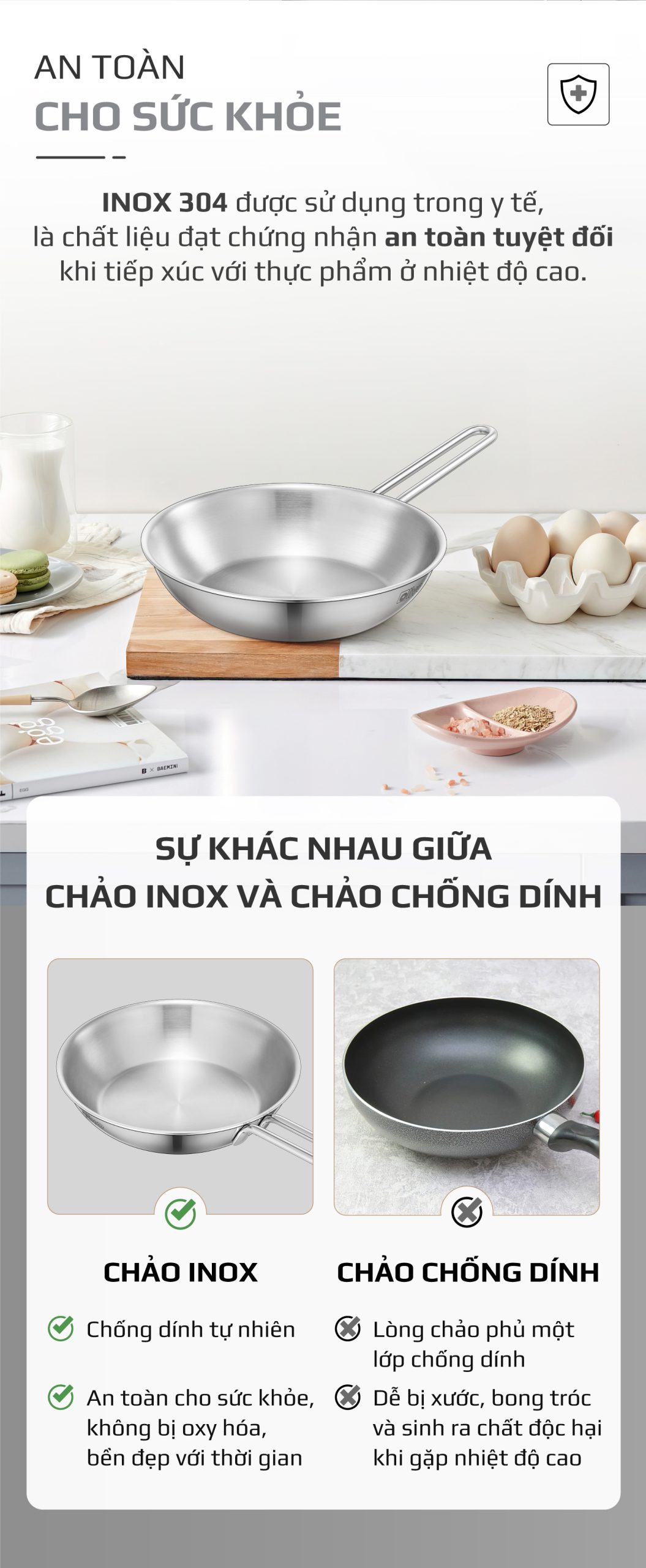 • Chảo chất liệu INOX cũng bền bỉ hơn, sử dụng thoải mái hơn mà không lo chảo bị xước, bong lớp chống dính sinh ra những chất độc hại cho sức khỏe.