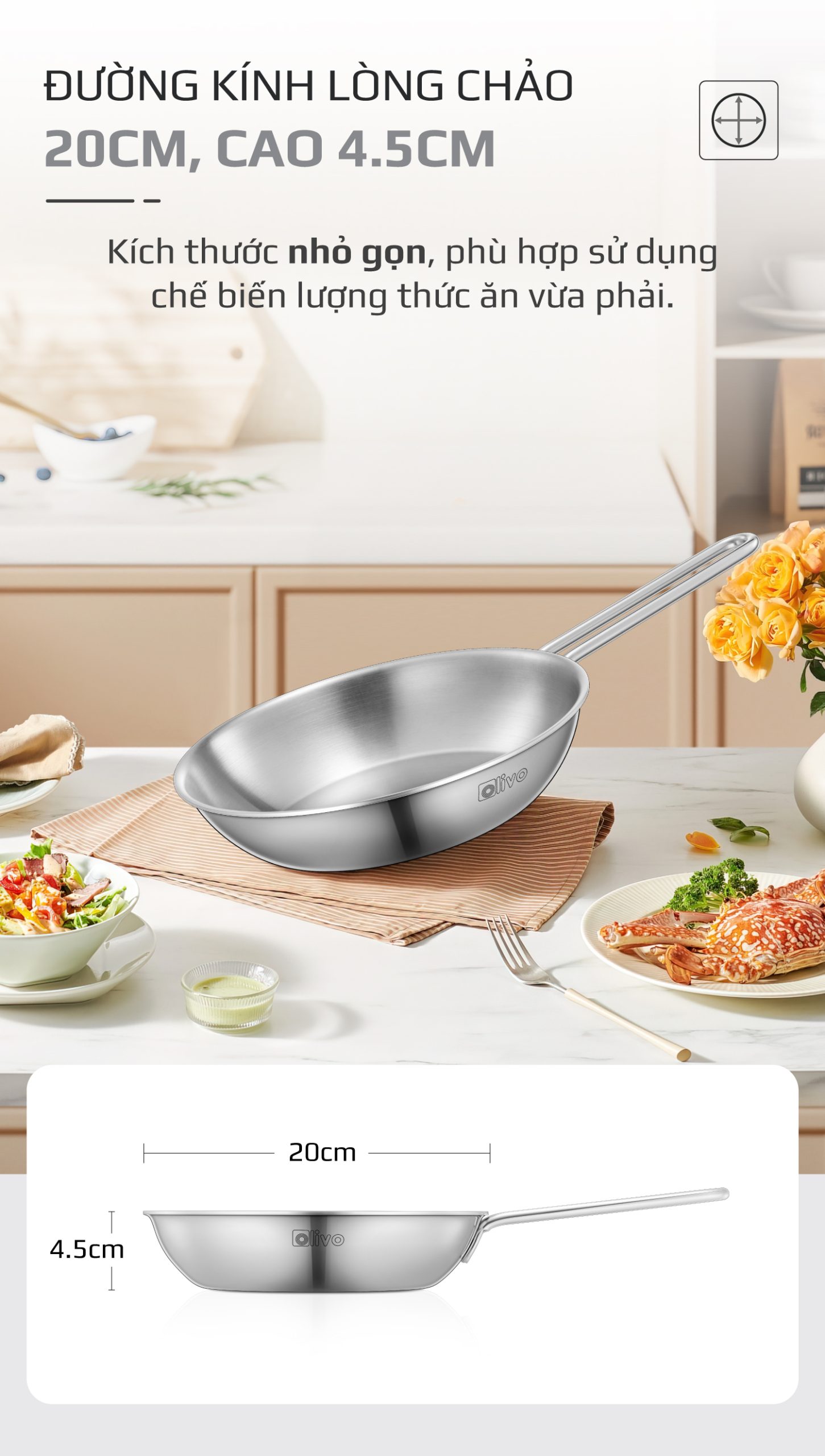CHẢO INOX OLIVO P2045 – Chống Dính Tự Nhiên, Đáy 3 Lớp, Đường Kính 20cm, Sâu Lòng 4.5cm, Nấu Được Trên Mọi Loại Bếp