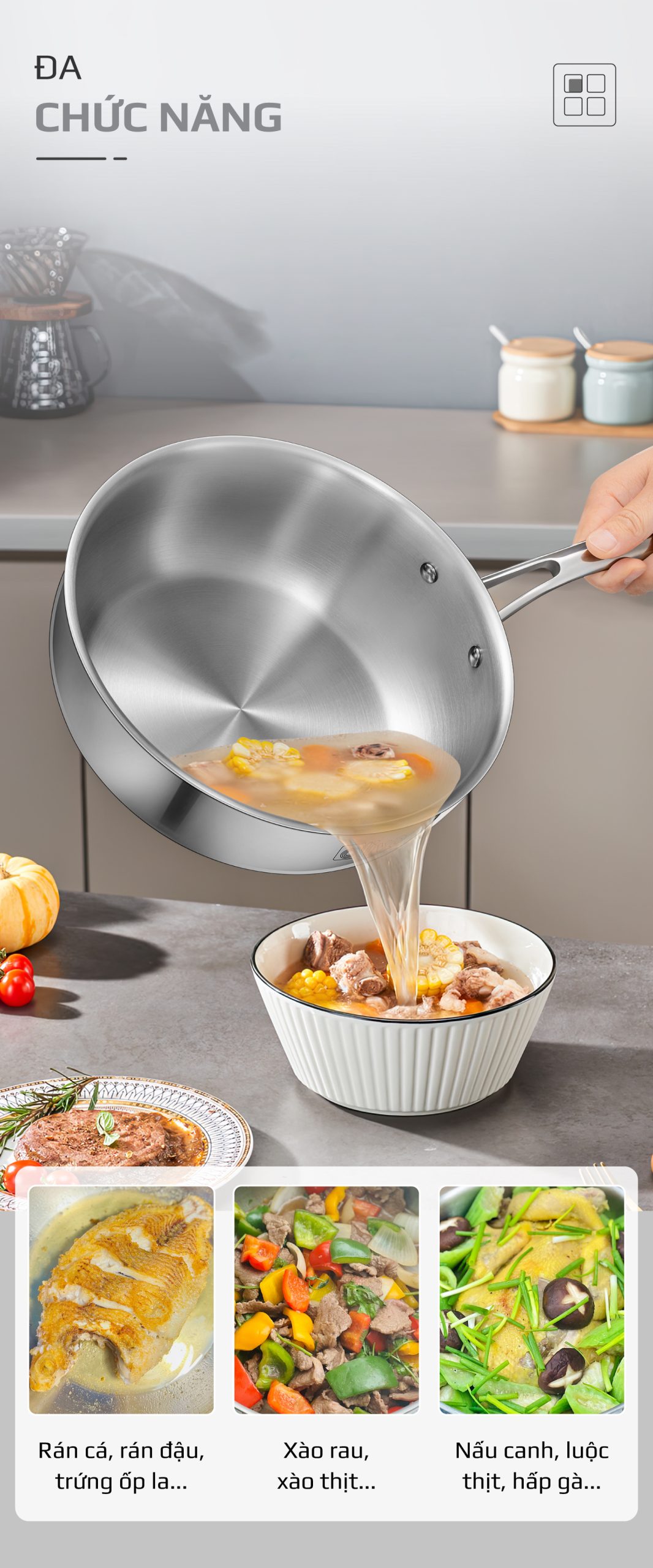 3. CHẢO INOX NGUYÊN KHỐI 4 LỚP