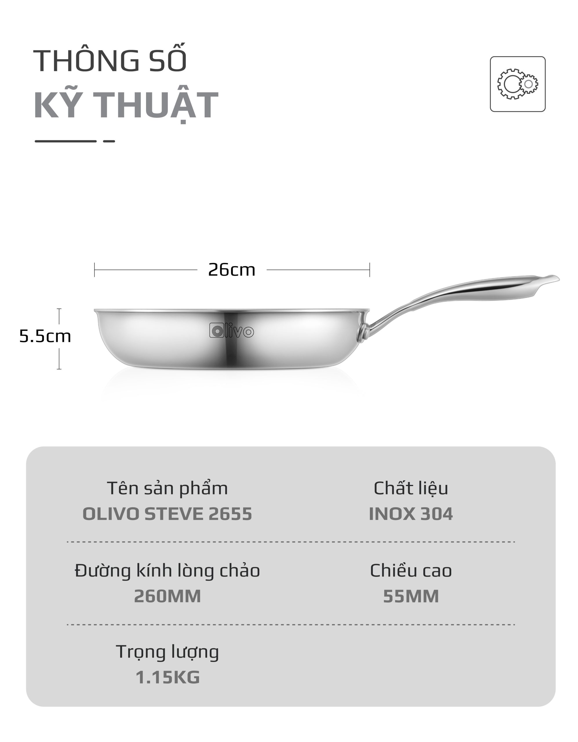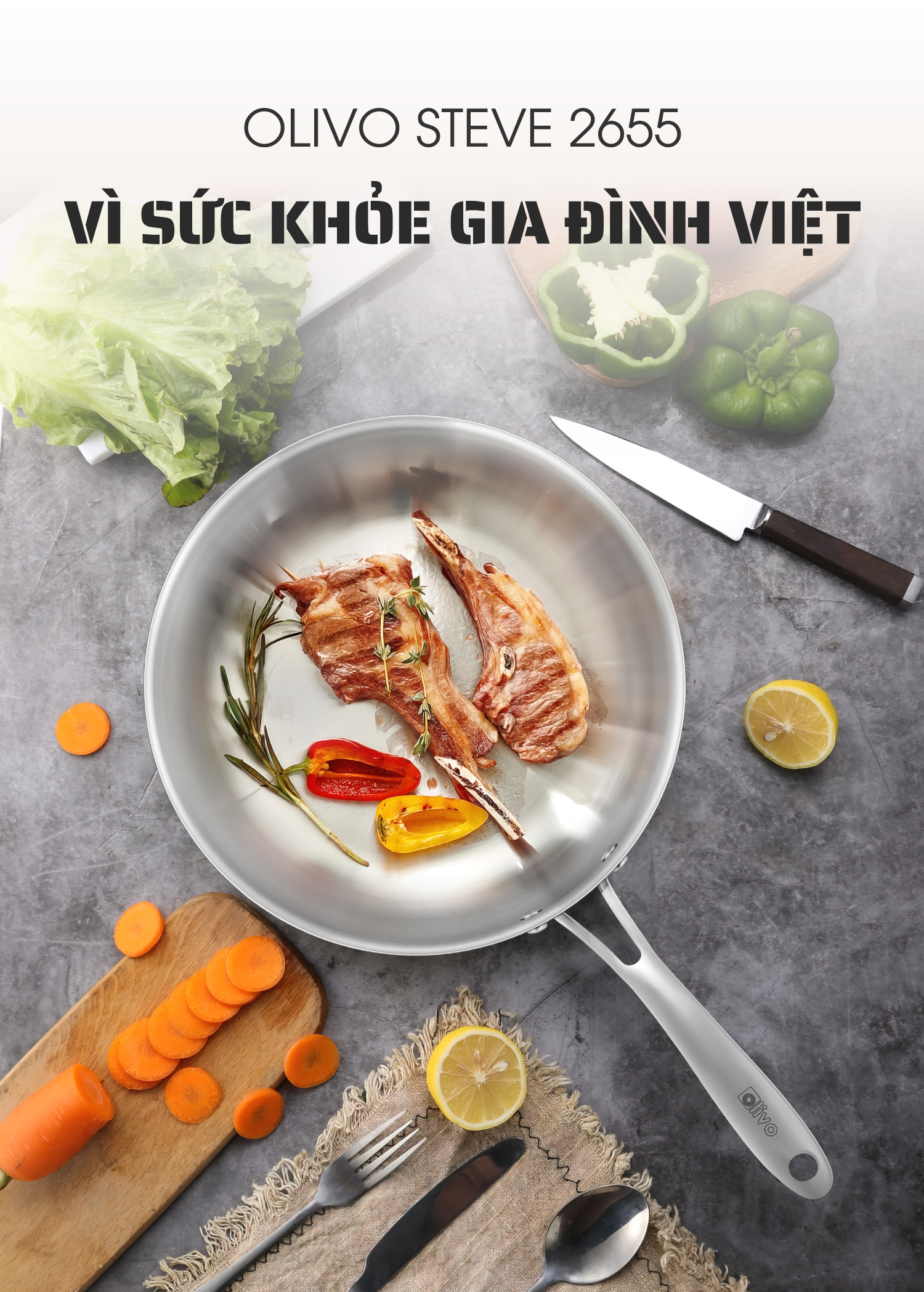 CHẢO INOX OLIVO STEVE 2655 – Chống Dính Tự Nhiên, An Toàn Cho Sức Khỏe, Đường Kính 26cm, Sâu 5.5cm, Nấu Được Trên Mọi Loại Bếp