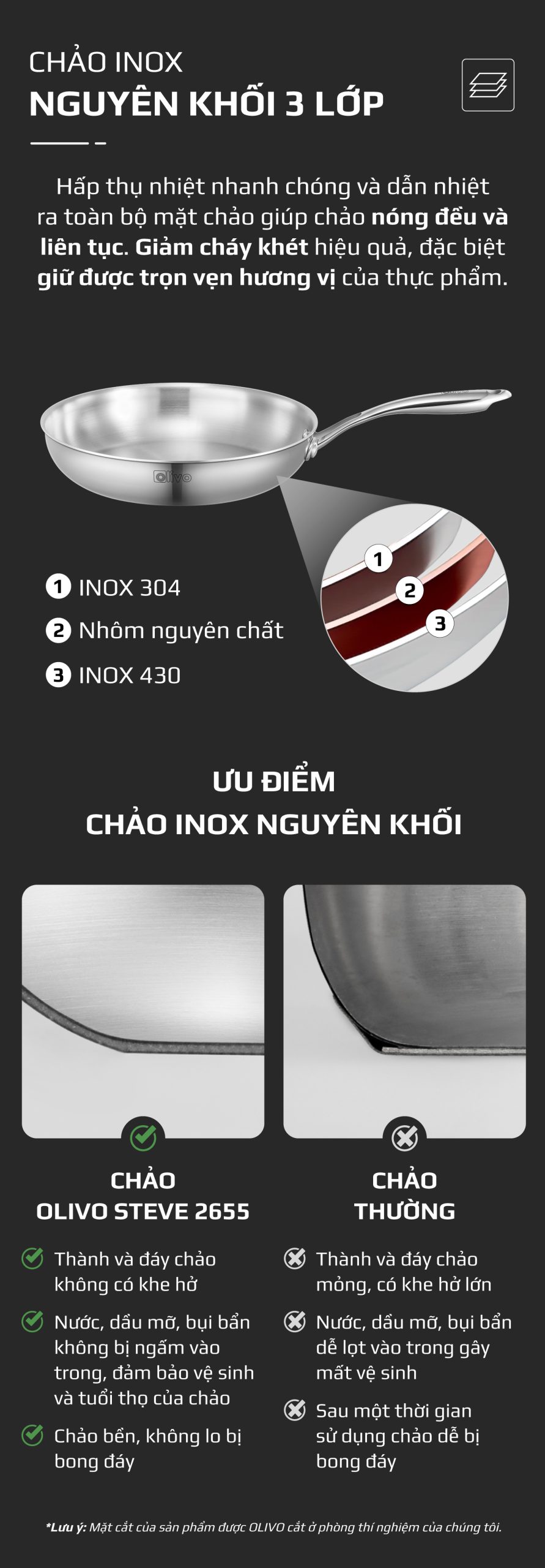 ƯU ĐIỂM VƯỢT TRỘI CỦA SẢN PHẨM CHẢO INOX OLIVO STEVE 2655