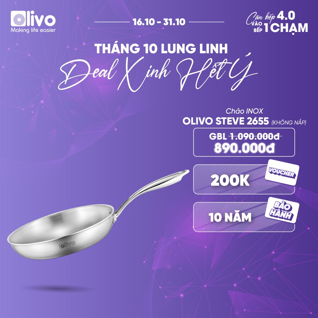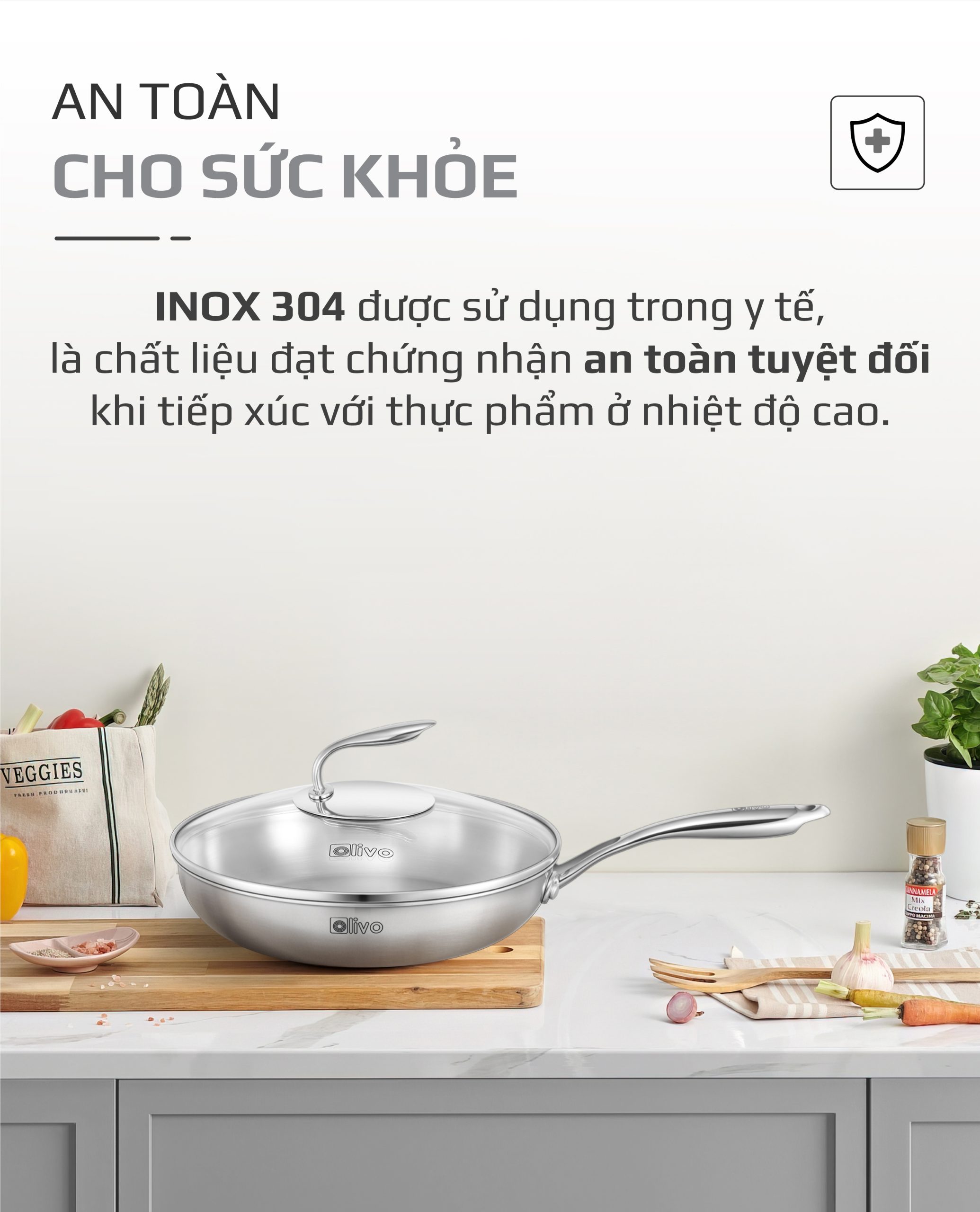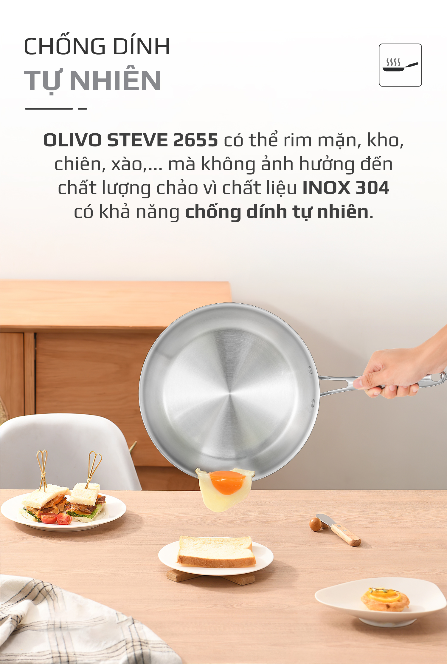 • OLIVO STEVE 2655 có thể rim mặn, kho, chiên, xào,… mà không ảnh hưởng đến chất lượng chảo vì chất liệu INOX 304 có khả năng chống dính tự nhiên.