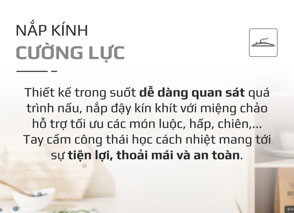 • Thiết kế trong suốt dễ dàng quan sát được quá trình nấu, nắp đậy kín khít với miệng chảo hỗ trợ tối ưu các món luộc, hấp, chiên,… Tay cầm công thái học cách nhiệt mang tới sự tiện lợi, thoải mái và an toàn cho người dùng.