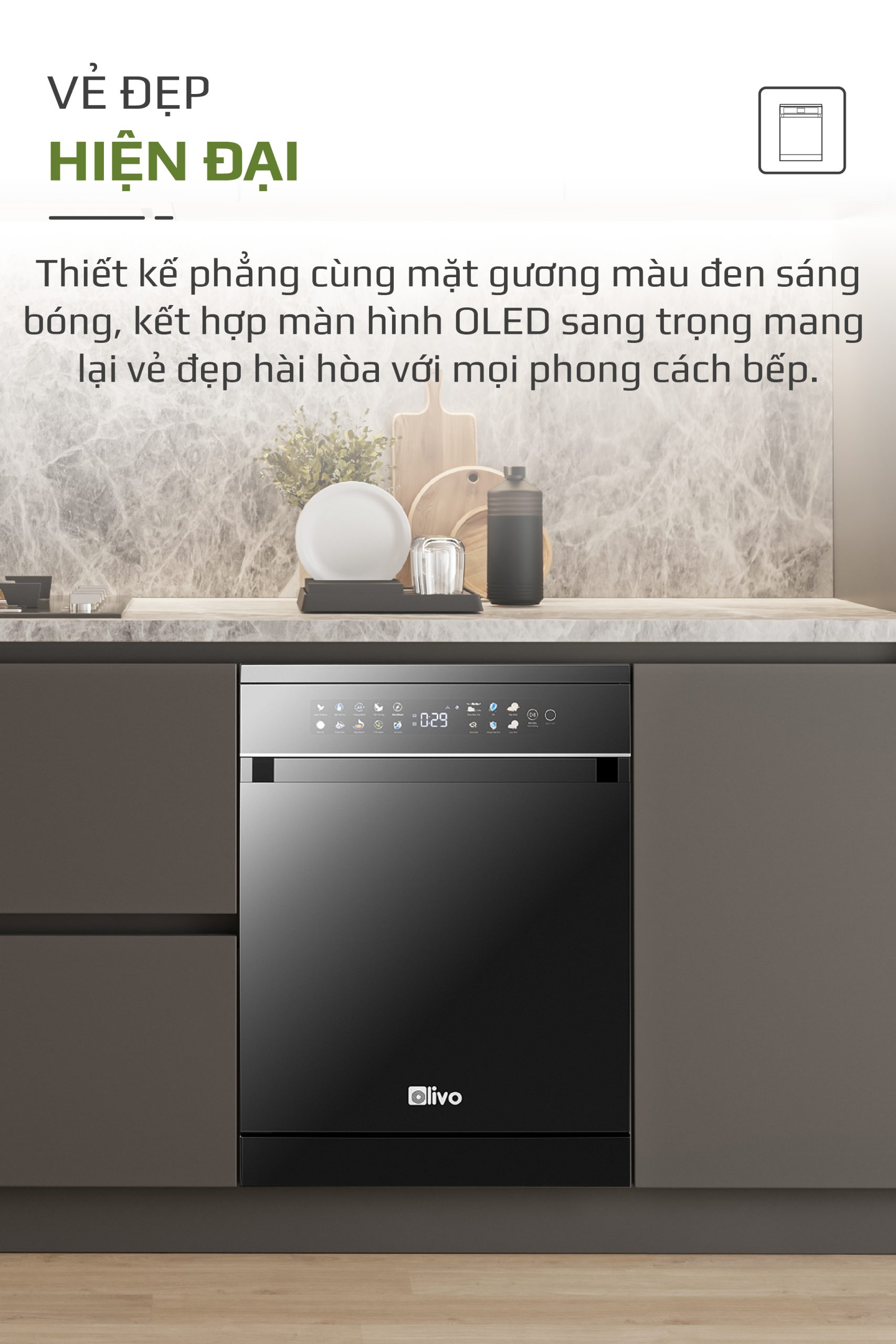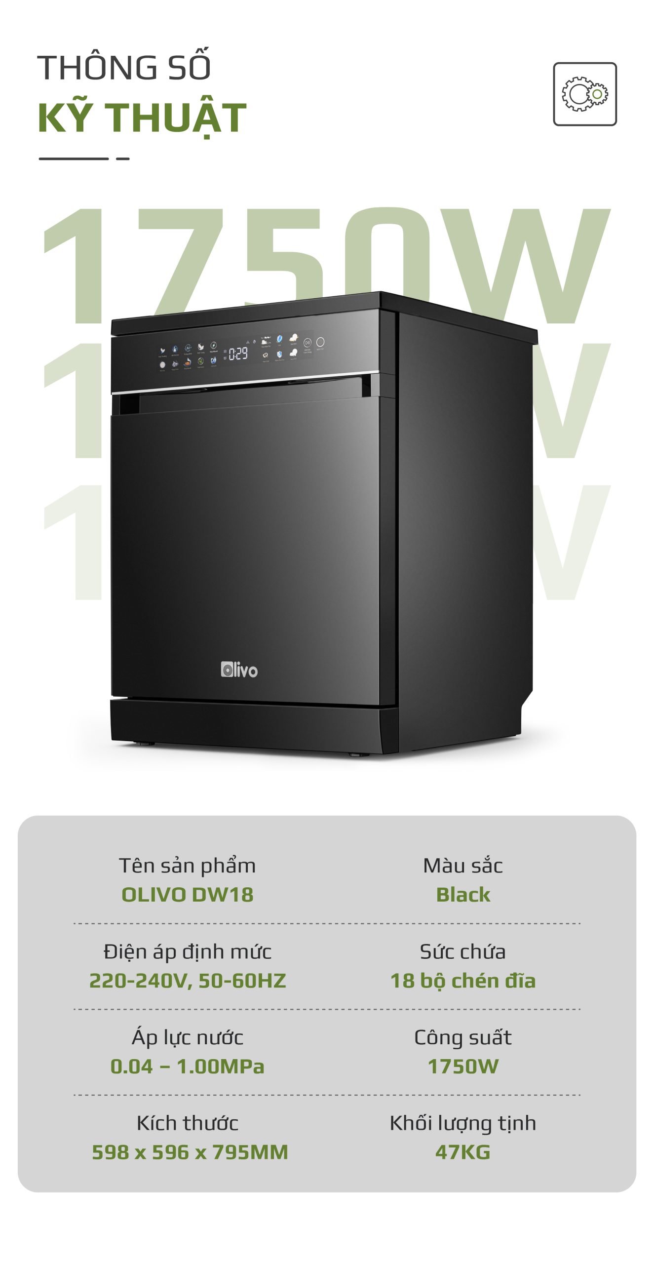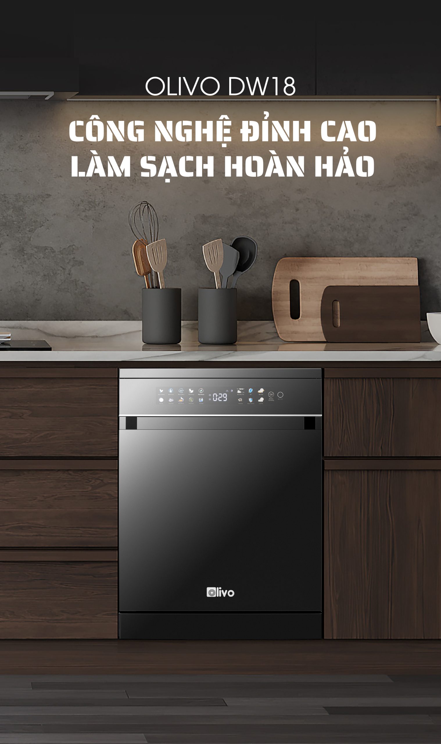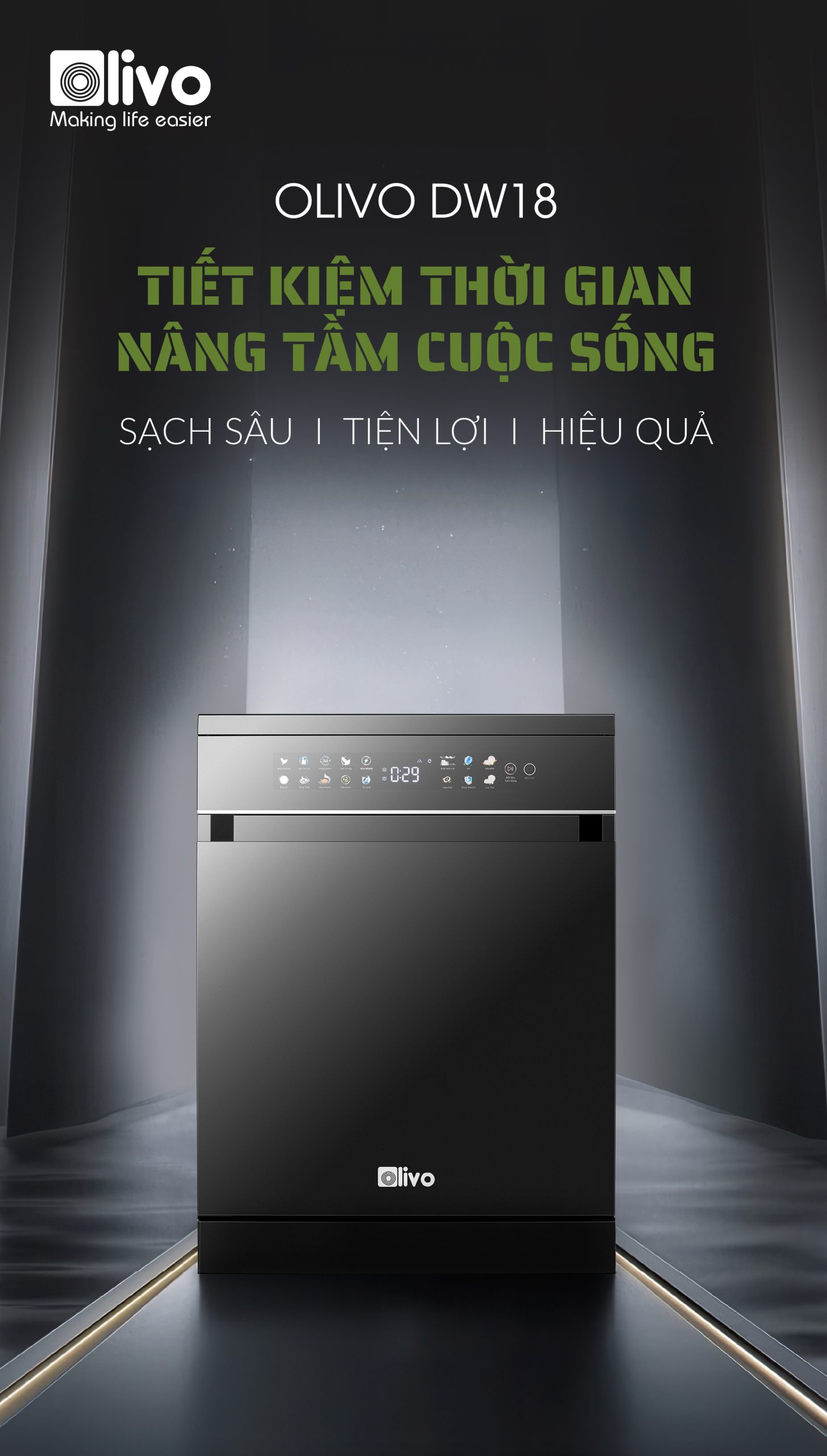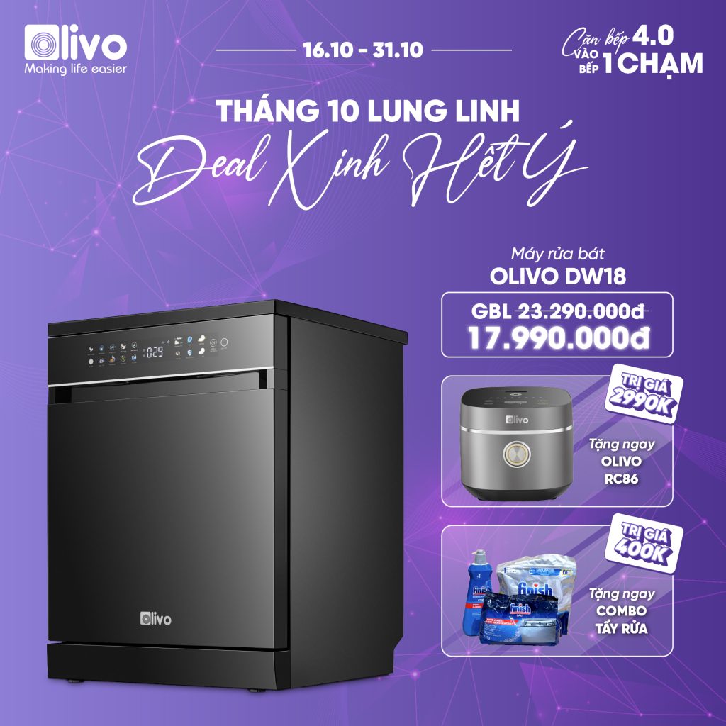 - Hiểu rõ nhu cầu và mong muốn ngày càng cao của người tiêu dùng hiện đại, đội ngũ phát triển sản phẩm của OLIVO đã dày công nghiên cứu và cho ra đời máy rửa bát OLIVO DW18 sản phẩm kết tinh từ khát vọng nâng tầm trải nghiệm sống tiện nghi. Không chỉ là một thiết bị gia dụng, máy rửa bát OLIVO DW18 còn là biểu tượng của sự hiện đại trong căn bếp, nơi công nghệ và thẩm mỹ giao thoa. Với thiết kế màu đen sang trọng, động cơ DC vận hành êm ái và tích hợp những công nghệ tiên tiến như sấy khô EcoDry, diệt khuẩn bằng tia UV, Công nghệ rửa Hydro360 Wash thông minh… sản phẩm mang đến giải pháp rửa bát sạch khuẩn, tiết kiệm thời gian và chăm sóc sức khỏe gia đình một cách toàn diện.