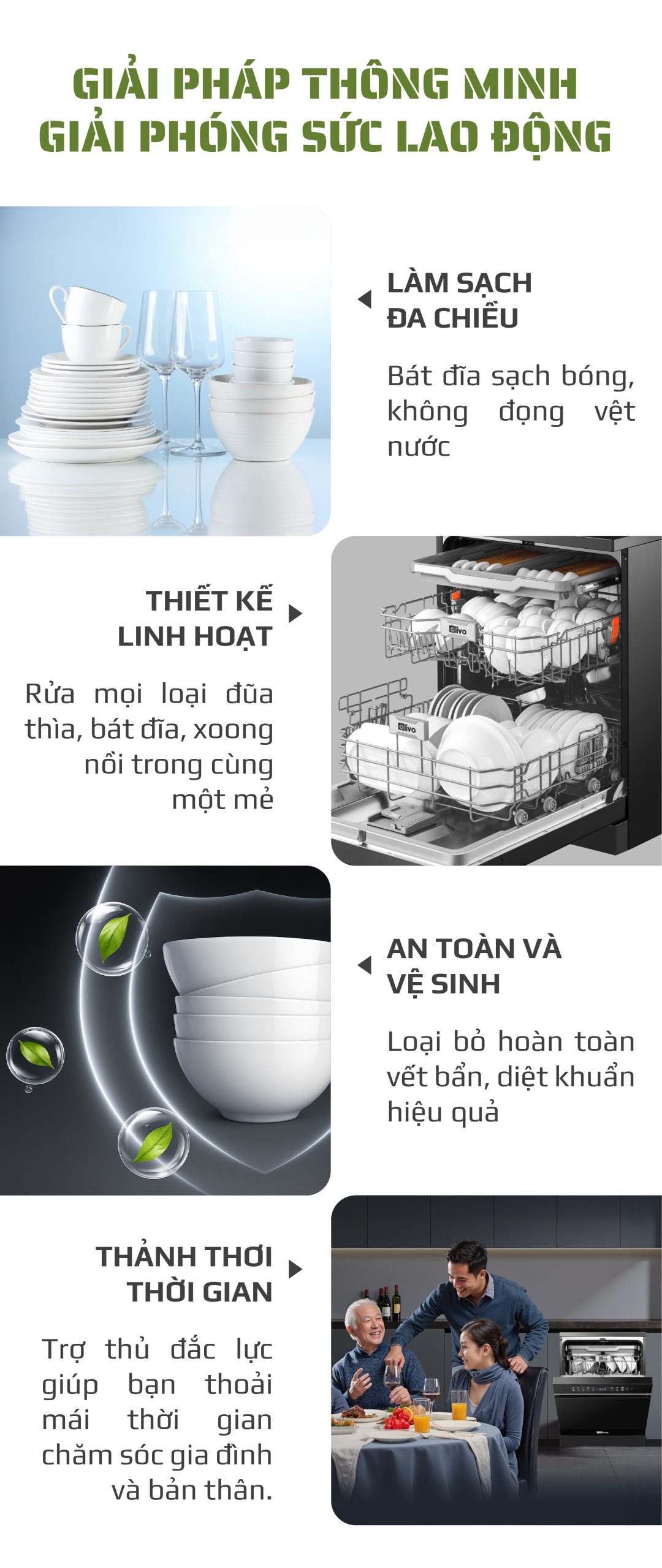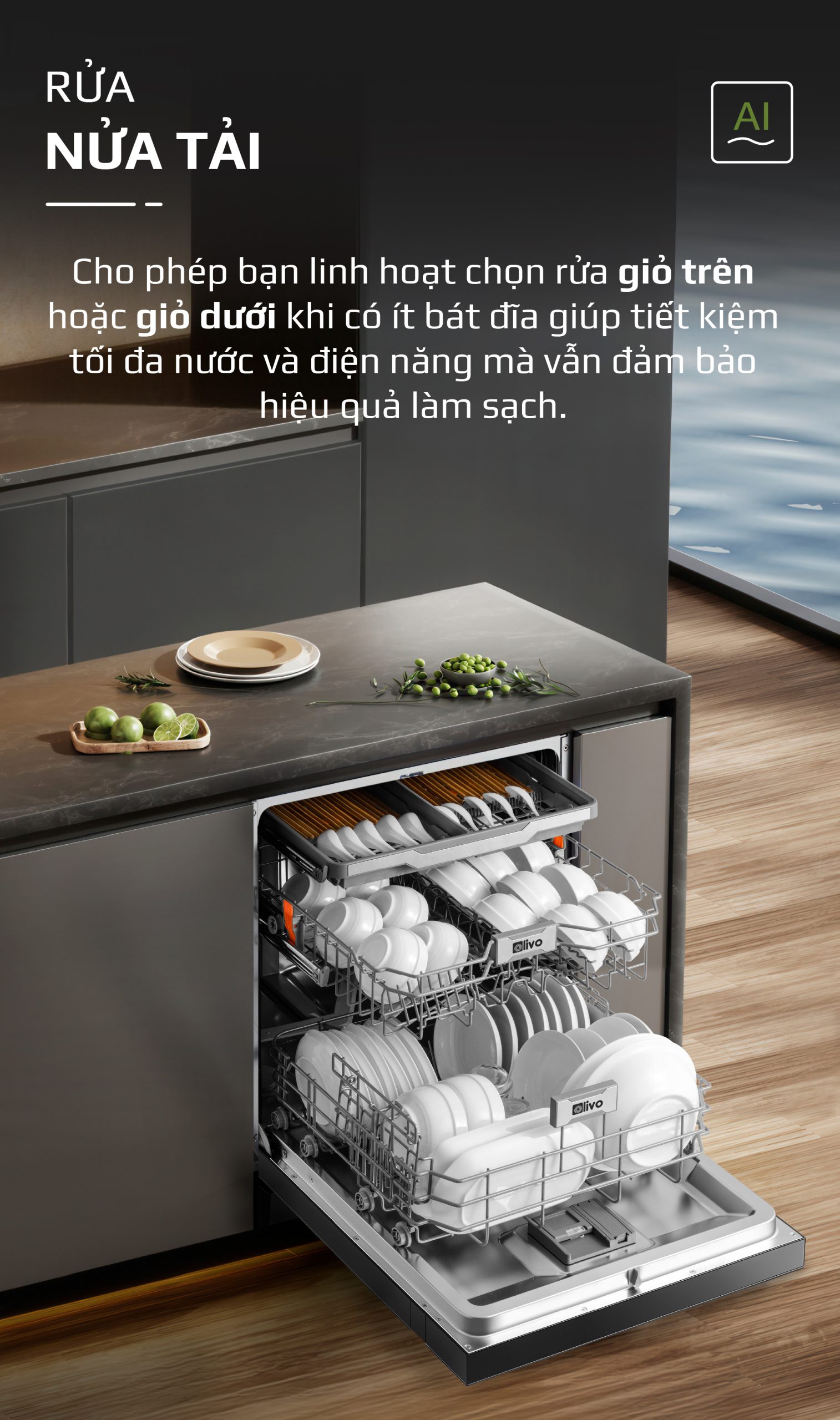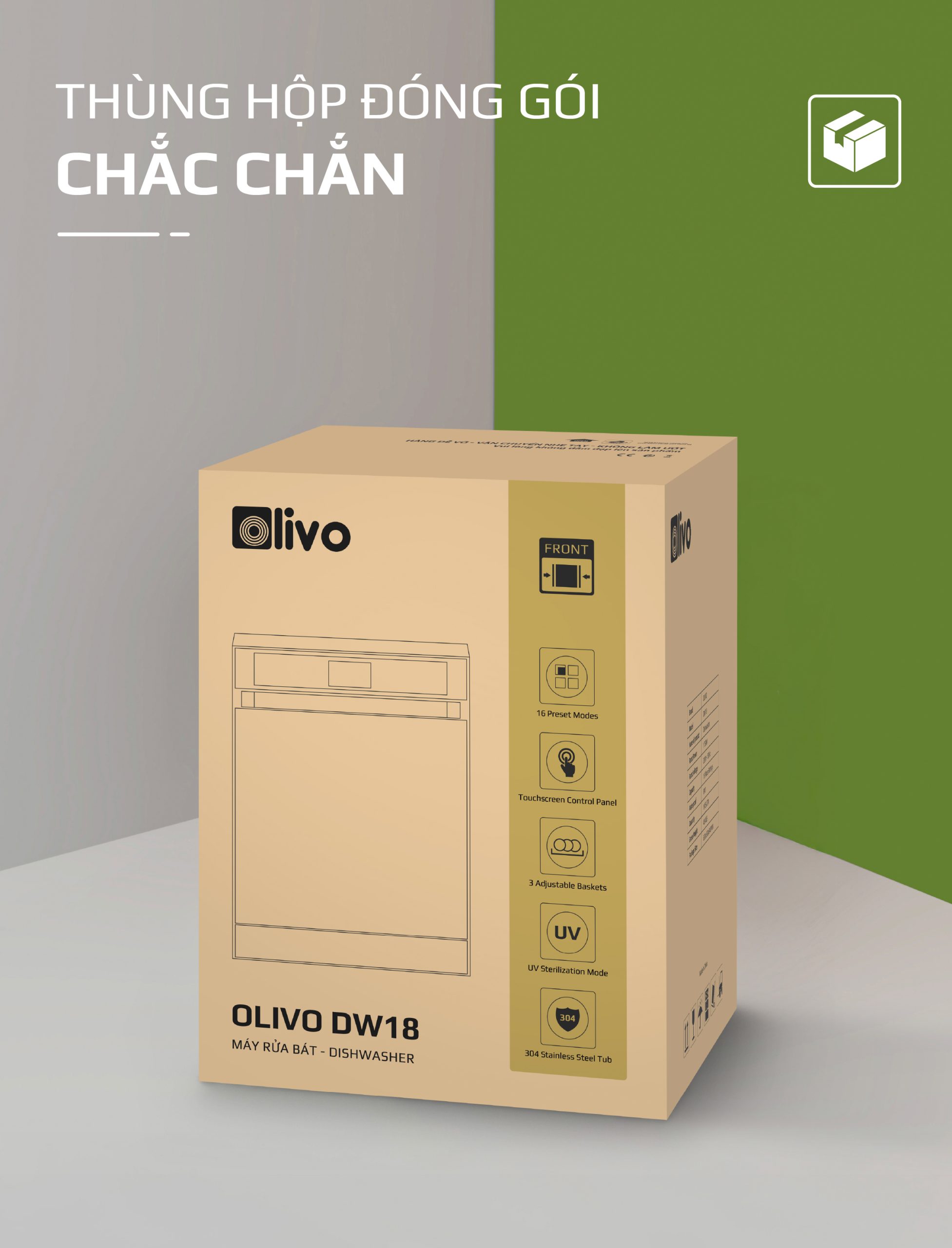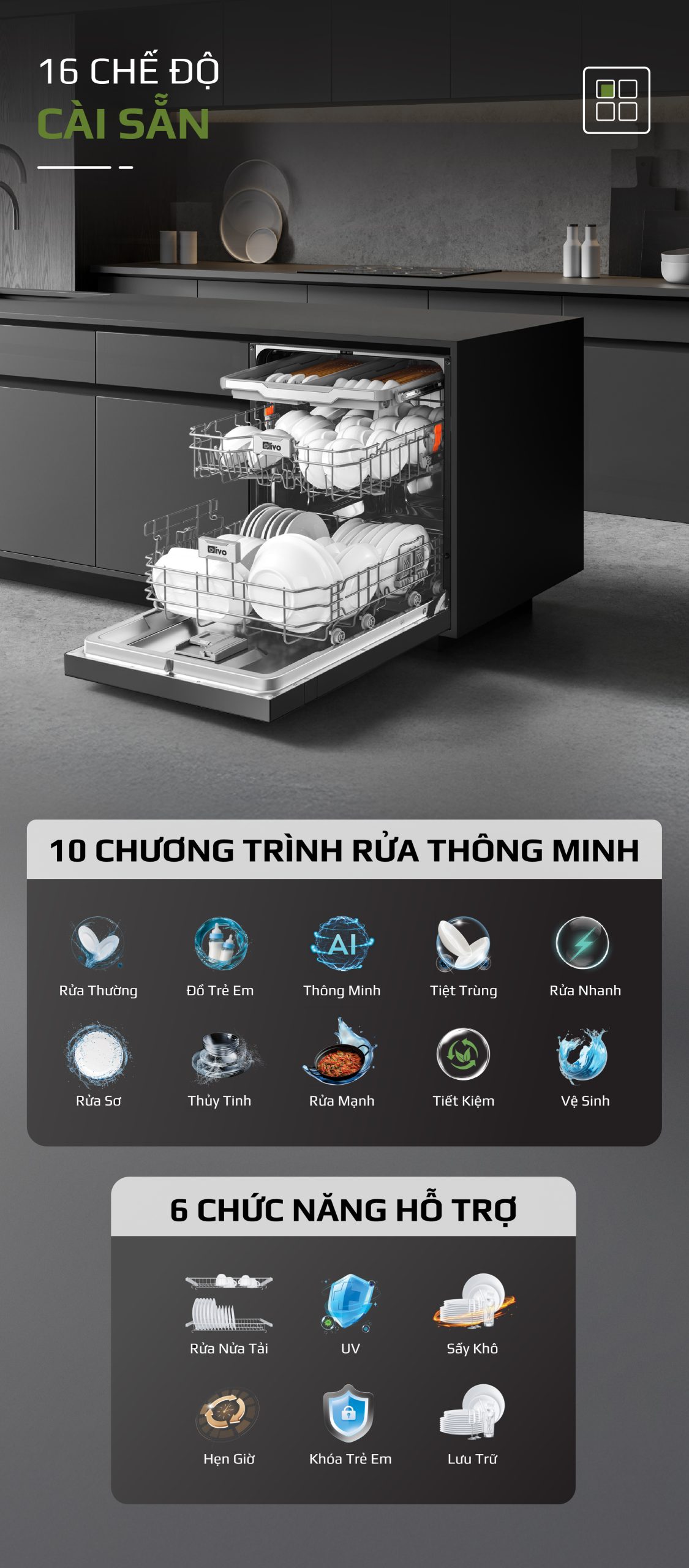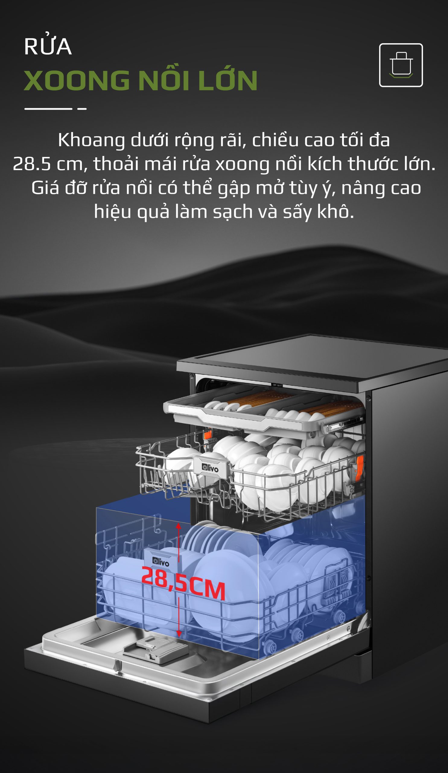 - Hiểu rõ nhu cầu và mong muốn ngày càng cao của người tiêu dùng hiện đại, đội ngũ phát triển sản phẩm của OLIVO đã dày công nghiên cứu và cho ra đời máy rửa bát OLIVO DW18 sản phẩm kết tinh từ khát vọng nâng tầm trải nghiệm sống tiện nghi. Không chỉ là một thiết bị gia dụng, máy rửa bát OLIVO DW18 còn là biểu tượng của sự hiện đại trong căn bếp, nơi công nghệ và thẩm mỹ giao thoa. Với thiết kế màu đen sang trọng, động cơ DC vận hành êm ái và tích hợp những công nghệ tiên tiến như sấy khô EcoDry, diệt khuẩn bằng tia UV, Công nghệ rửa Hydro360 Wash thông minh… sản phẩm mang đến giải pháp rửa bát sạch khuẩn, tiết kiệm thời gian và chăm sóc sức khỏe gia đình một cách toàn diện.