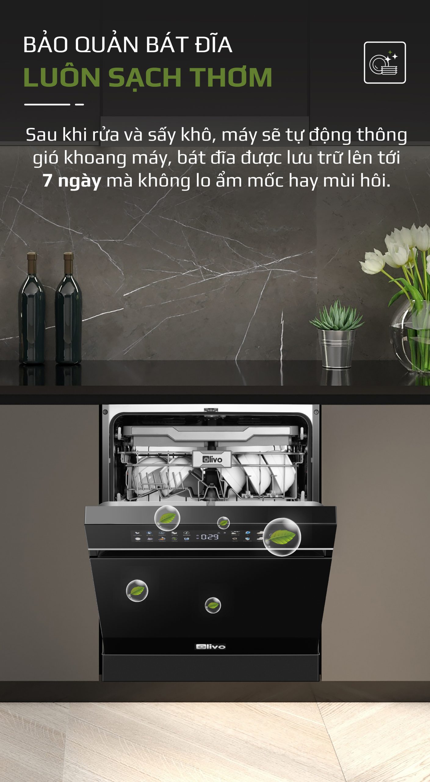 - Sau khi hoàn tất chu trình rửa và sấy, máy sẽ tự động kích hoạt chế độ “Lưu Trữ” thông gió khoang máy, đảm bảo không khí bên trong luôn khô thoáng. Nhờ đó, bát đĩa có thể được lưu trữ trực tiếp trong máy lên đến 7 ngày mà không lo ẩm mốc, mùi hôi hay vi khuẩn phát sinh.