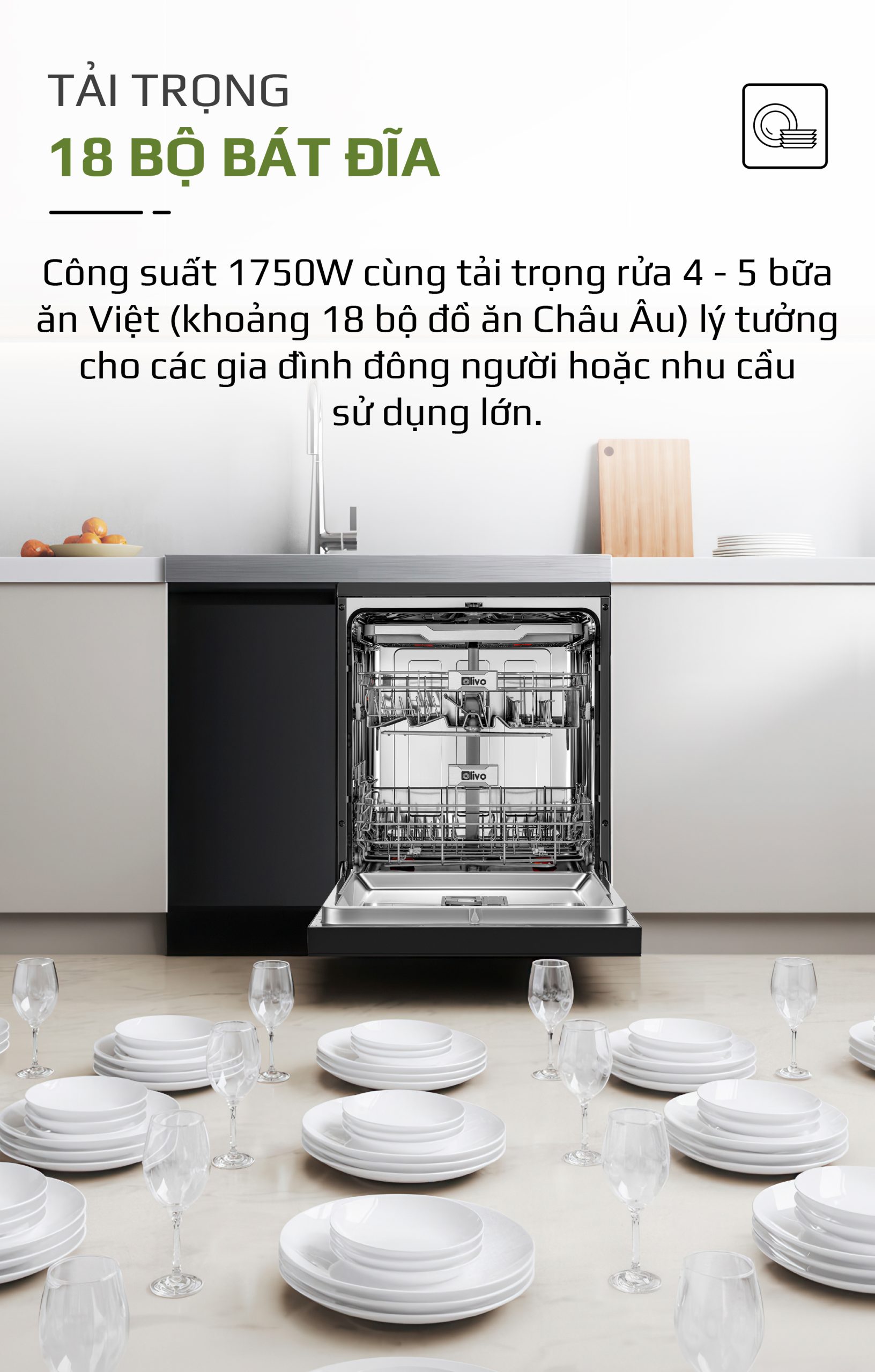 - Với tải trọng lên đến 18 bộ bát đĩa châu Âu, tương đương 4–5 bữa ăn Việt, máy rửa bát OLIVO DW18 giúp bạn rửa sạch một lần, tiết kiệm thời gian, công sức và điện nước. Lựa chọn lý tưởng cho gia đình đông thành viên hoặc thường xuyên nấu nướng.