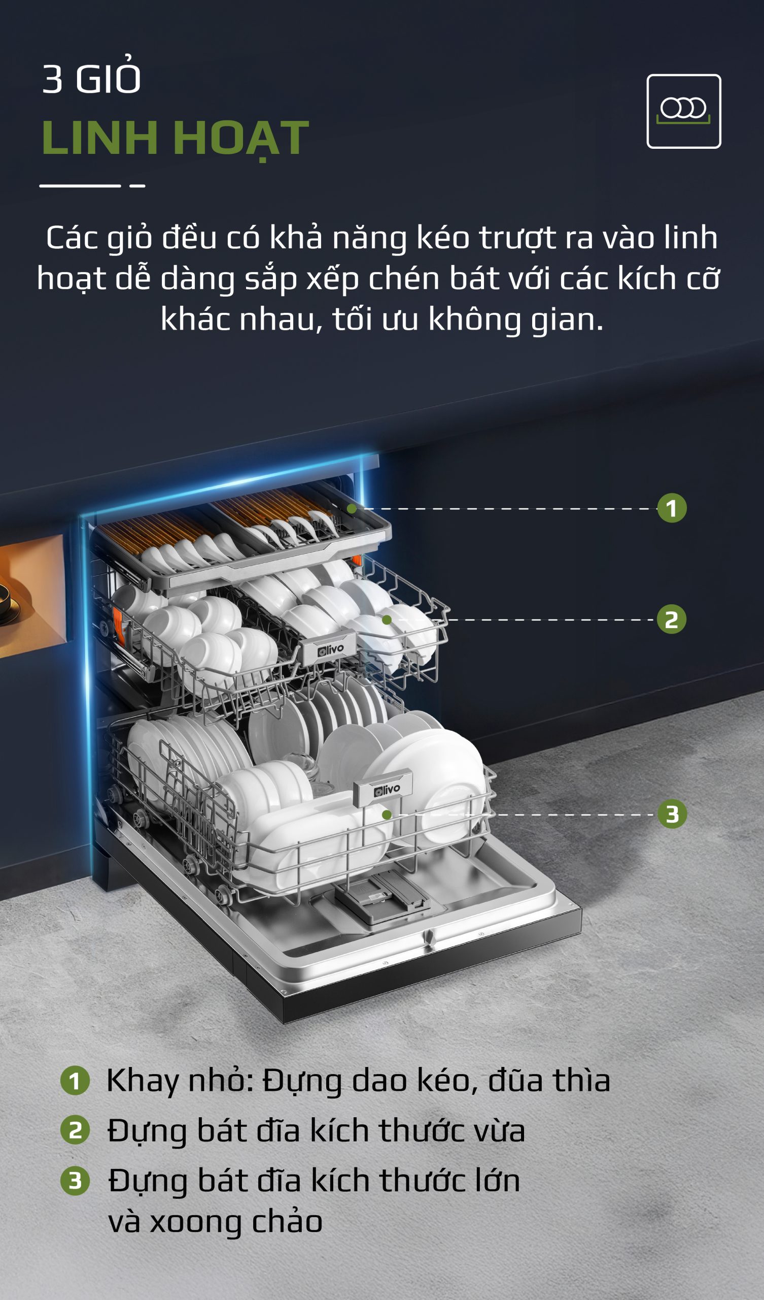 - Máy rửa bát OLIVO DW18 được thiết kế tối ưu với 3 giỏ chứa linh hoạt, giúp tận dụng tối đa không gian bên trong và sắp xếp bát đĩa gọn gàng, khoa học. Khay nhỏ trên cùng chuyên dụng để đựng thìa, đũa, muỗng, nĩa…, đảm bảo an toàn cho các vật dụng nhỏ, sắc nhọn. Giỏ trên phù hợp cho bát đĩa nhỏ, ly cốc. Không gian giỏ dưới rộng rãi, được thiết kế để chứa nồi, chảo và bát đĩa kích thước lớn, rất tiện lợi cho các bữa ăn gia đình Việt.