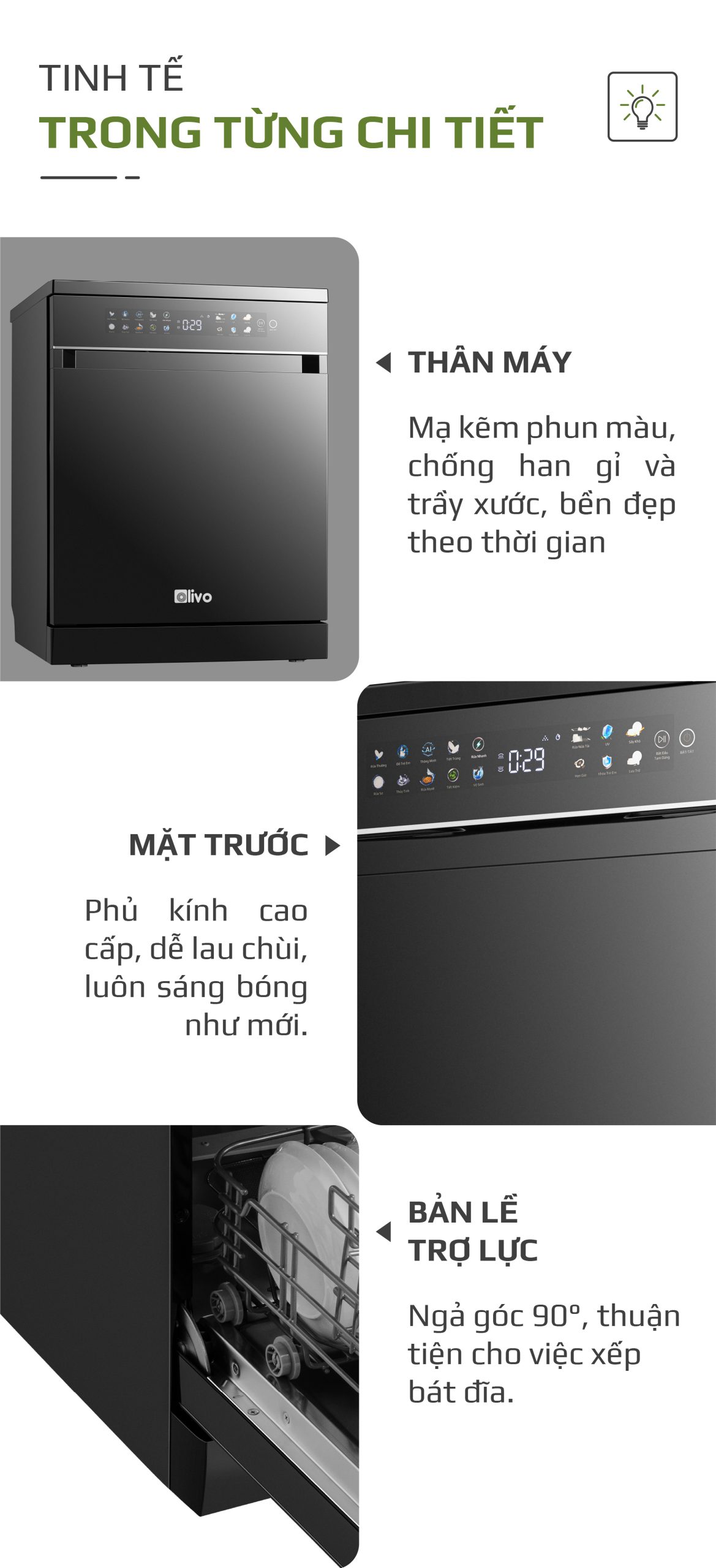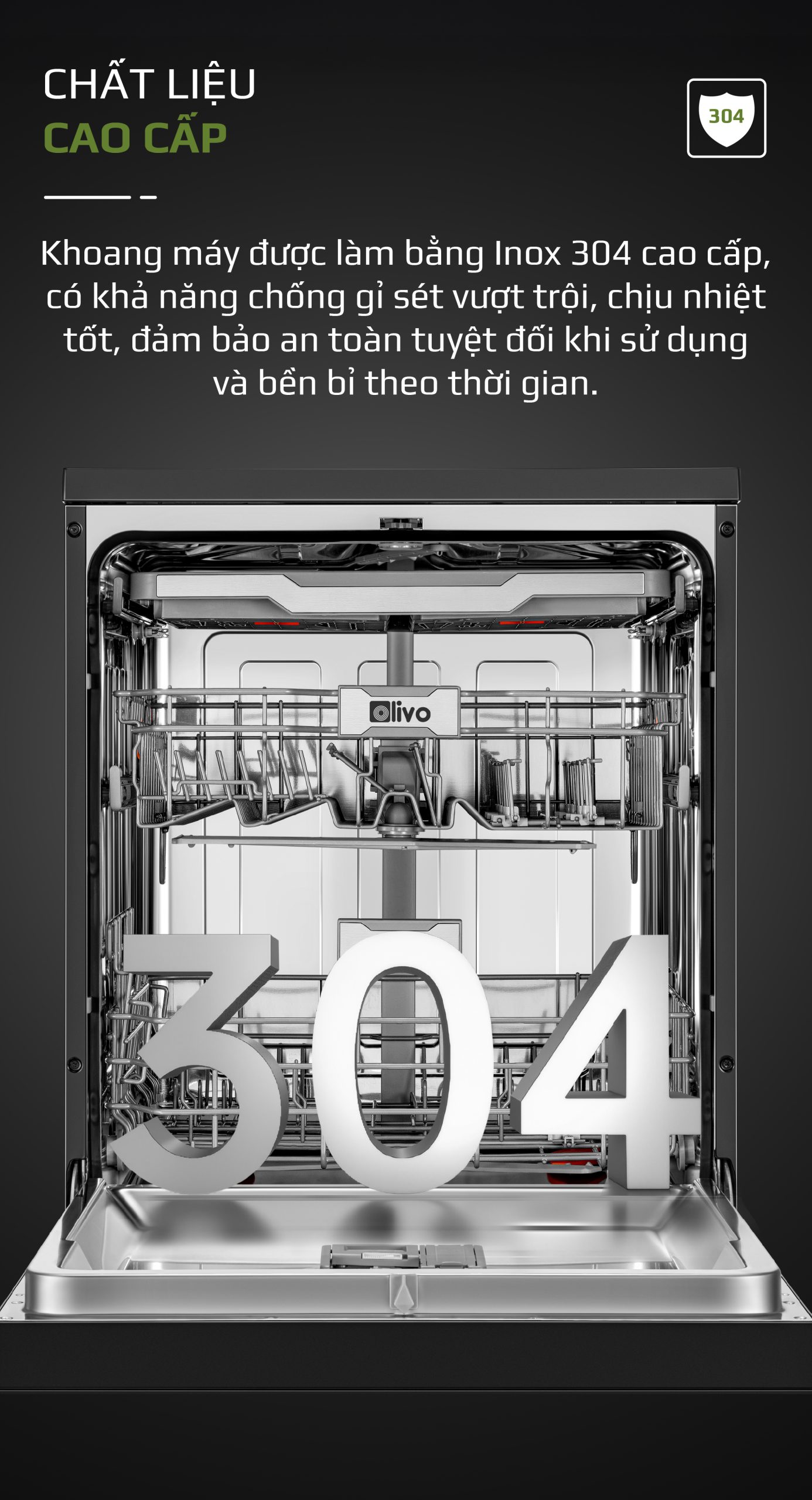 - Khoang máy Inox 304 chính là cam kết của OLIVO về chất lượng bền vững và trải nghiệm sử dụng lâu dài, an tâm cho mọi gia đình.