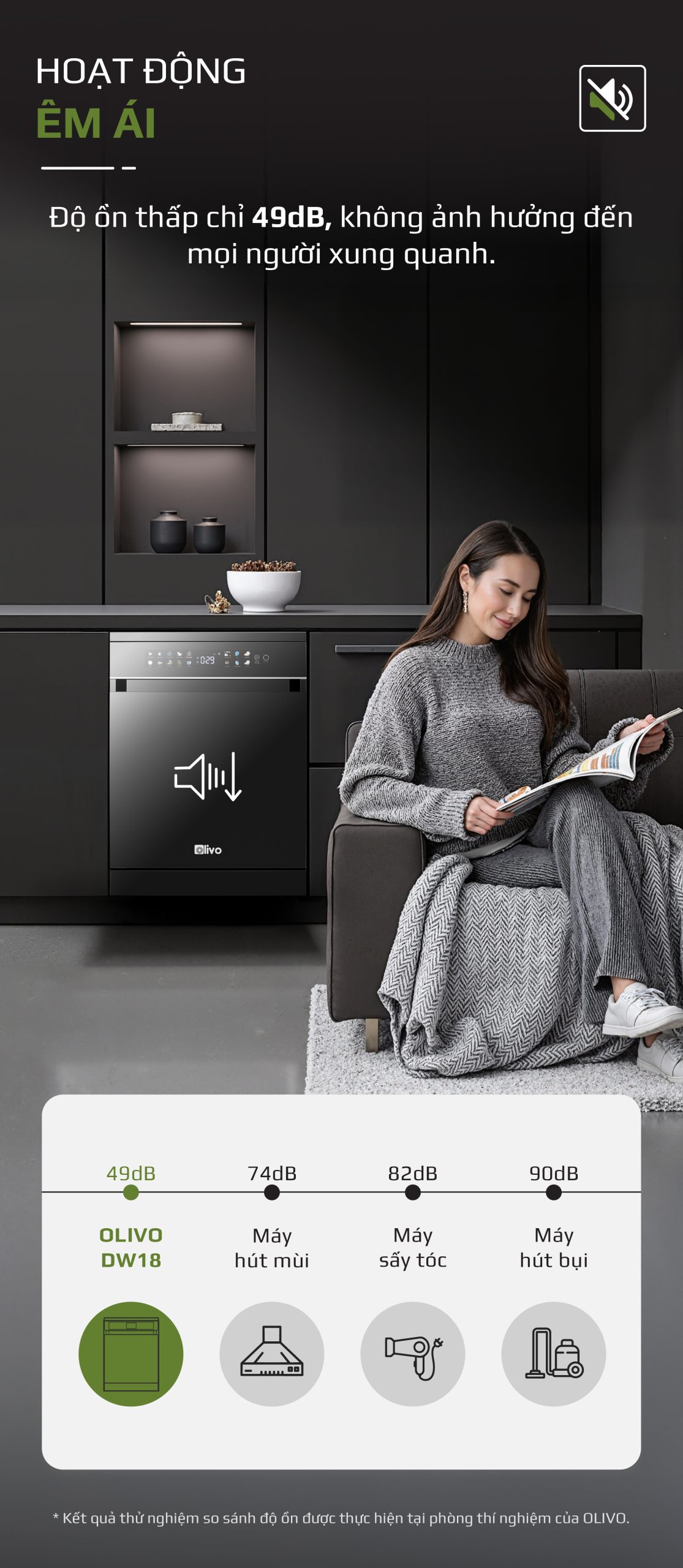 - Dù hoạt động vào ban đêm hay trong không gian bếp mở, OLIVO DW18 vẫn đảm bảo sự yên tĩnh, dễ chịu, không làm ảnh hưởng đến sinh hoạt của cả gia đình.