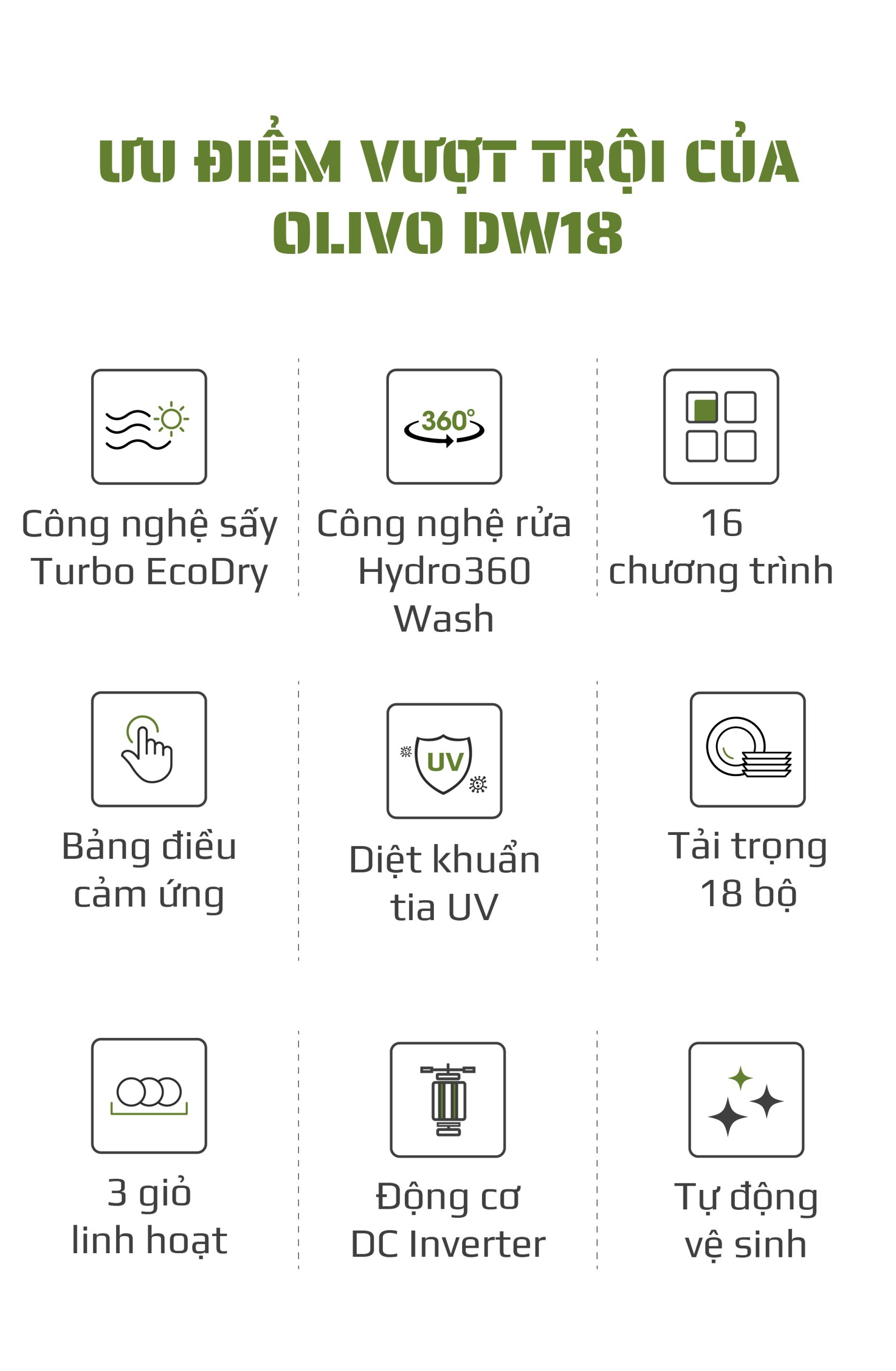 - Công nghệ HYDRO360 WASH chính là yếu tố tạo nên sự khác biệt của OLIVO DW18, giúp tối ưu khả năng làm sạch và mang lại sự an tâm tuyệt đối cho người sử dụng.