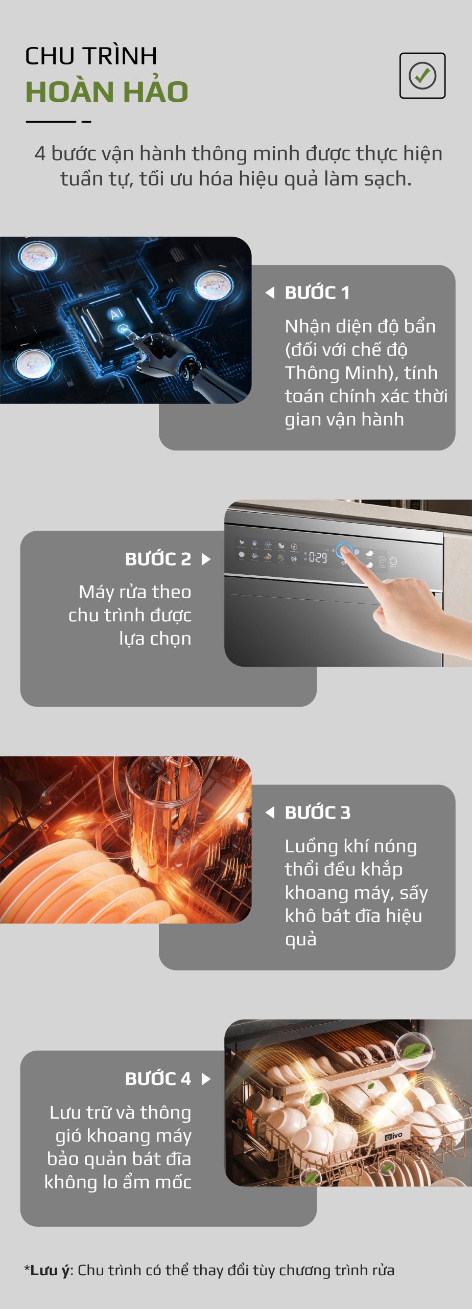 - Chế độ này không chỉ đảm bảo vệ sinh an toàn cho bát đĩa trong mỗi lần rửa, mà còn giúp duy trì hiệu suất hoạt động ổn định, kéo dài tuổi thọ cho thiết bị và giảm thiểu mùi khó chịu bên trong khoang máy.