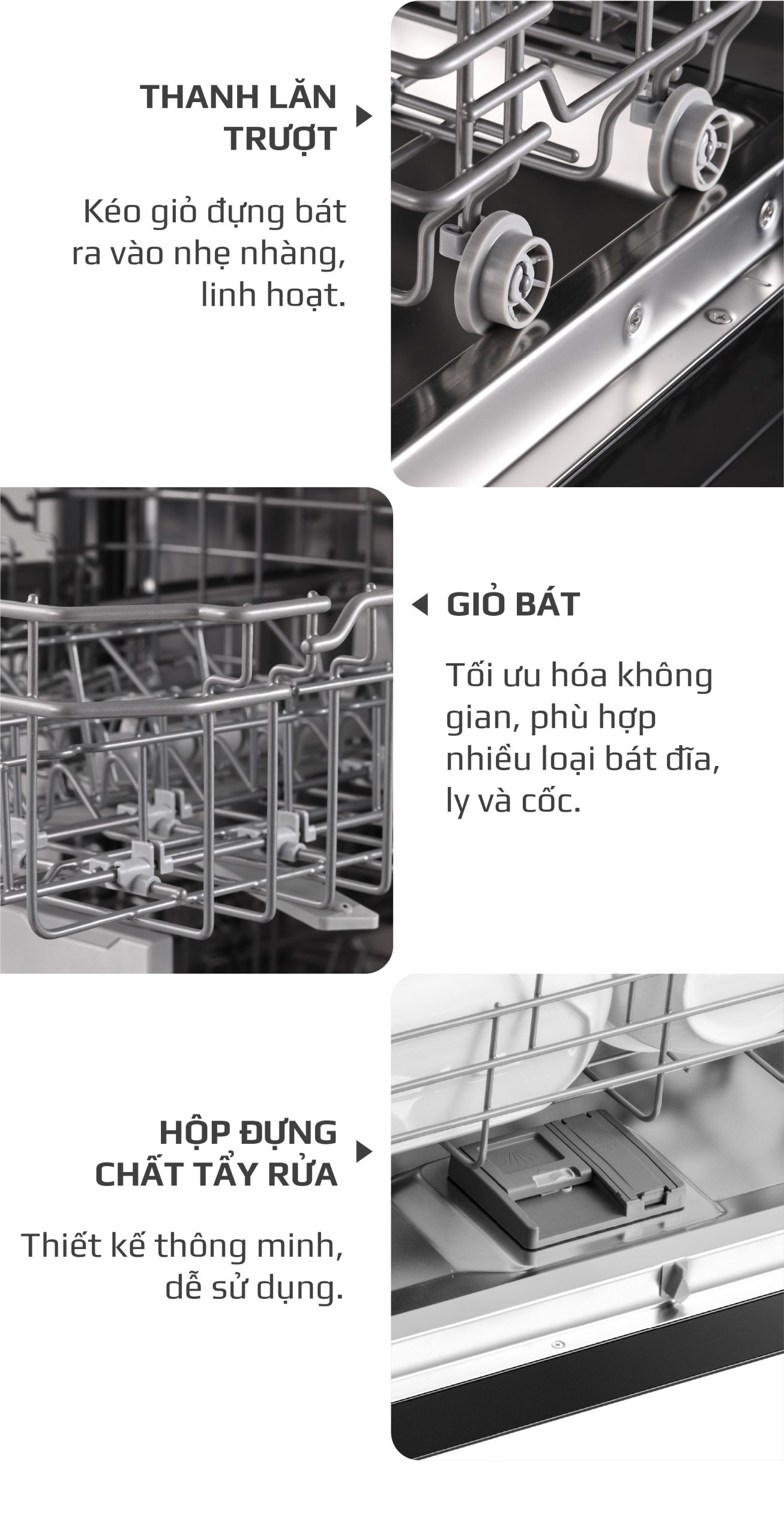 - 3 giỏ linh hoạt, tải trọng 18 bộ bát đĩa