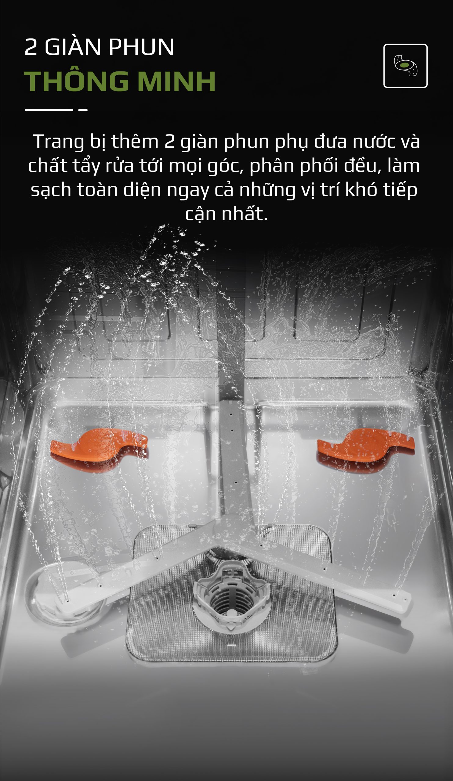 - Thiết kế phun thông minh, làm sạch đến từng chi tiết: Hệ thống vòi phun được bố trí theo nguyên lý luân chuyển xoáy nước, giúp các tia nước len lỏi sâu vào mọi góc khuất, kể cả những khu vực khó tiếp cận như đáy bát, khe ly hay viền nắp hộp. Nhờ đó, bát đĩa không chỉ sạch bề mặt mà còn được làm sạch kỹ lưỡng và đồng đều trong toàn bộ khoang máy.
