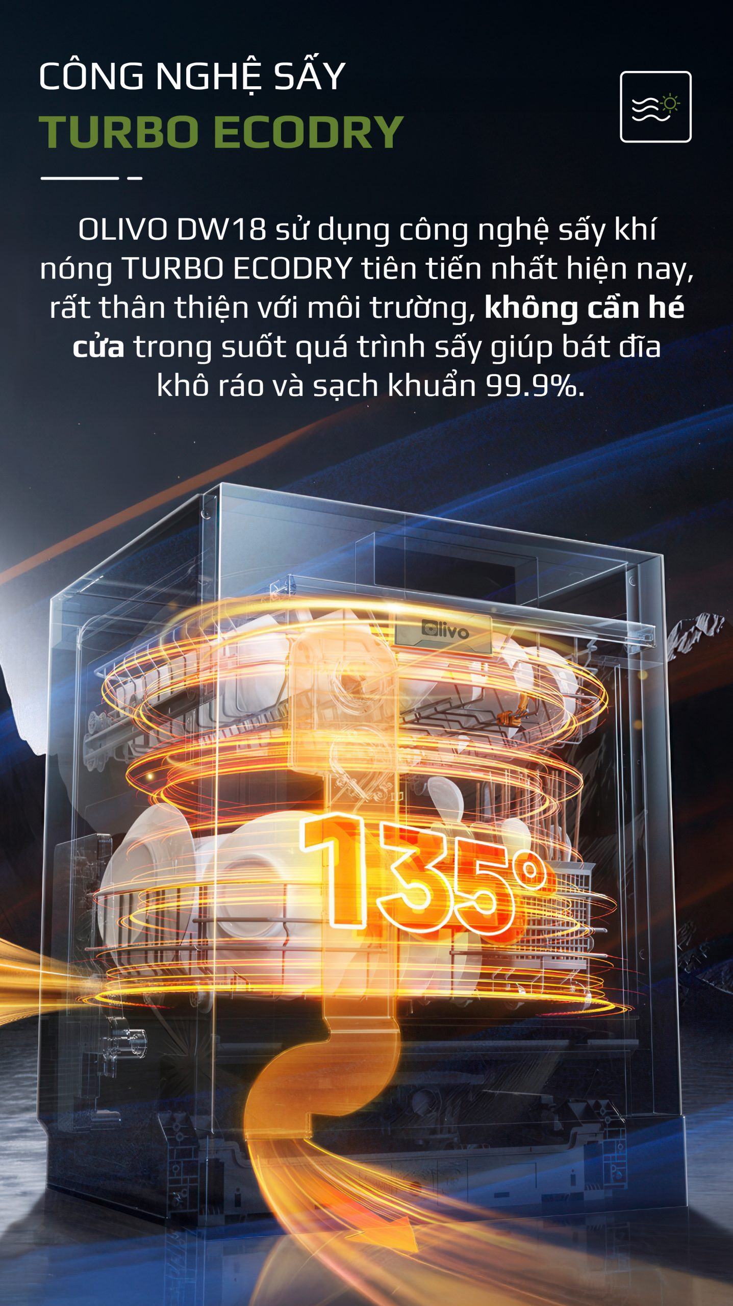 Ưu điểm nổi bật của công nghệ sấy Turbo EcoDry trên máy rửa bát OLIVO DW18: