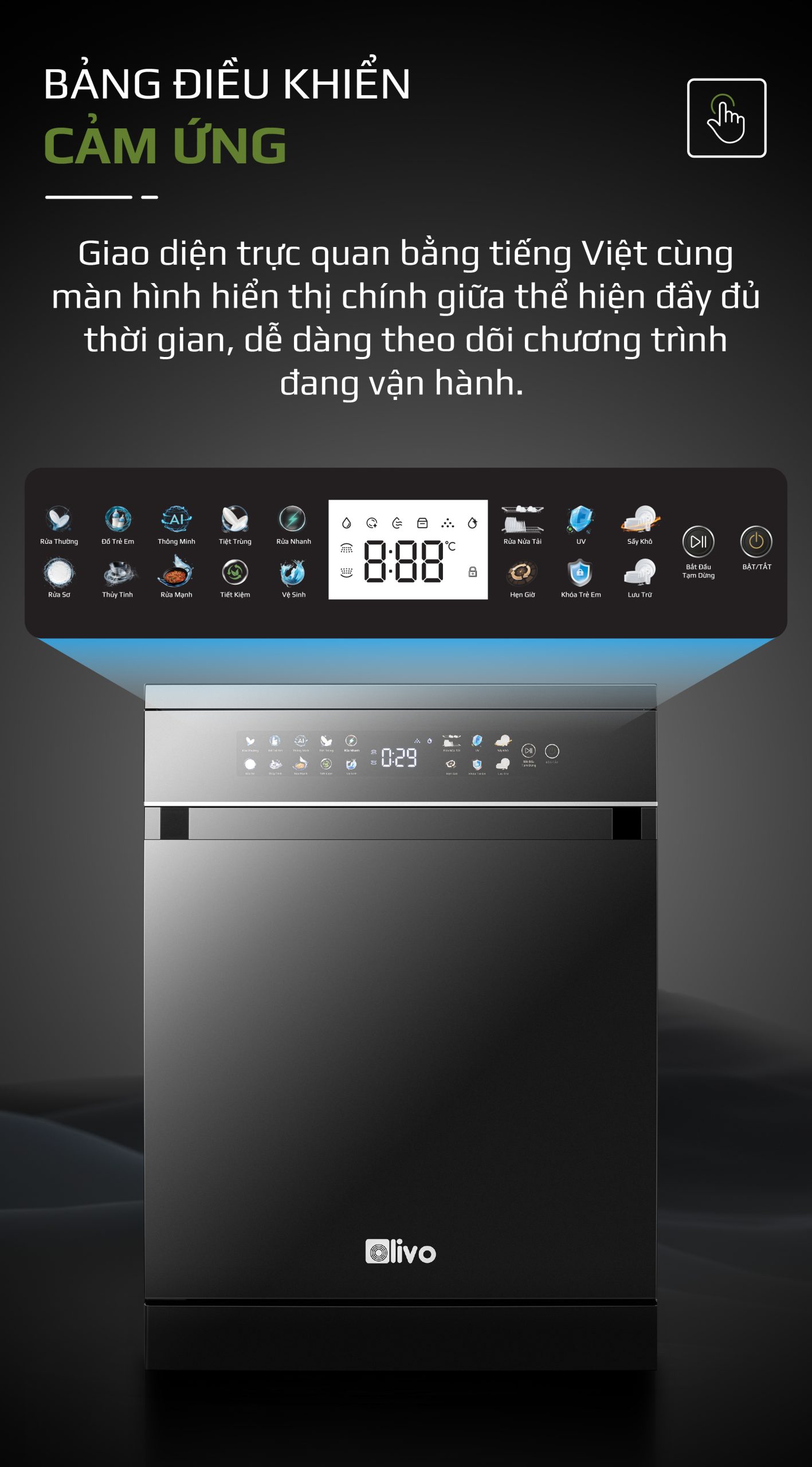 - Máy rửa bát OLIVO DW18 được trang bị bảng điều khiển cảm ứng tiếng Việt hiện đại, giao diện trực quan. Thao tác sử dụng đơn giản, điều khiển chính xác với một lần chạm. Ngay cả với những người lớn tuổi cũng có thể sử dụng một cách dễ dàng.