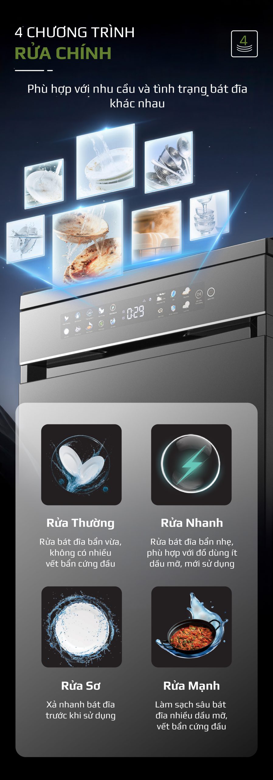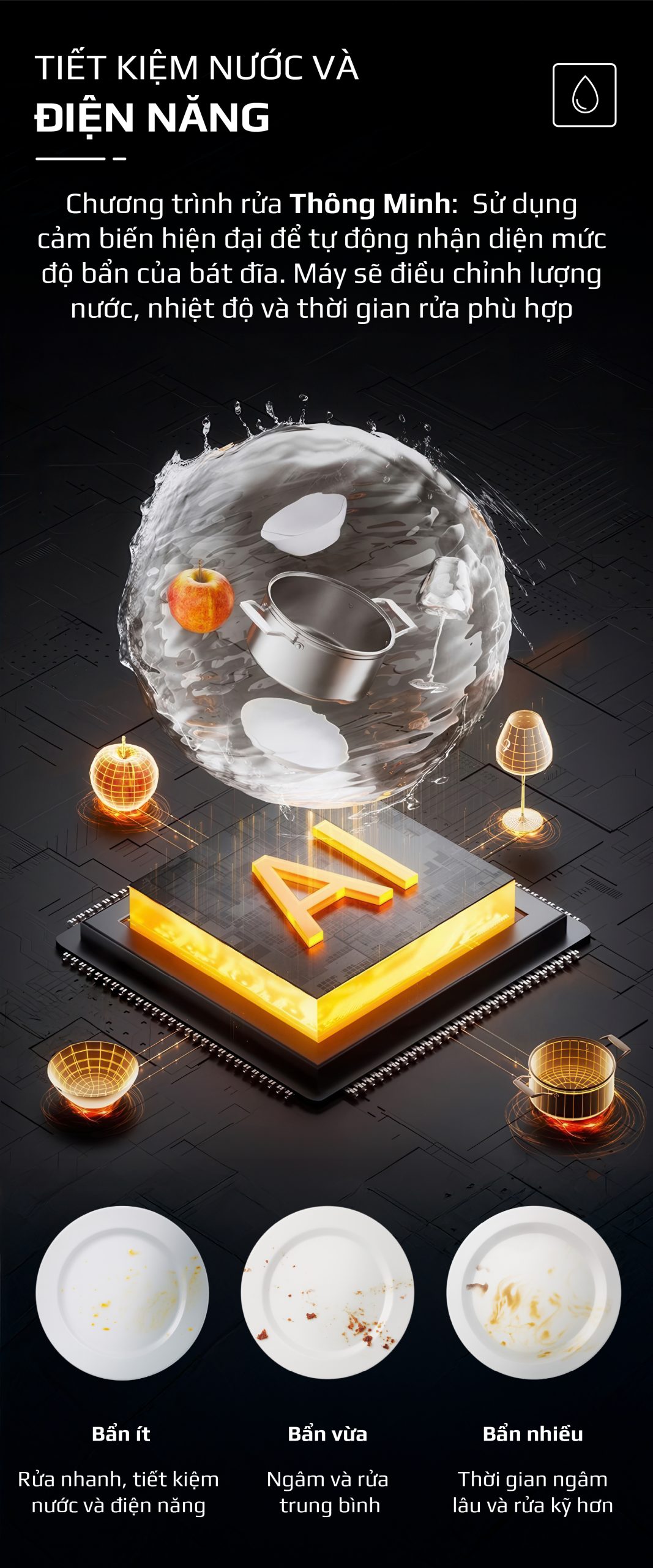 - Thông Minh: Tự động nhận diện mức độ bẩn của bát đĩa để điều chỉnh chương trình rửa phù hợp.