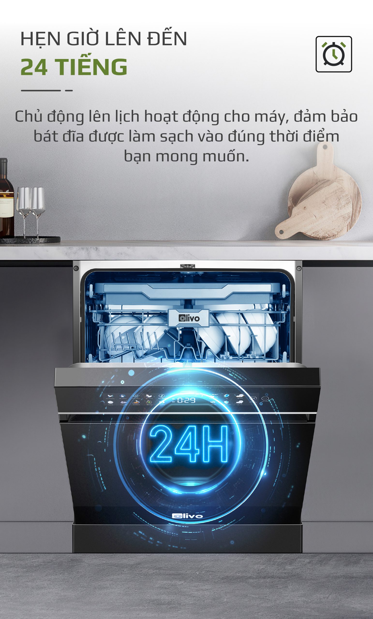 - Máy rửa bát OLIVO DW18 cho phép hẹn giờ vận hành lên đến 24 tiếng, giúp bạn dễ dàng sắp xếp công việc nhà theo lịch trình cá nhân. Chỉ với vài thao tác đơn giản, bạn có thể lên lịch rửa bát vào ban đêm, trước khi đi làm hoặc bất cứ thời điểm nào thuận tiện, bát đĩa sẽ sạch sẽ đúng lúc bạn cần, không làm ảnh hưởng đến sinh hoạt hay giấc ngủ.