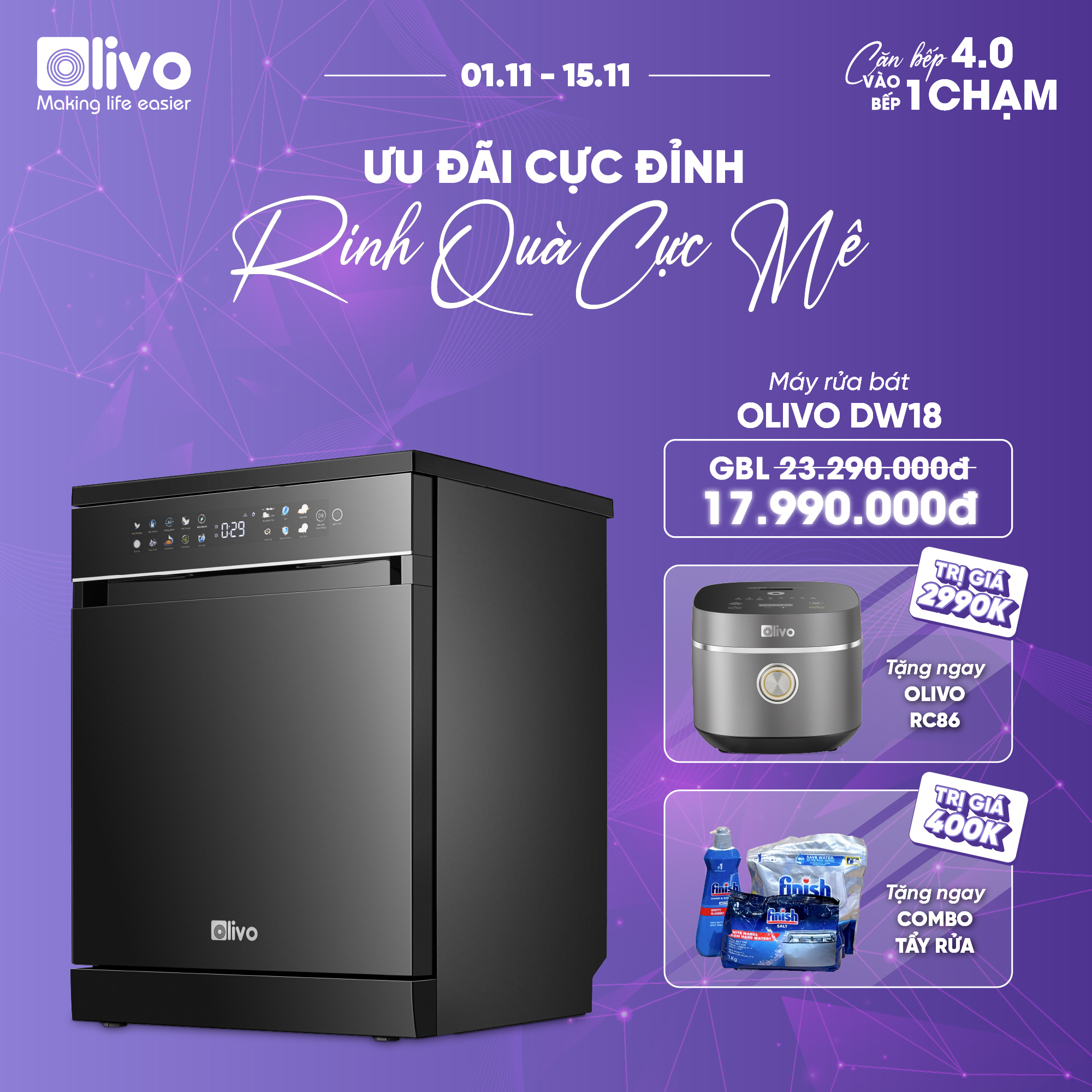 - Hiểu rõ nhu cầu và mong muốn ngày càng cao của người tiêu dùng hiện đại, đội ngũ phát triển sản phẩm của OLIVO đã dày công nghiên cứu và cho ra đời máy rửa bát OLIVO DW18 sản phẩm kết tinh từ khát vọng nâng tầm trải nghiệm sống tiện nghi. Không chỉ là một thiết bị gia dụng, máy rửa bát OLIVO DW18 còn là biểu tượng của sự hiện đại trong căn bếp, nơi công nghệ và thẩm mỹ giao thoa. Với thiết kế màu đen sang trọng, động cơ DC vận hành êm ái và tích hợp những công nghệ tiên tiến như sấy khô EcoDry, diệt khuẩn bằng tia UV, Công nghệ rửa Hydro360 Wash thông minh… sản phẩm mang đến giải pháp rửa bát sạch khuẩn, tiết kiệm thời gian và chăm sóc sức khỏe gia đình một cách toàn diện.