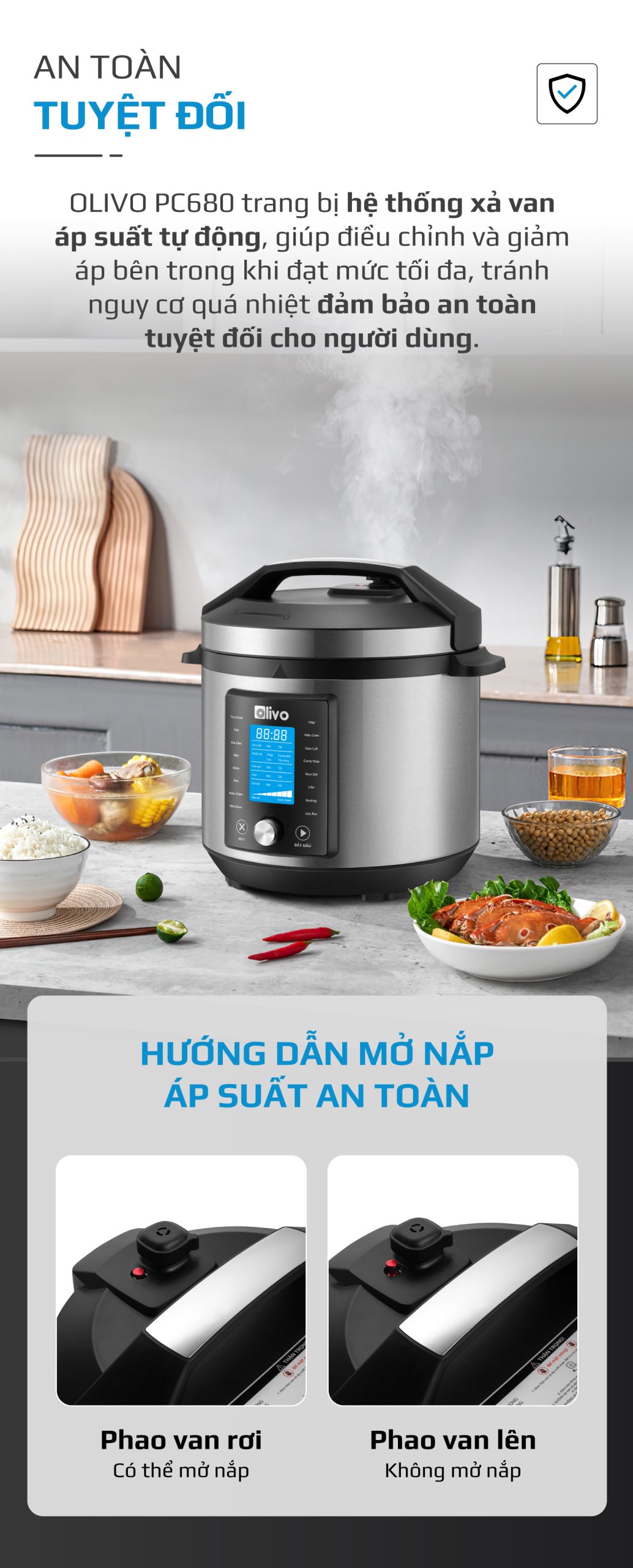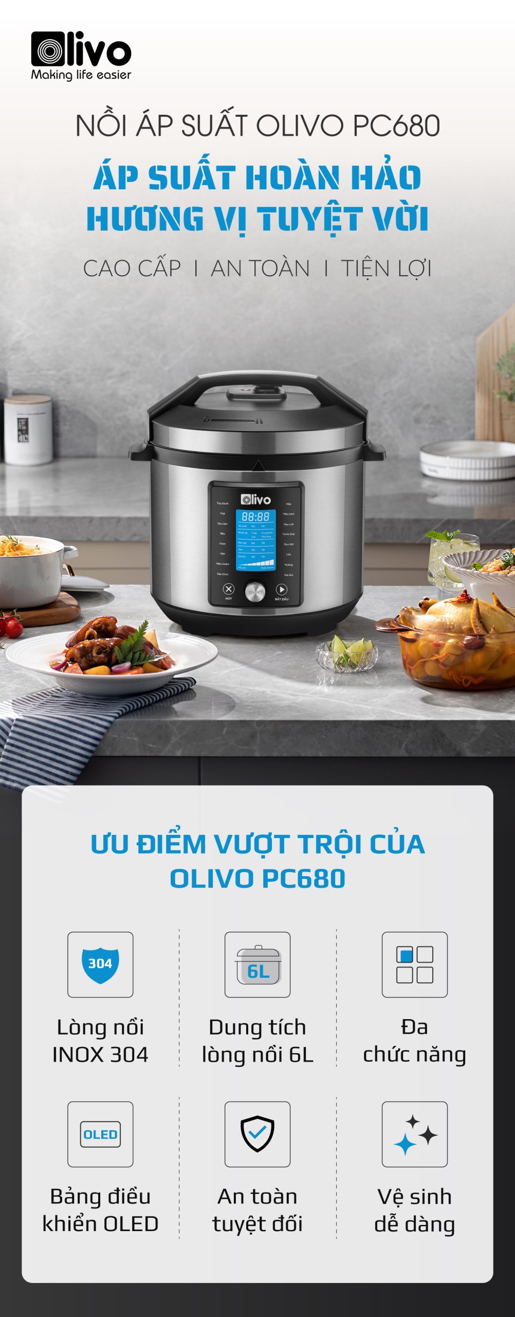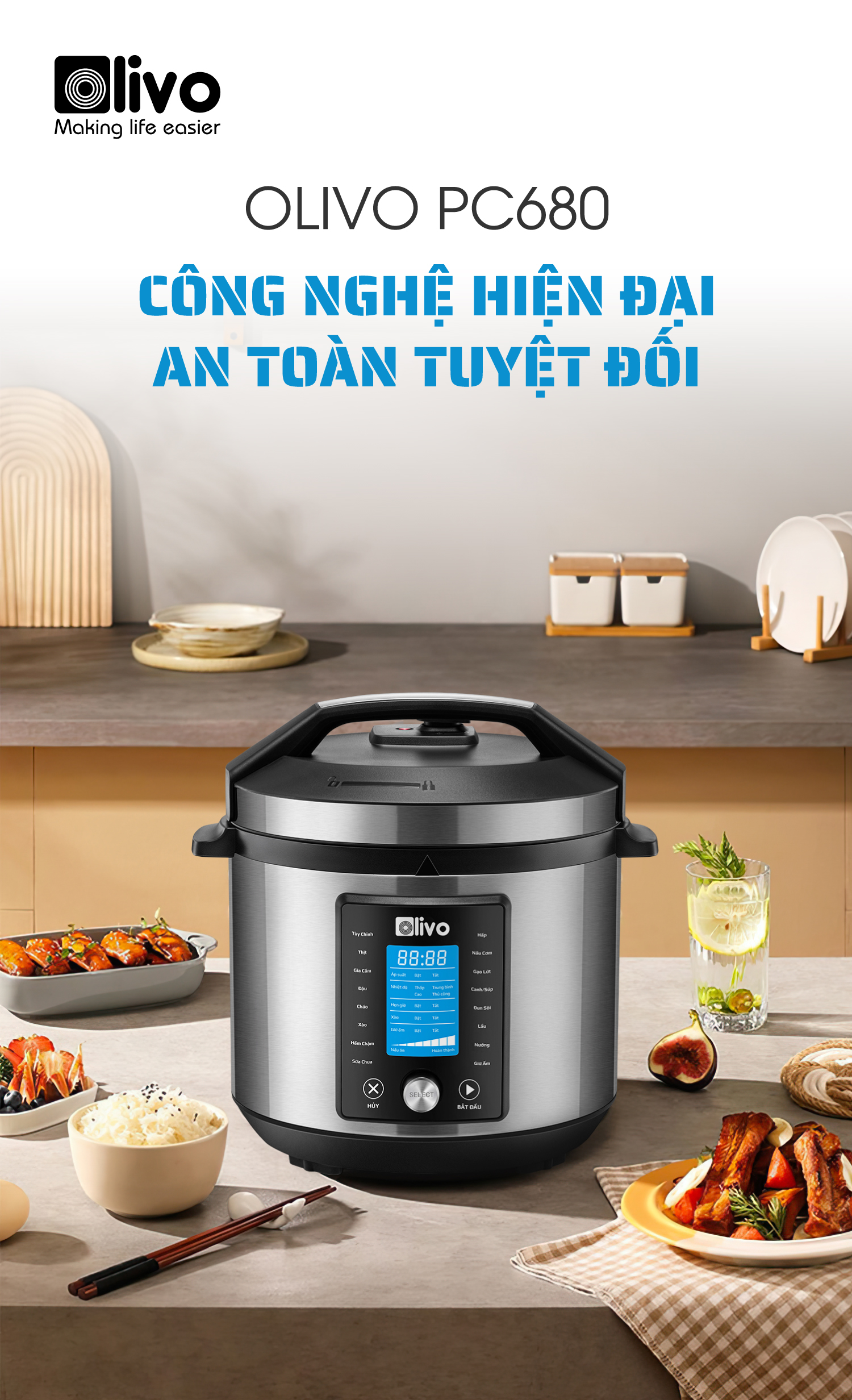OLIVO trân trọng giới thiệu đến quý khách hàng sản phẩm mới – Nồi áp suất điện OLIVO PC680. Với thiết kế hiện đại, tính năng đa dạng và chất lượng vượt trội, PC680 hứa hẹn sẽ trở thành người bạn đồng hành không thể thiếu trong căn bếp của mỗi gia đình.