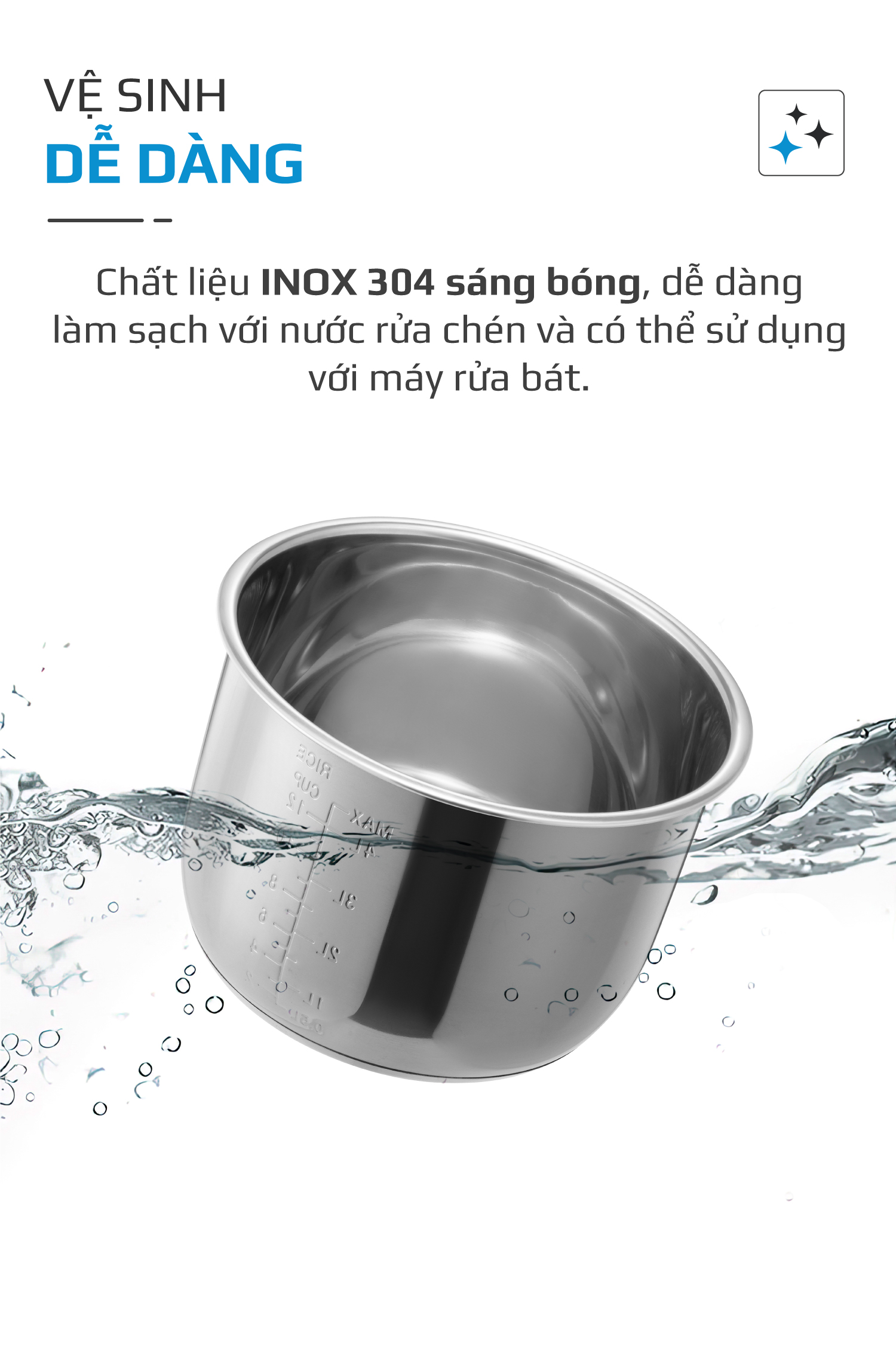 Lòng nồi chất liệu INOX 304 sáng bóng, dễ dàng làm sạch với nước rửa chén và có thể sử dụng với máy rửa bát.