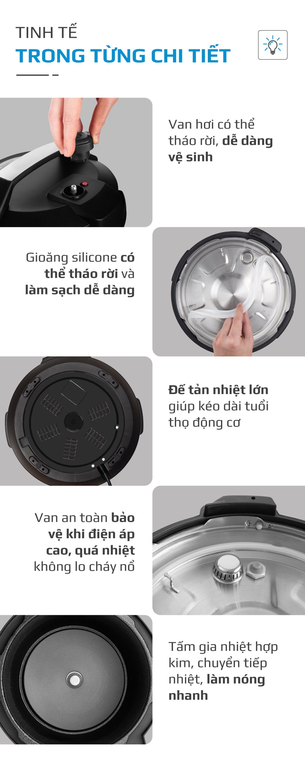An toàn: Nồi áp suất điện được thiết kế an toàn, với nhiều tính năng bảo vệ để ngăn ngừa sự cố nổ áp suất.