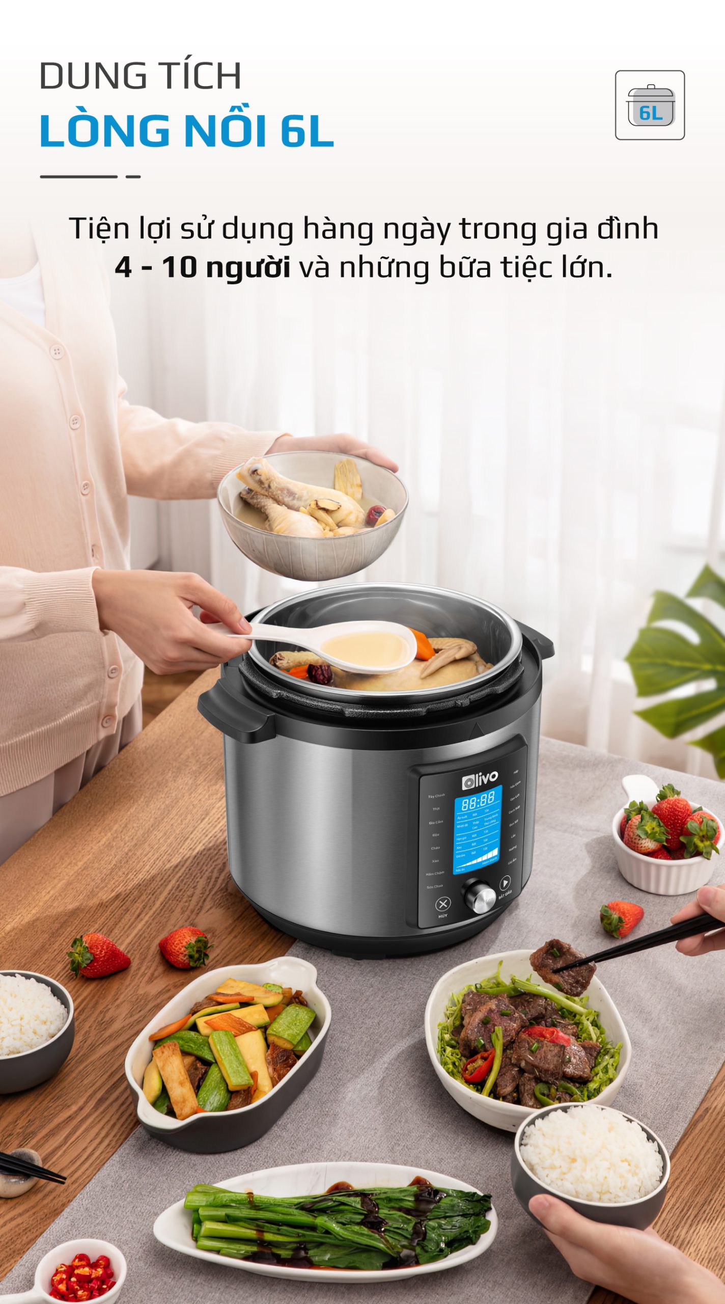 Phù hợp với gia đình từ 4-6 người: Dung tích lòng nồi 6L đáp ứng đủ nhu cầu nấu ăn cho một gia đình từ 4-6 người. Bạn có thể thoải mái nấu các món hầm, súp, cháo, thịt kho,… với số lượng lớn.