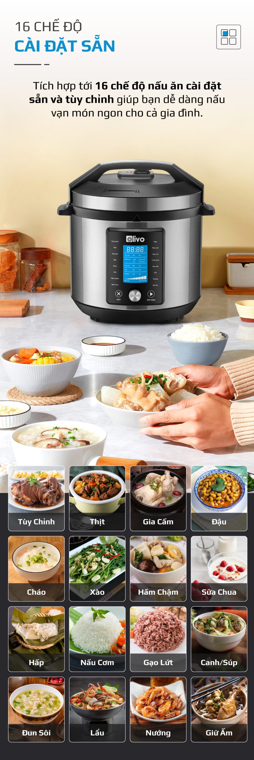 OLIVO PC680 được trang bị tới 16 chế độ nấu ăn cài đặt sẵn mang lại nhiều lợi ích cho người sử dụng, giúp quá trình nấu nướng trở nên đơn giản hơn bao giờ hết.