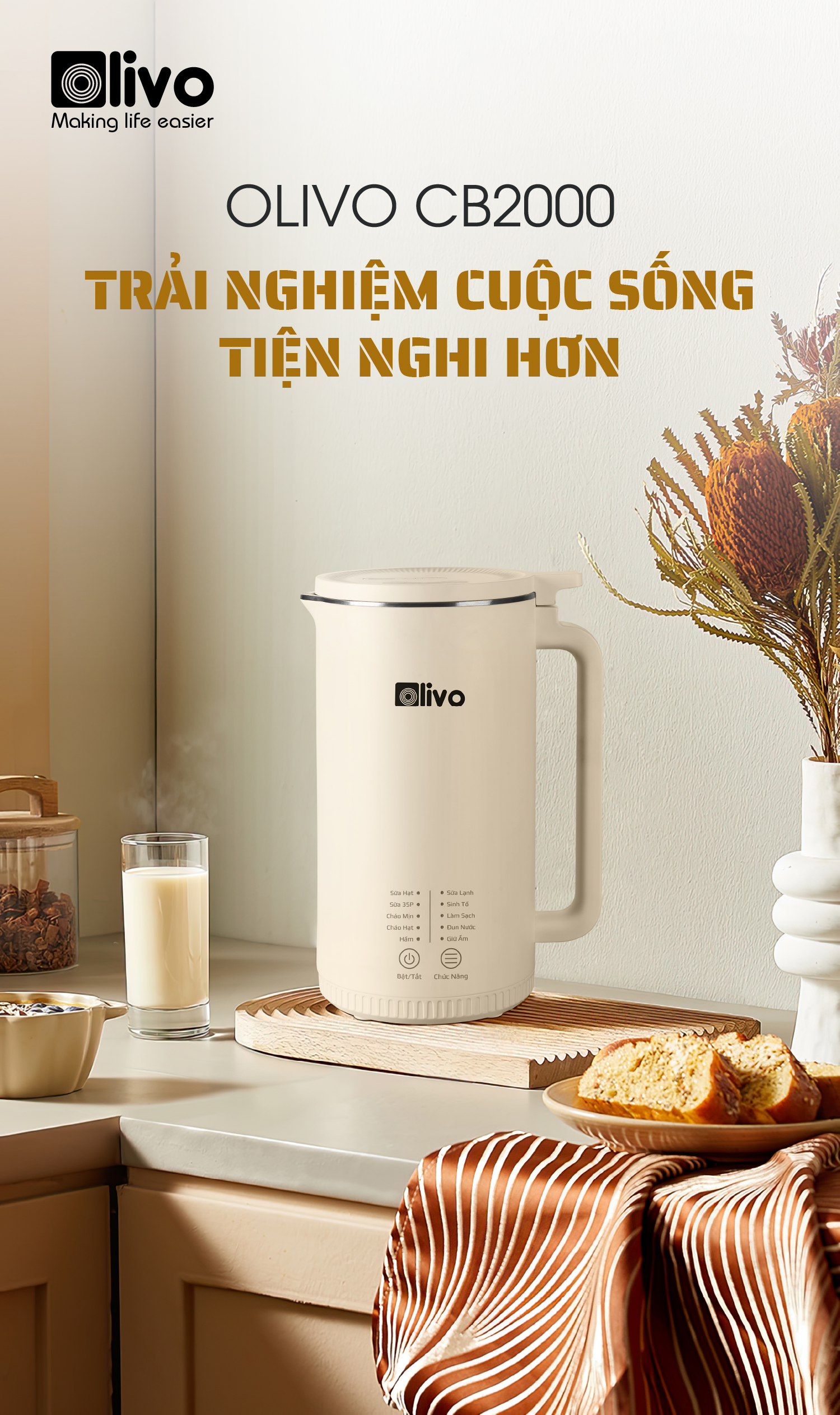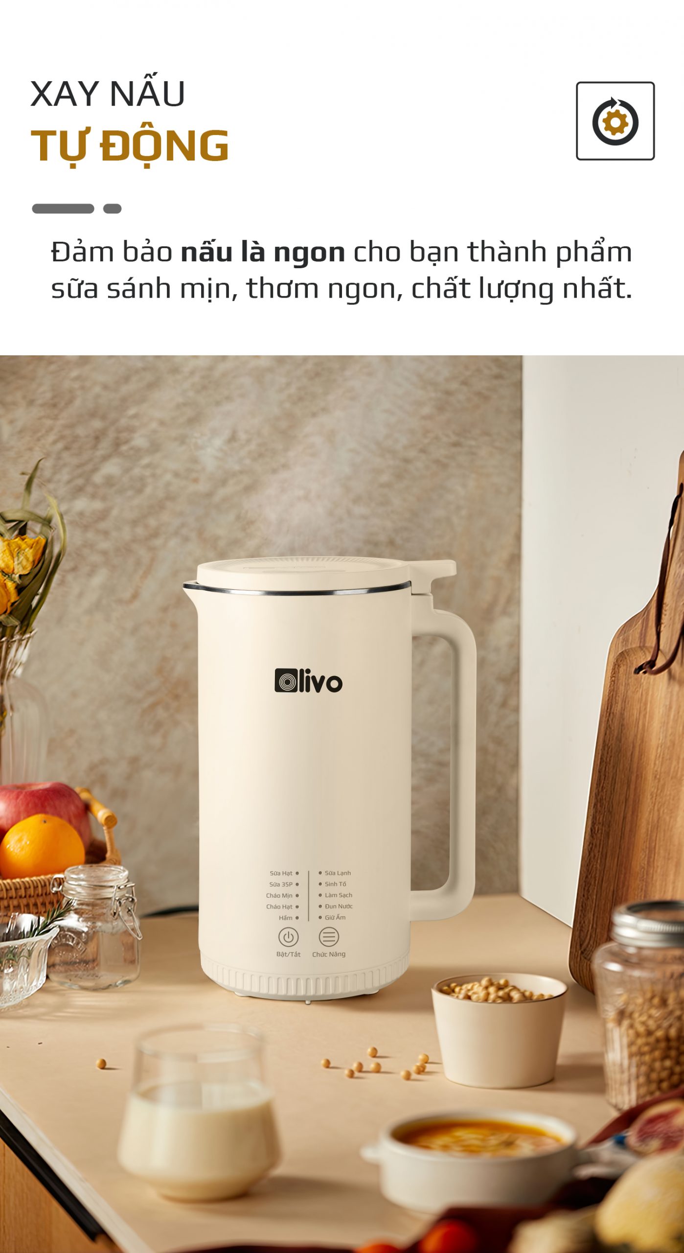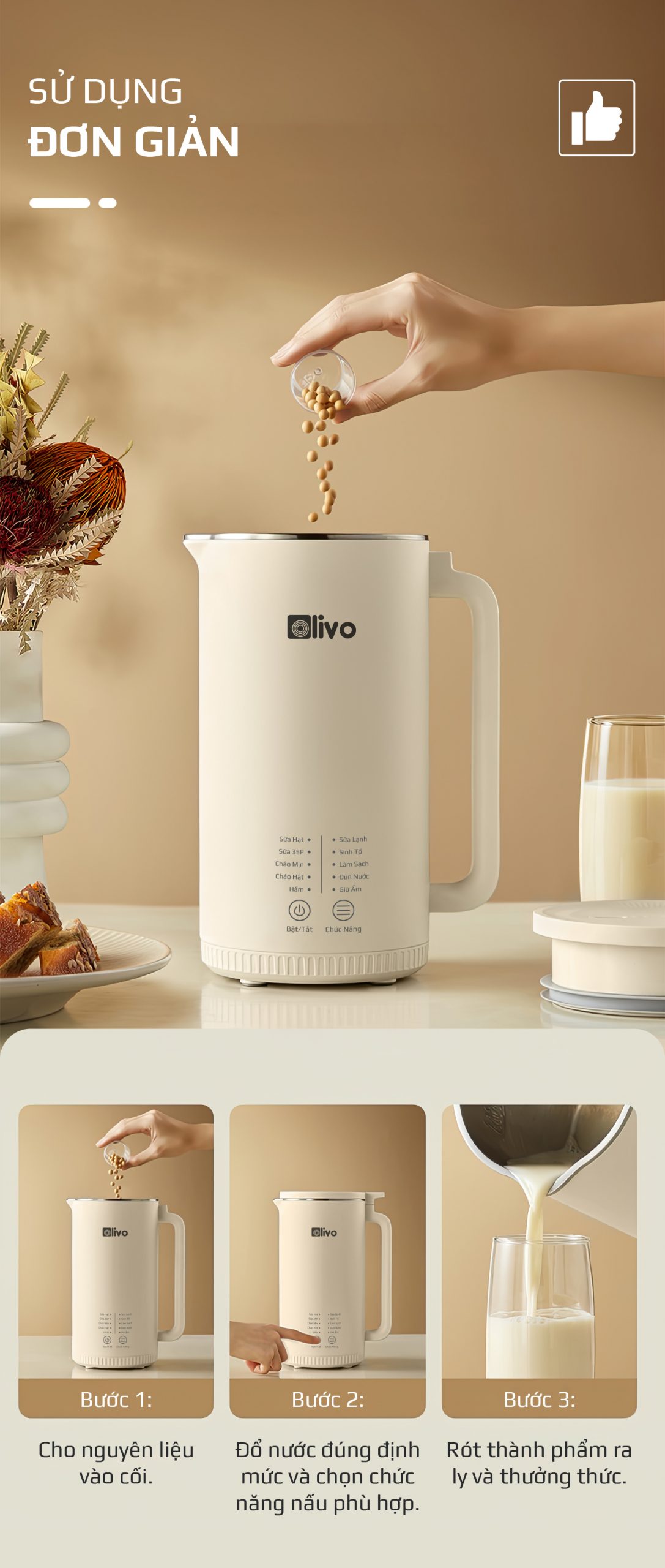 - Không cầu kỳ như cách nấu sữa truyền thống, không cần sử dụng nhiều dụng cụ lỉnh kỉnh với OLIVO CB2000 mọi công đoạn nấu ra một mẻ sữa thơm ngon sánh mịn chỉ gói gọn trong 3 bước đơn giản như sau: