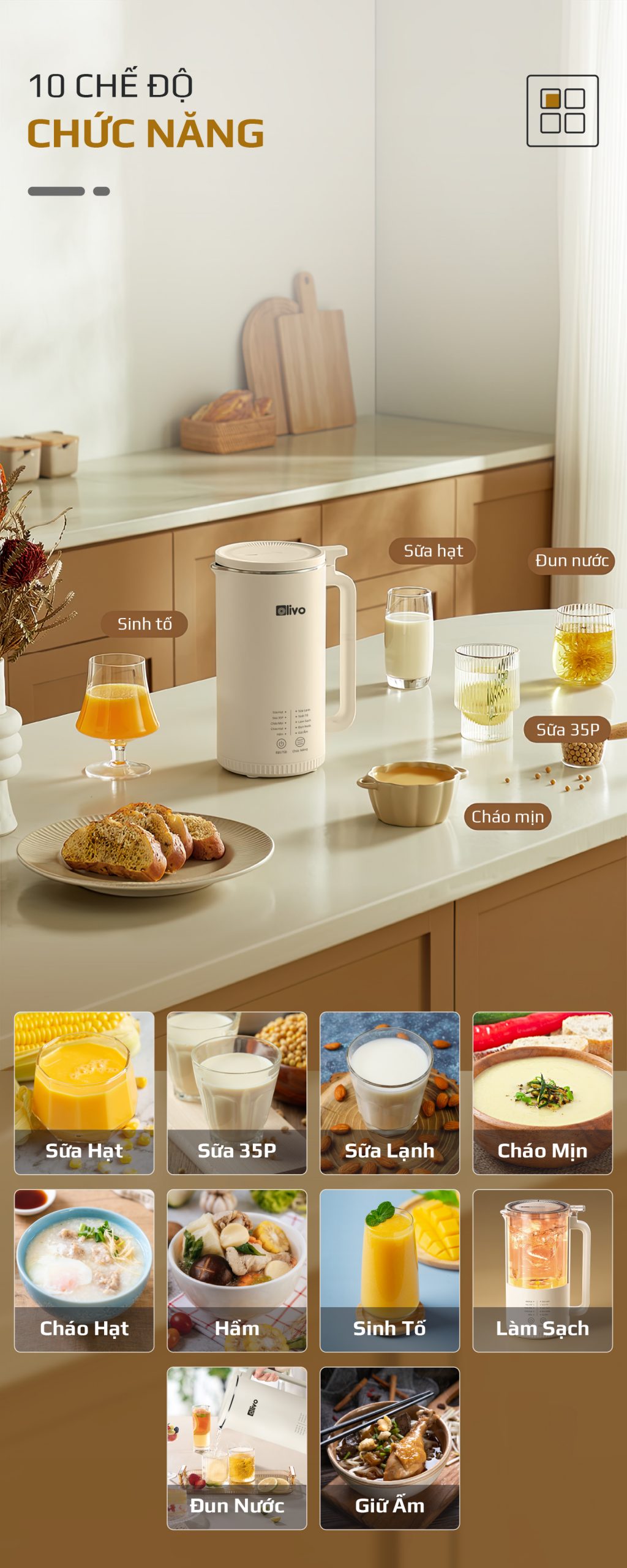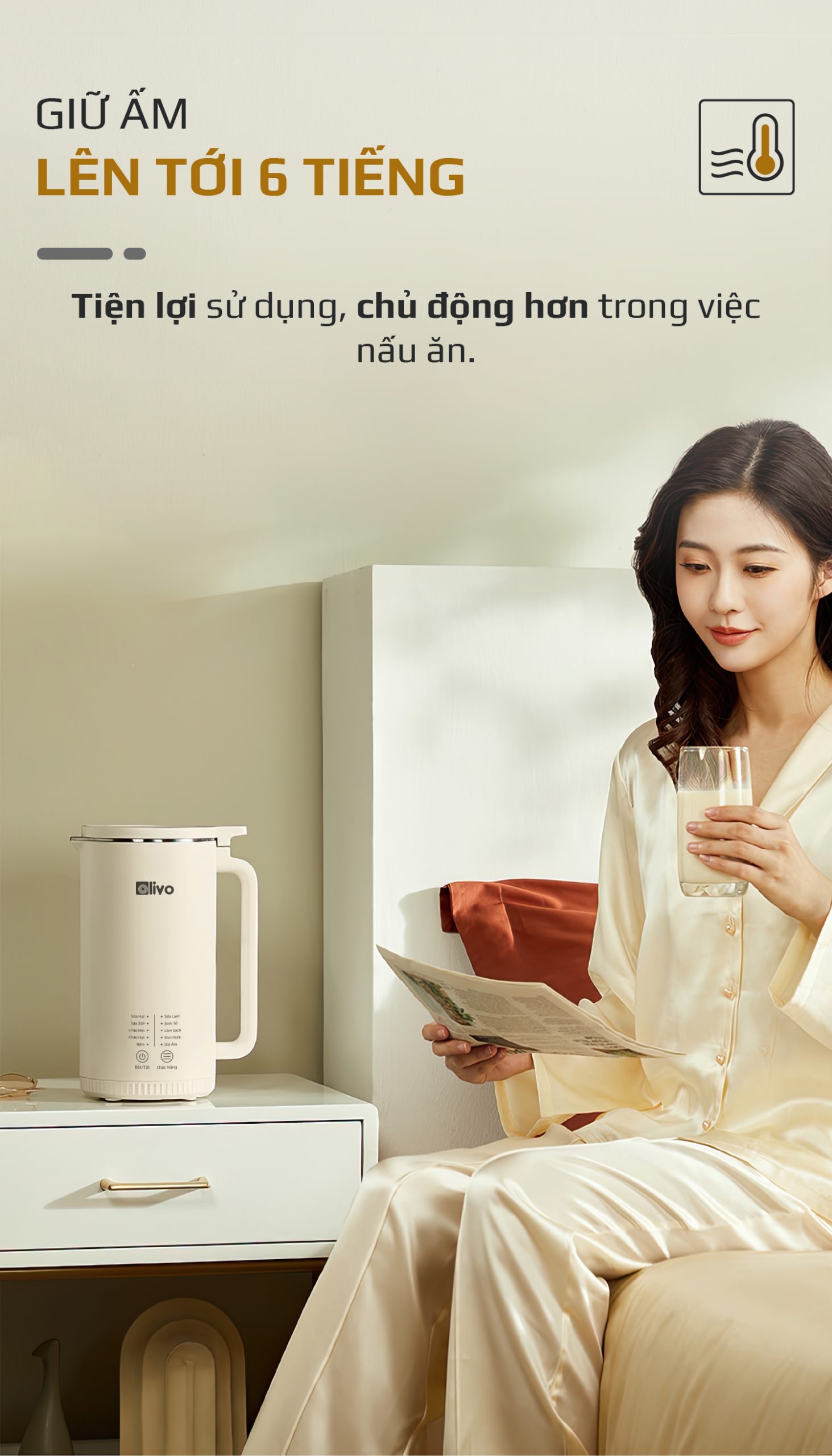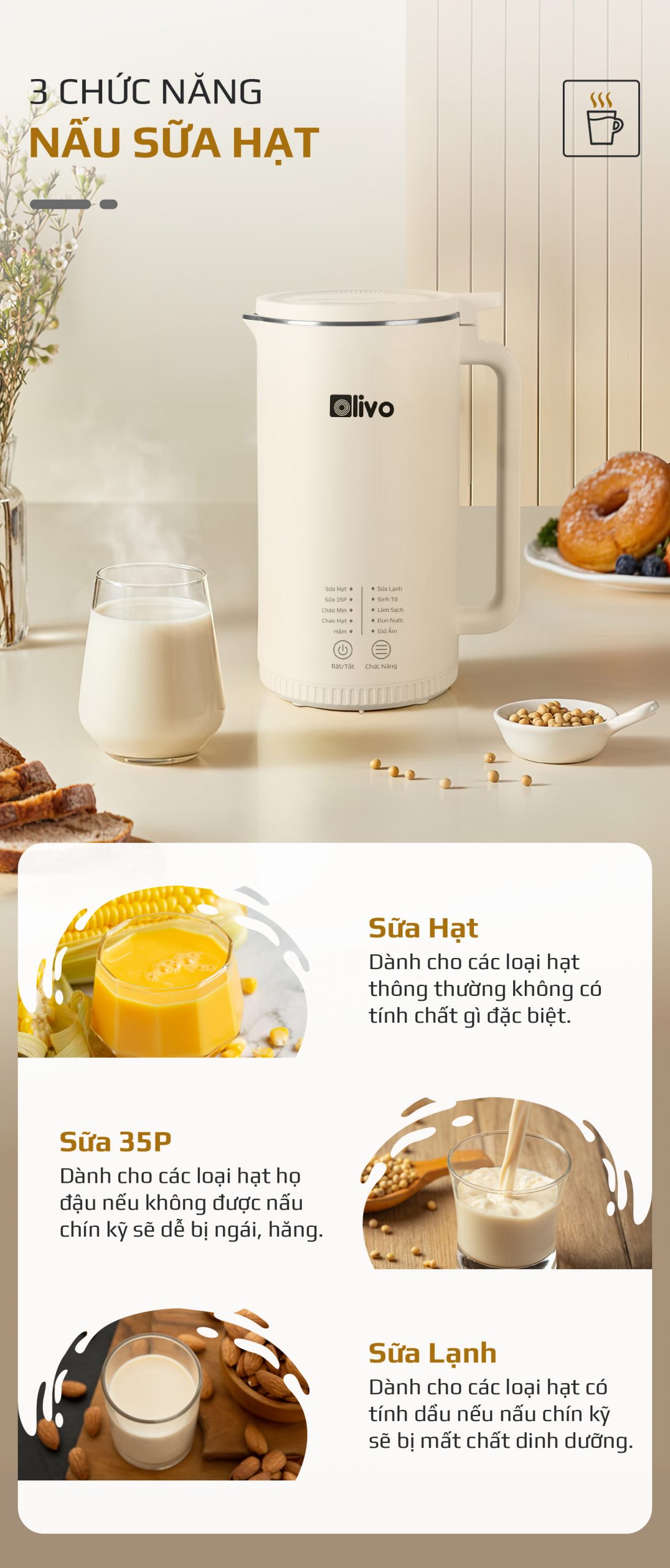- Không cầu kỳ như cách nấu sữa truyền thống, không cần sử dụng nhiều dụng cụ lỉnh kỉnh với OLIVO CB2000 mọi công đoạn nấu ra một mẻ sữa thơm ngon sánh mịn chỉ gói gọn trong 3 bước đơn giản như sau:
