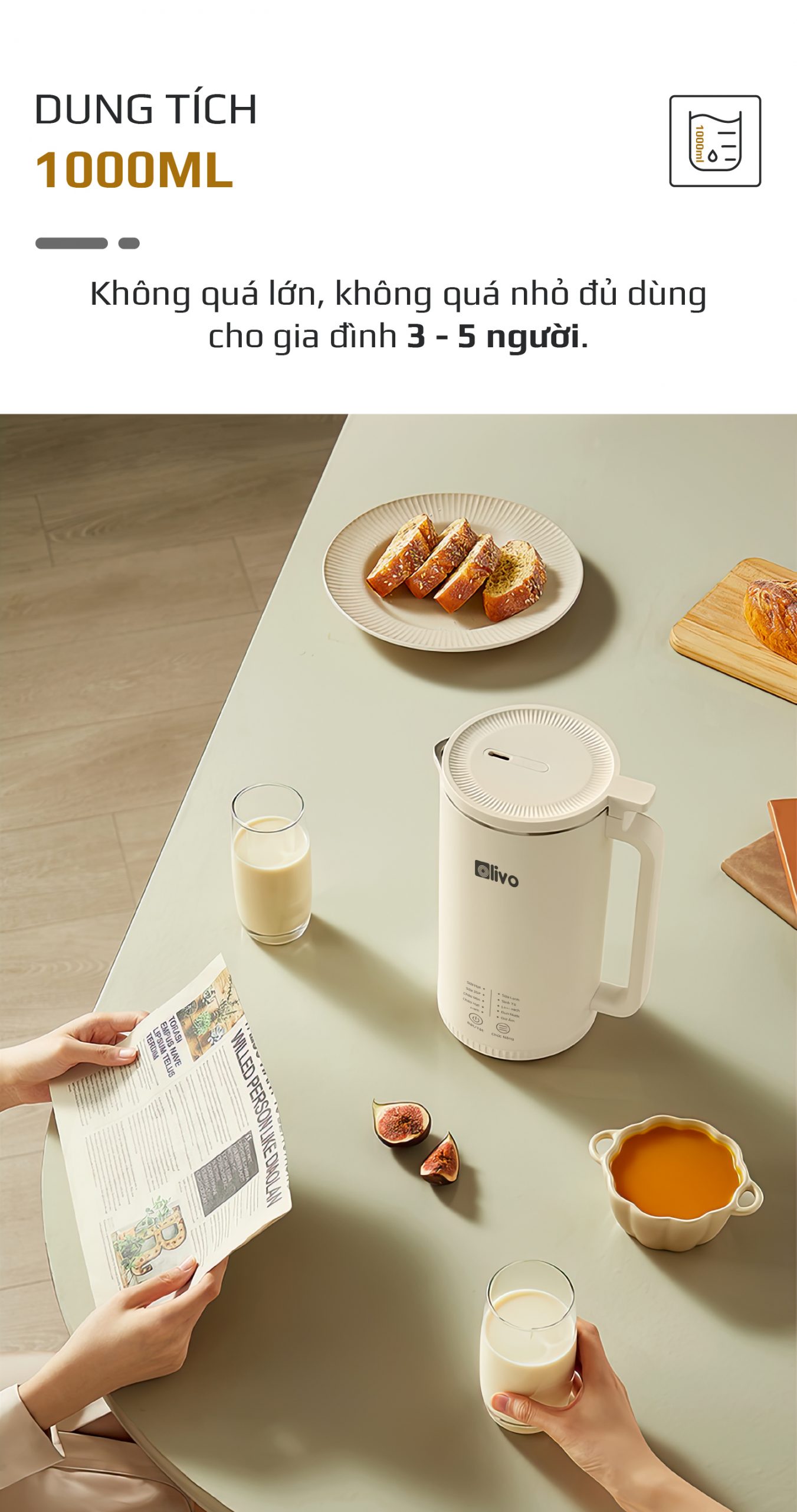 - OLIVO CB2000 có dung tích 1000ml, vừa đủ cho 3-5 người dùng. Máy không quá lớn như những dòng máy xay nấu lớn, cũng không quá nhỏ như dòng xay nấu mini. Điều này giúp máy vừa tiện lợi sử dụng hàng ngày, vừa không chiếm quá nhiều diện tích trong bếp.