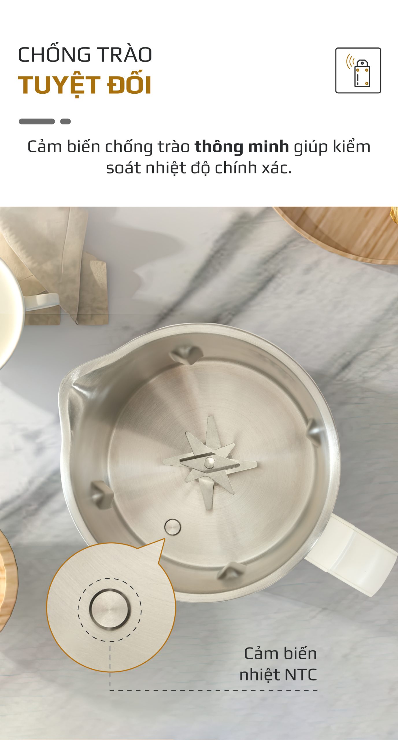 - Đối với sản phẩm OLIVO CB2000, máy được trang bị công nghệ cảm biến nhiệt thông minh NTC giúp kiểm soát nhiệt độ bên trong máy tránh tràn bình, khê cối rất hiệu quả.