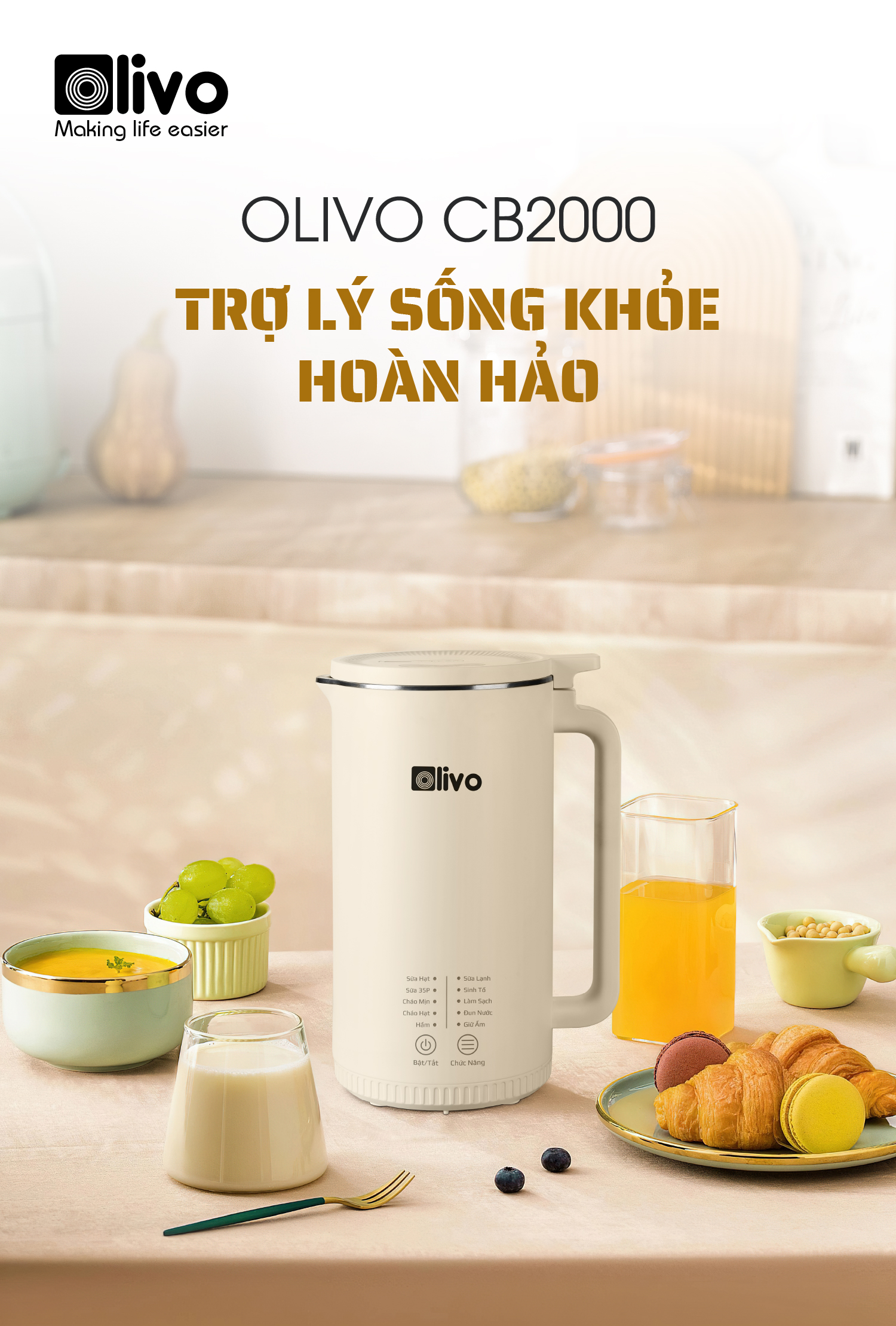 - Vậy nên chị em sẽ cực kỳ yên tâm khi sử dụng OLIVO CB2000 bởi vì máy có thiết kế tối giản, thông minh nấu nướng dễ dàng và vệ sinh cũng vô cùng đơn giản. Đặc biệt máy được trang bị thêm chức năng Làm Sạch. Sau khi sử dụng xong chị em chỉ cần cho nước sạch vào cối theo đúng định mức, chọn chế độ Làm Sạch. Chế độ này sẽ hỗ trợ làm sạch lòng cối và lưỡi dao hiệu quả giúp công việc vệ sinh máy nhanh gọn, dễ dàng hơn bao giờ hết.