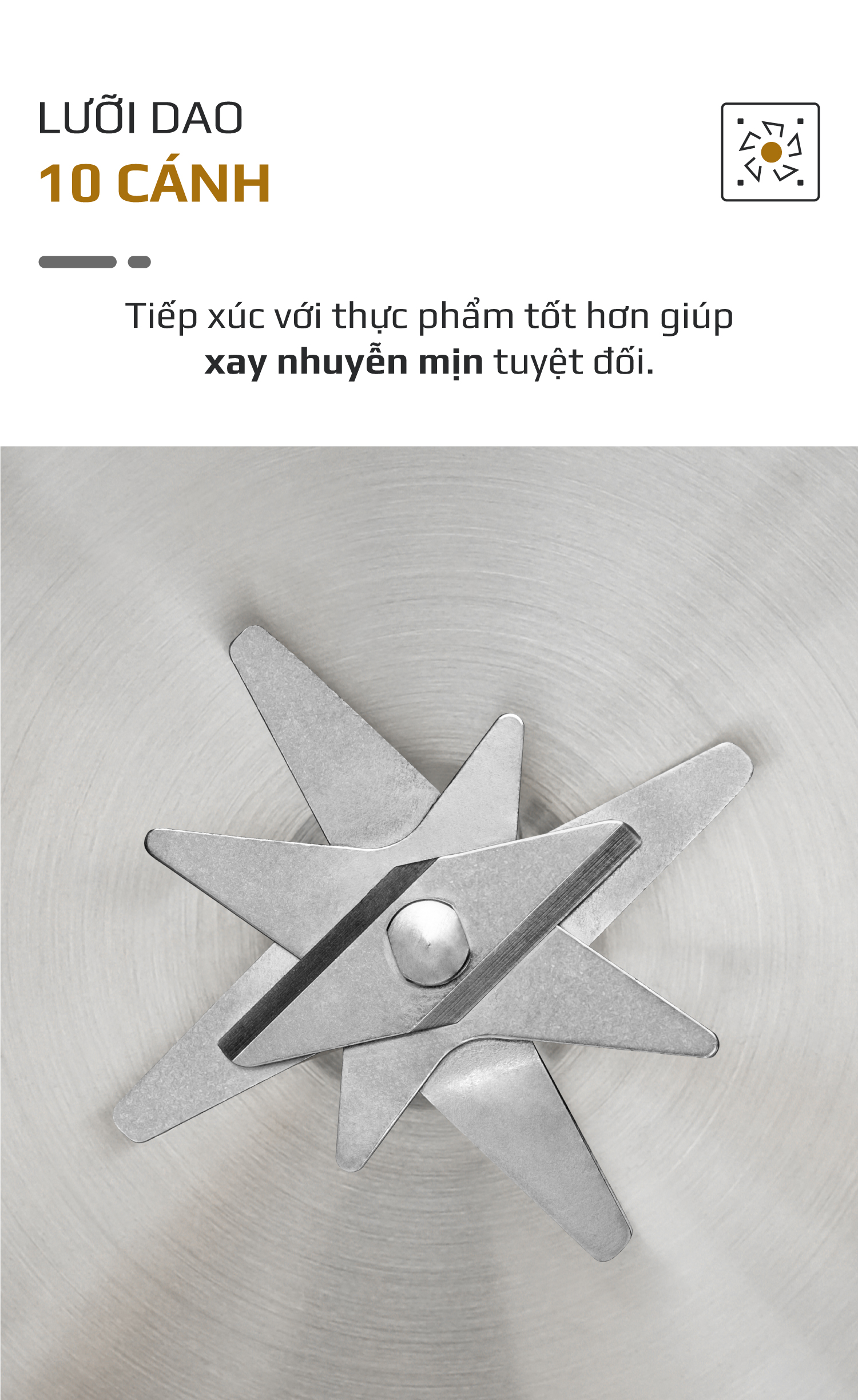 - Sản phẩm được trang bị lưỡi dao lên tới 10 cánh với các kích thước ngắn – dài – to – nhỏ khác nhau giúp lưỡi dao có thể tiếp xúc với thực phẩm tốt hơn ở nhiều góc độ để dễ dàng cắt gọn, xay nhuyễn mọi loại nguyên liệu.