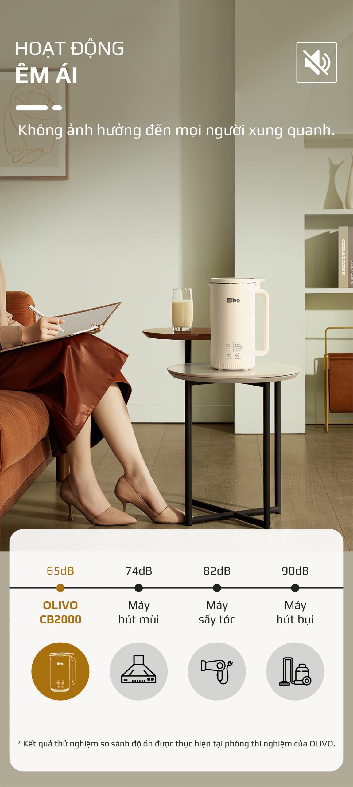 - Tại phòng thí nghiệm của OLIVO chúng tôi đã kiểm chứng được độ ồn của máy khi hoạt động là 65dB là mức độ ồn tương đối thấp, không gây ảnh hưởng đến công việc và mọi người xung quanh. Điều này sẽ giúp bạn có những trải nghiệm cực kỳ tốt về sản phẩm.