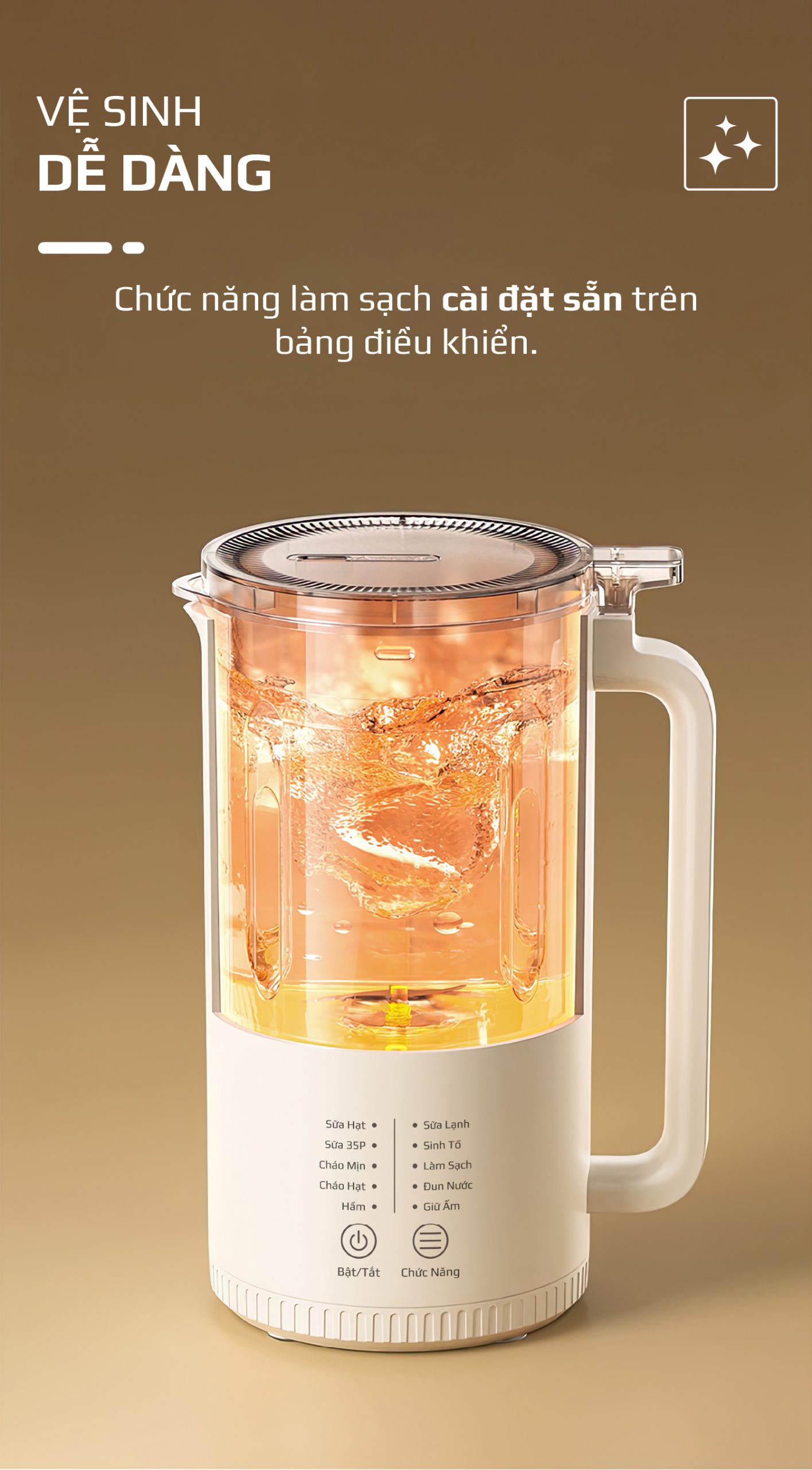 - Làm Sạch: Cho nước vào cối và chọn chức năng làm sạch, máy sẽ tự động làm sạch cặn sữa, thức ăn còn sót lại trong lòng cối và lưỡi dao.