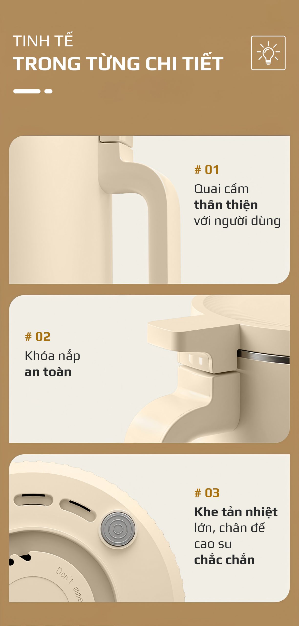 - Khóa nắp căn chỉnh Đóng/Mở nắp an toàn tuyệt đối.