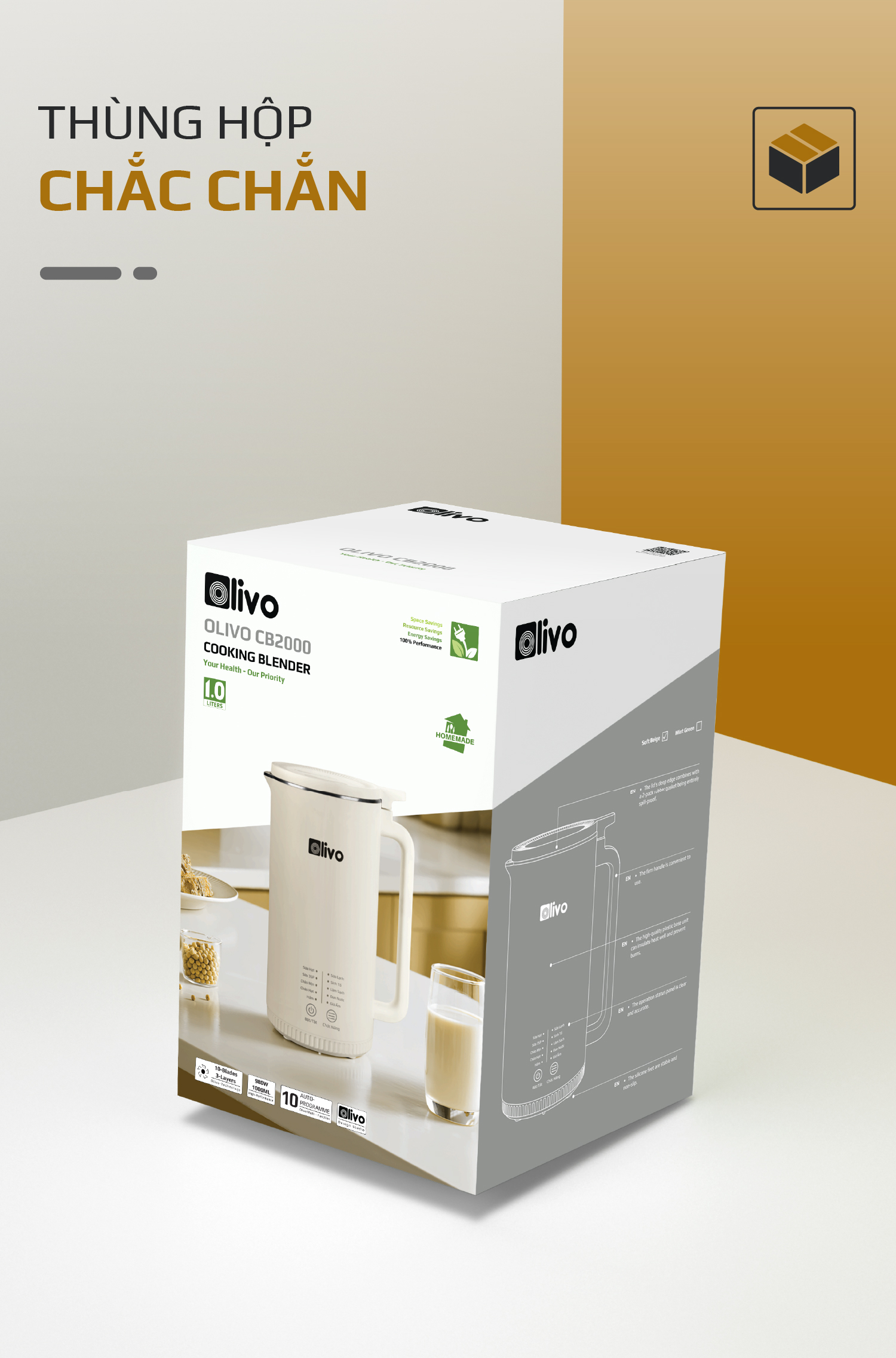 - Thấu hiểu được điều đó OLIVO luôn đặt tiêu chí an toàn và chất lượng lên hàng đầu vậy nên không chỉ với OLIVO CB2000 mà tất cả các dòng sản phẩm máy xay nấu đa năng, máy làm sữa hạt của OLIVO đều được trang bị tính năng chống trào tuyệt đối.