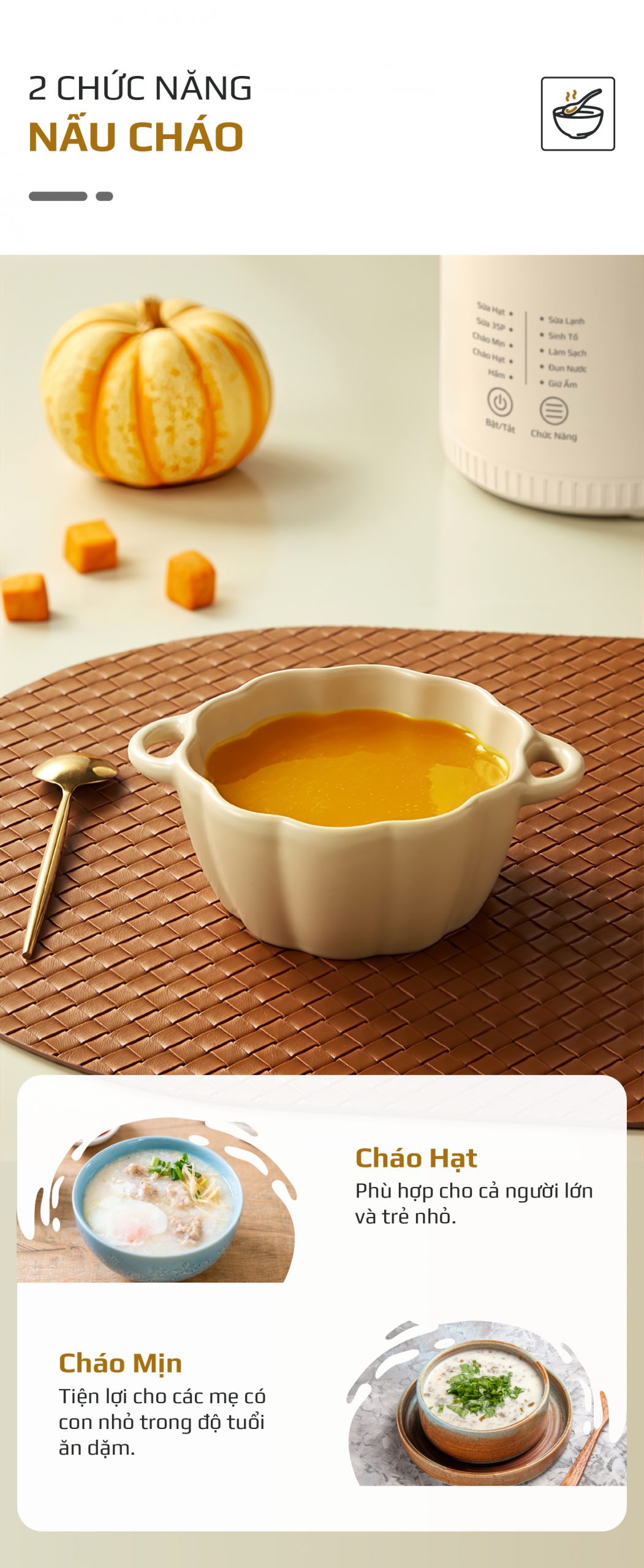 - Cháo Mịn: Thích hợp cho người cao tuổi hoặc trẻ em trong độ tuổi ăn dặm. Việc nấu cháo mỗi ngày sẽ trở nên dễ dàng hơn bao giờ hết.