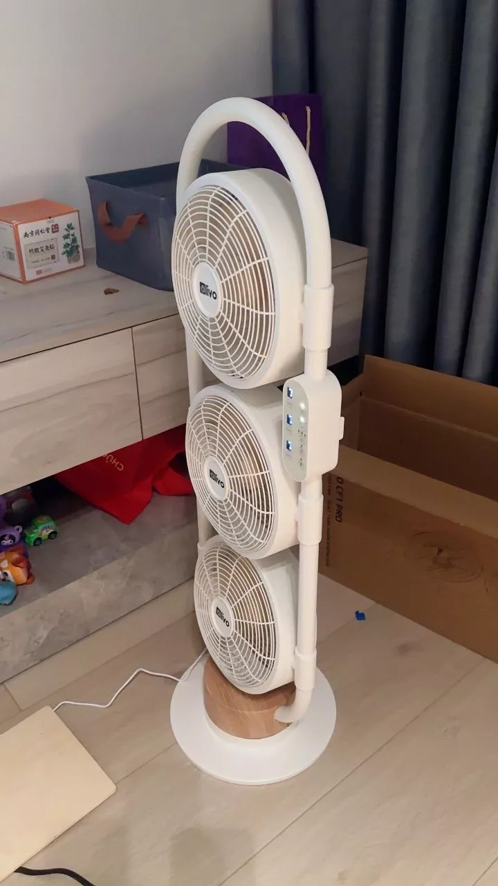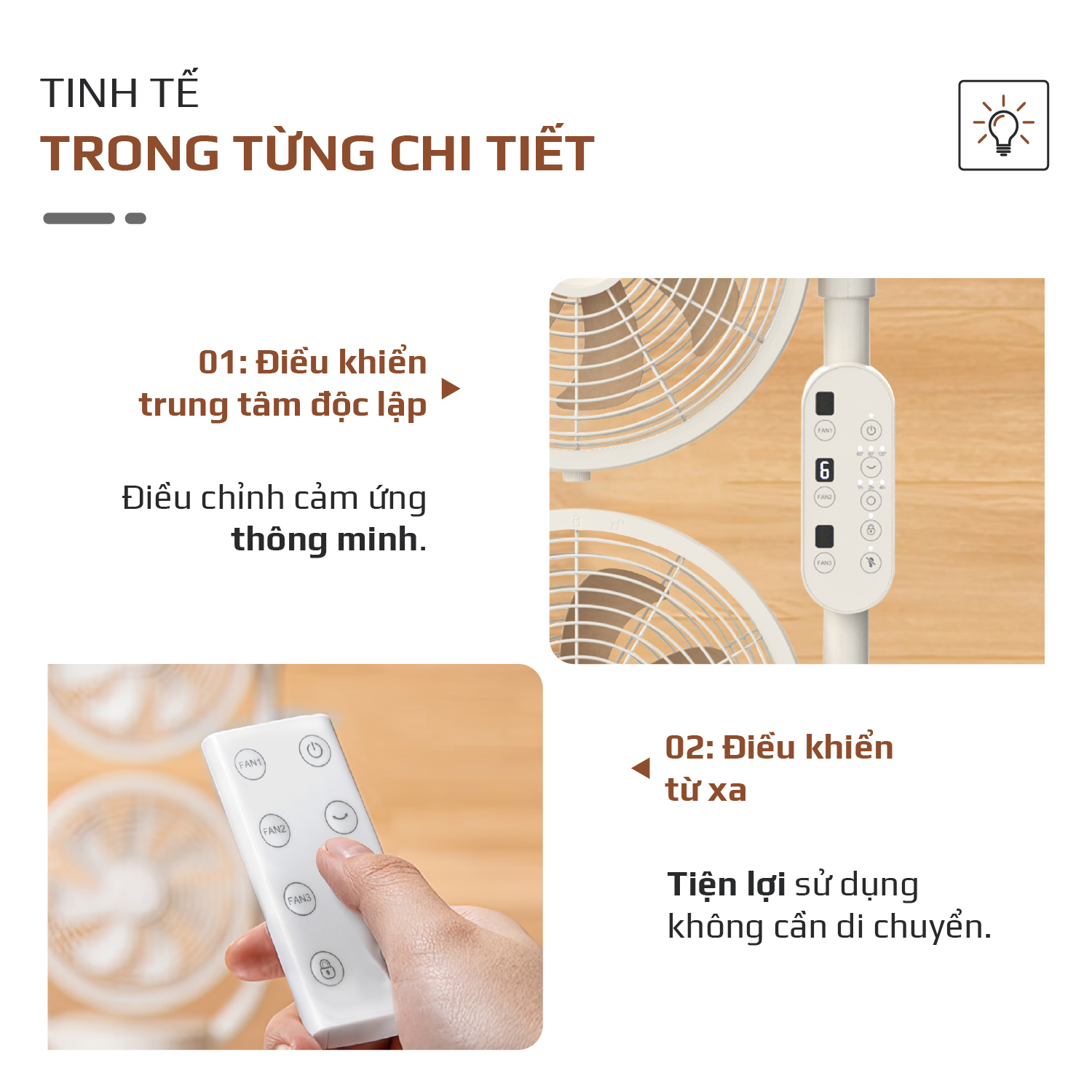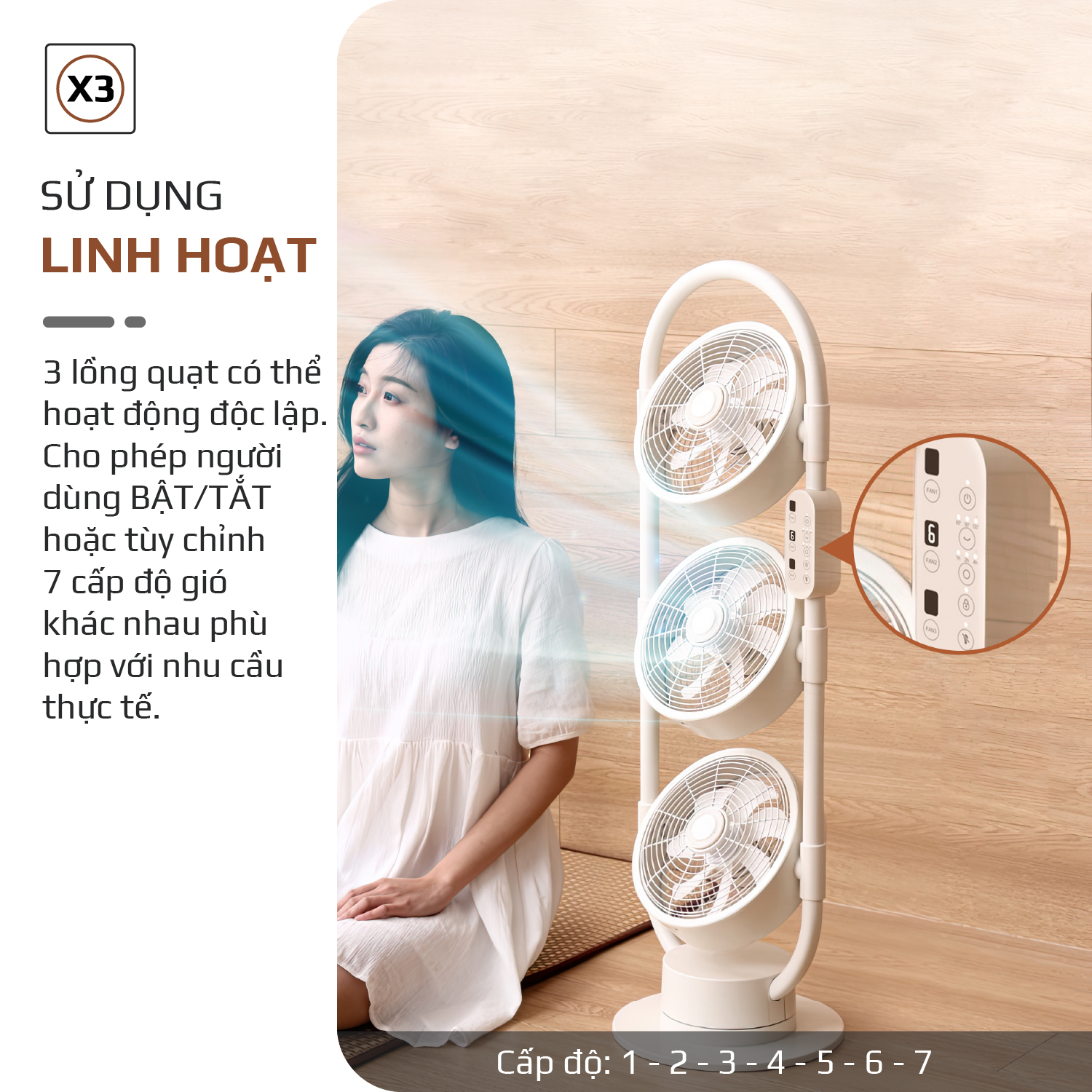 - Điều khiển cảm ứng trung tâm trên thân quạt, có thể điều chỉnh độc lập 3 lồng quạt chạy ở các chế độ khác nhau từ nhẹ đến mạnh. Thêm điều khiển từ xa thông minh tiện lợi sử dụng mà không cần di chuyển khi bạn đang nằm nghỉ trên giường hoặc ngồi xem phim trên sopha vẫn có thể điều chỉnh được quạt theo ý.