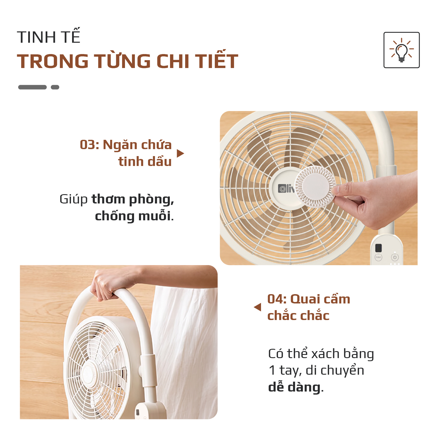 - Phần quai cầm chắc chắn có thể xách bằng 1 tay dễ dàng di chuyển quạt khắp nhà. OLIVO CF1 PRO thật sự là một sản phẩm đa năng, tiện dụng trong một thiết kế hoàn hảo chắc chắn sẽ là điểm nhấn ấn tượng cho ngôi nhà thân yêu của bạn.