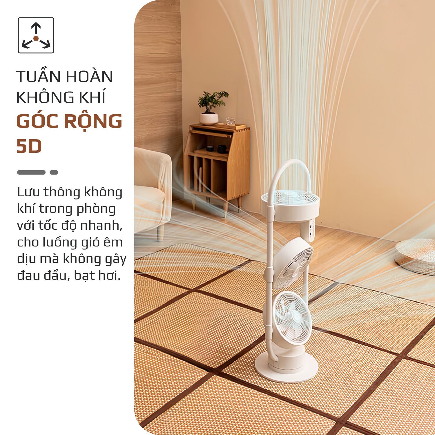 - Góc quay rộng, linh hoạt điều chỉnh mọi hướng làm mát được từ mặt sàn đến trần nhà. Góc quạt sàn -45 độ có thể tập trung làm mát sàn nhanh chóng thoải mái cho trẻ con nô đùa dưới sàn nhà. Góc 120 độ có thể làm mát trên trần nhà, đối lưu không khí trong phòng tốt hơn. Đảm bảo sử dụng quạt lâu dài mà luôn dễ chịu không gây đau đầu, bạt hơi.