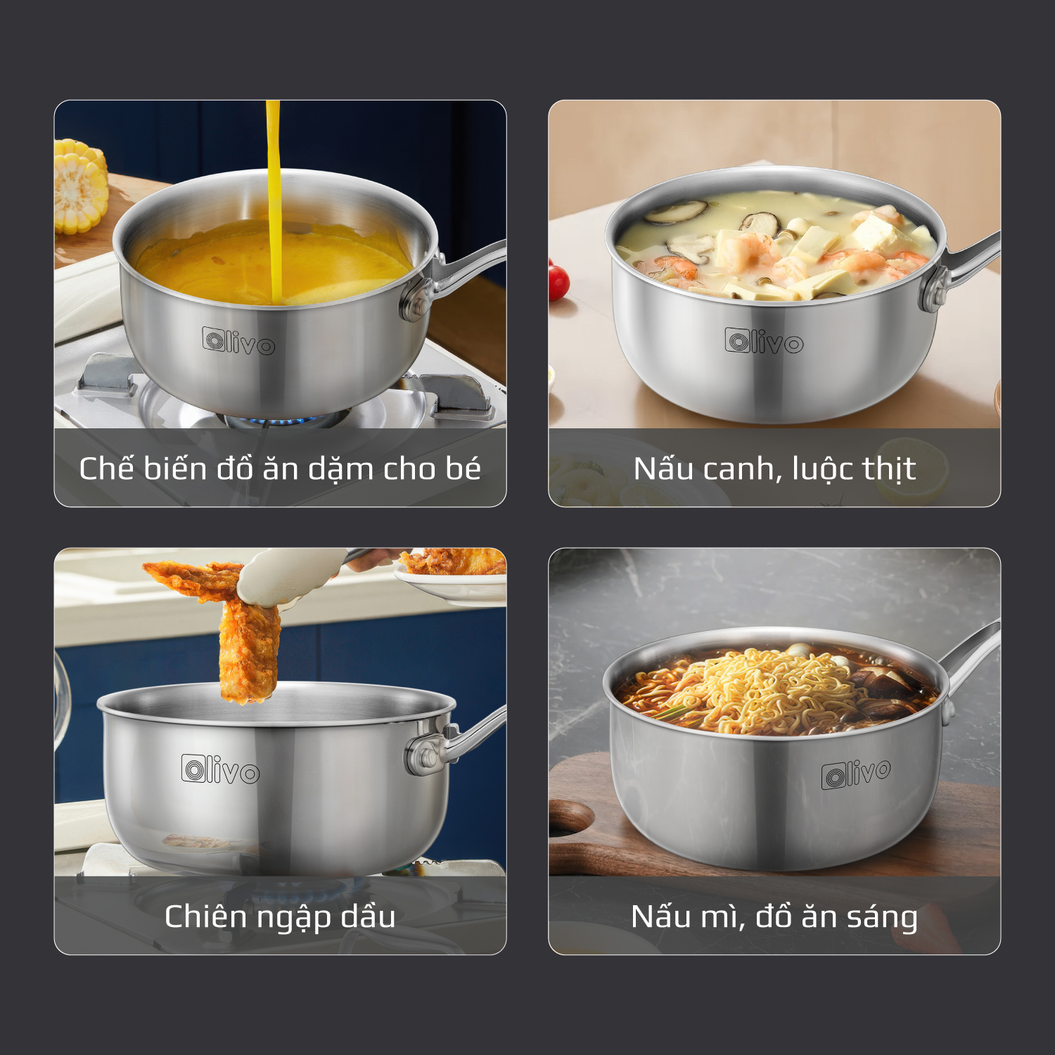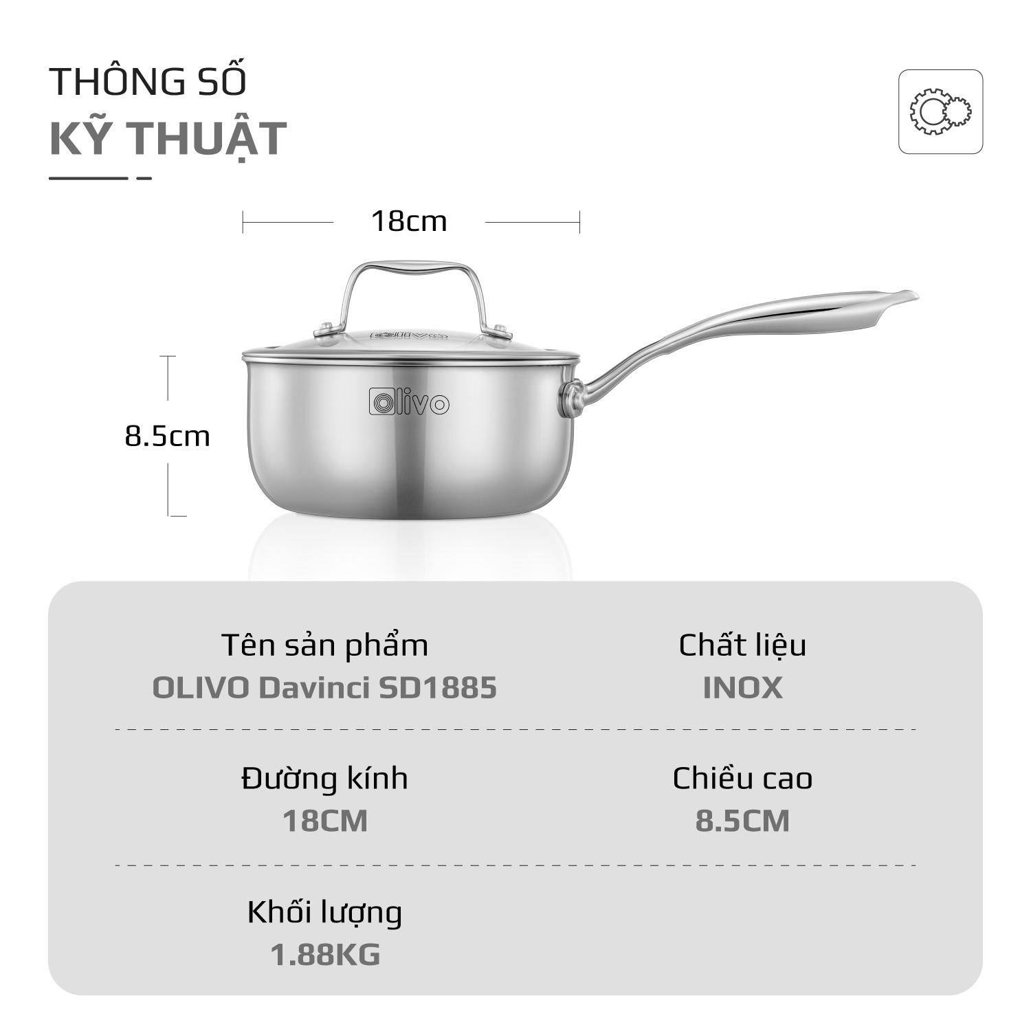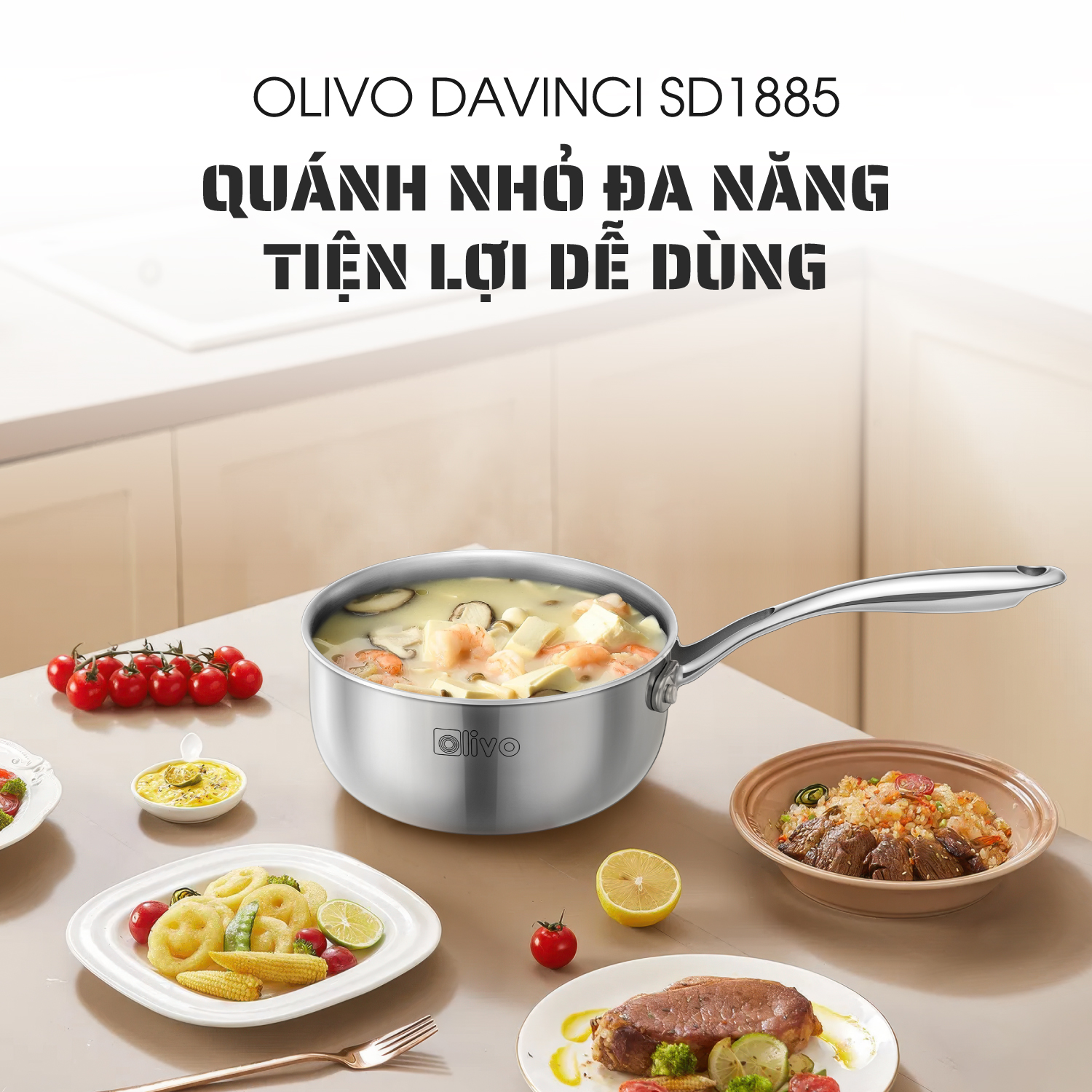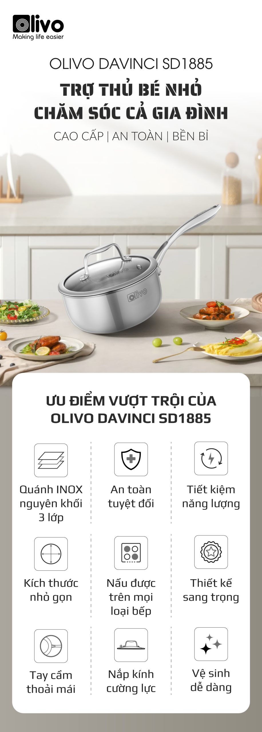 - Nhỏ gọn nhưng “đa năng”, quánh inox OLIVO Davinci SD1885 là lựa chọn hoàn hảo cho các gia đình có trẻ nhỏ và ít người. Trợ thủ thông minh, đồng hành cùng bạn trong từng bữa ăn gia đình.