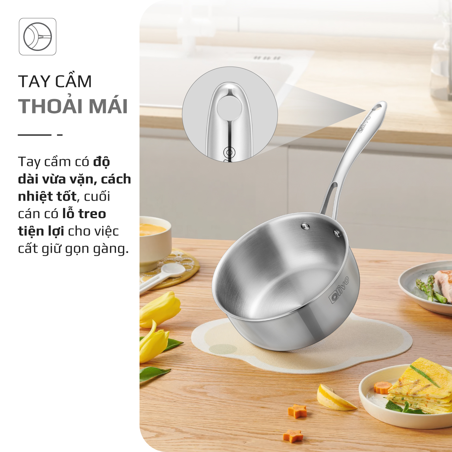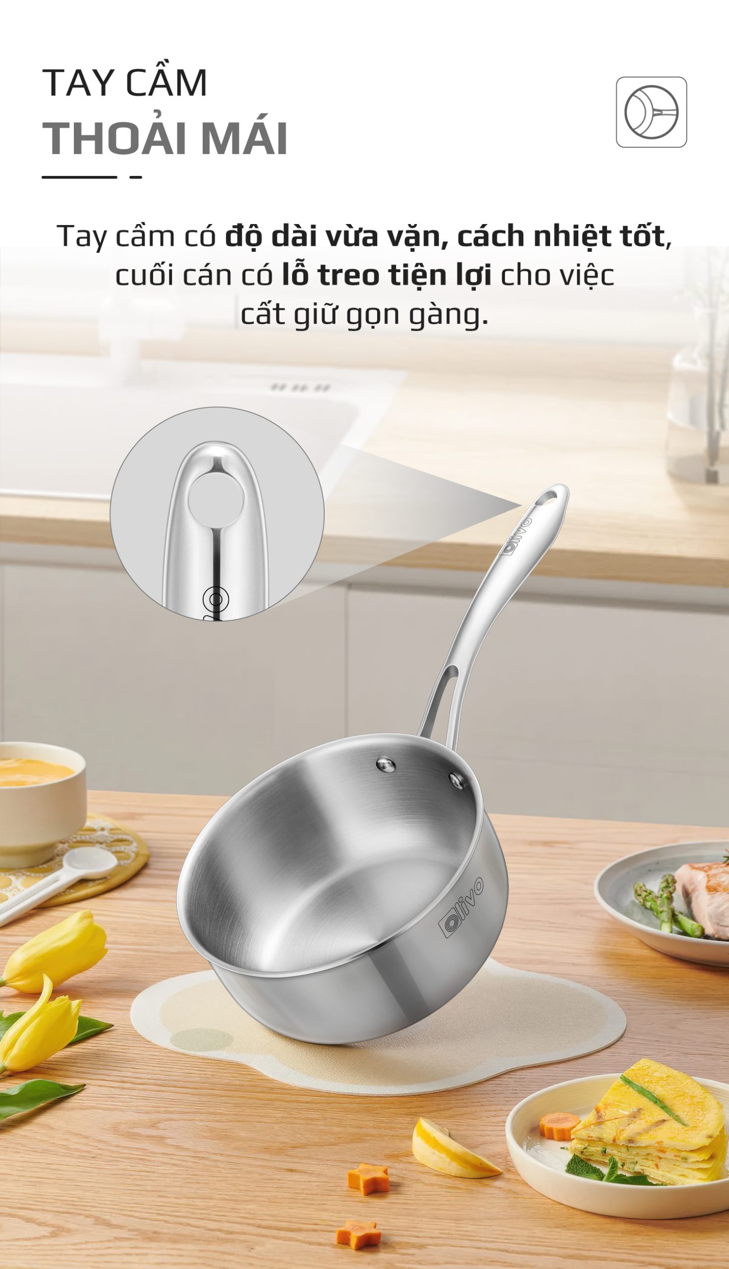 - Quai cầm dài, cách nhiệt, cầm nắm chắc chắn và thoải mái giúp bạn an tâm khi thao tác nấu nướng. Cuối cán có lỗ treo tiện lợi cho việc cất giữ gọn gàng.
