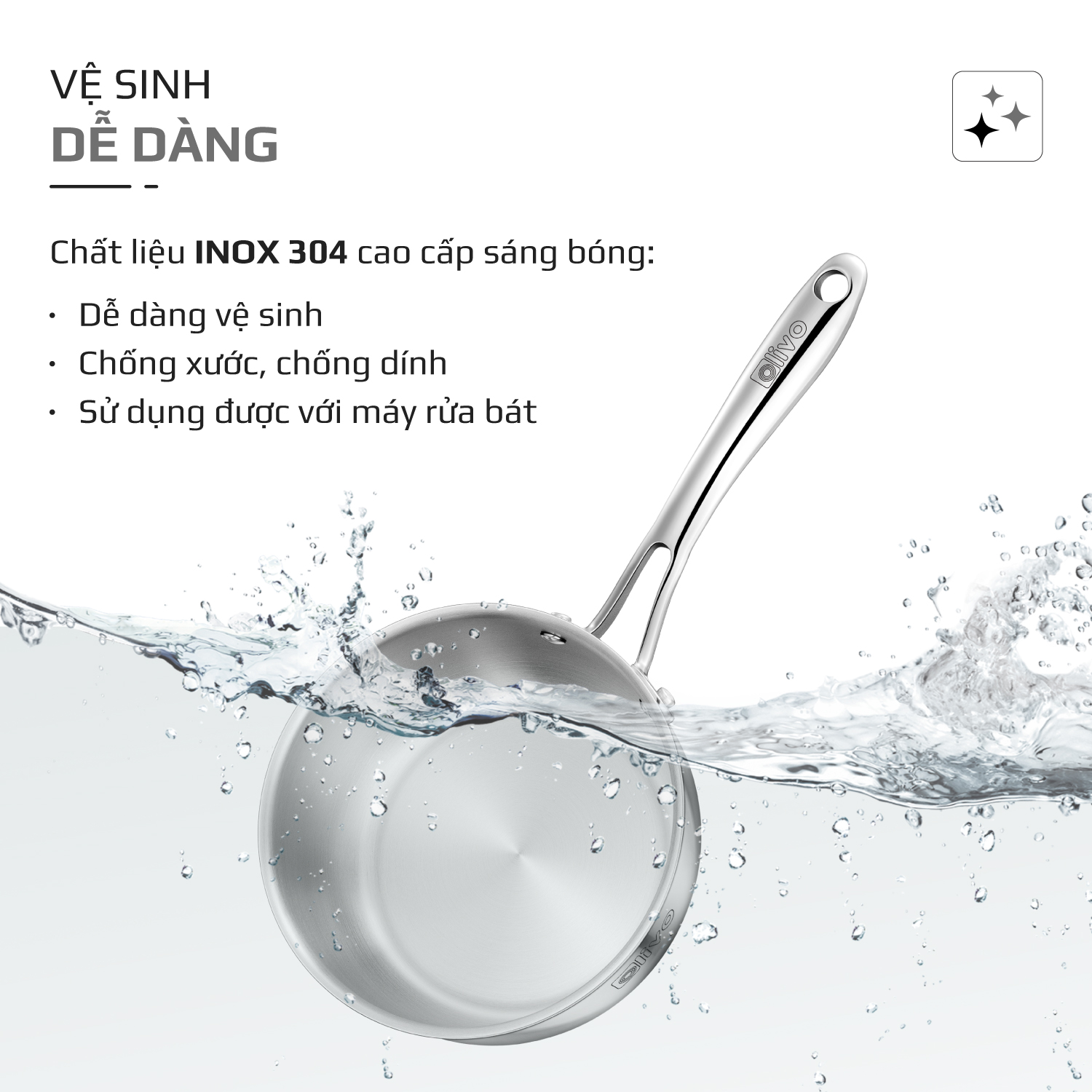 - Bề mặt inox sáng bóng, nhẵn mịn giúp quánh OLIVO Davinci SD1885 không bám dầu mỡ, không ám mùi thực phẩm, dễ dàng vệ sinh chỉ với một chút nước rửa chén và miếng bọt biển mềm. Nhờ thiết kế nguyên khối liền mạch, quánh không có các khe hở hay mối ghép, giúp ngăn cặn bẩn và vi khuẩn tích tụ, đảm bảo vệ sinh tuyệt đối sau mỗi lần sử dụng.