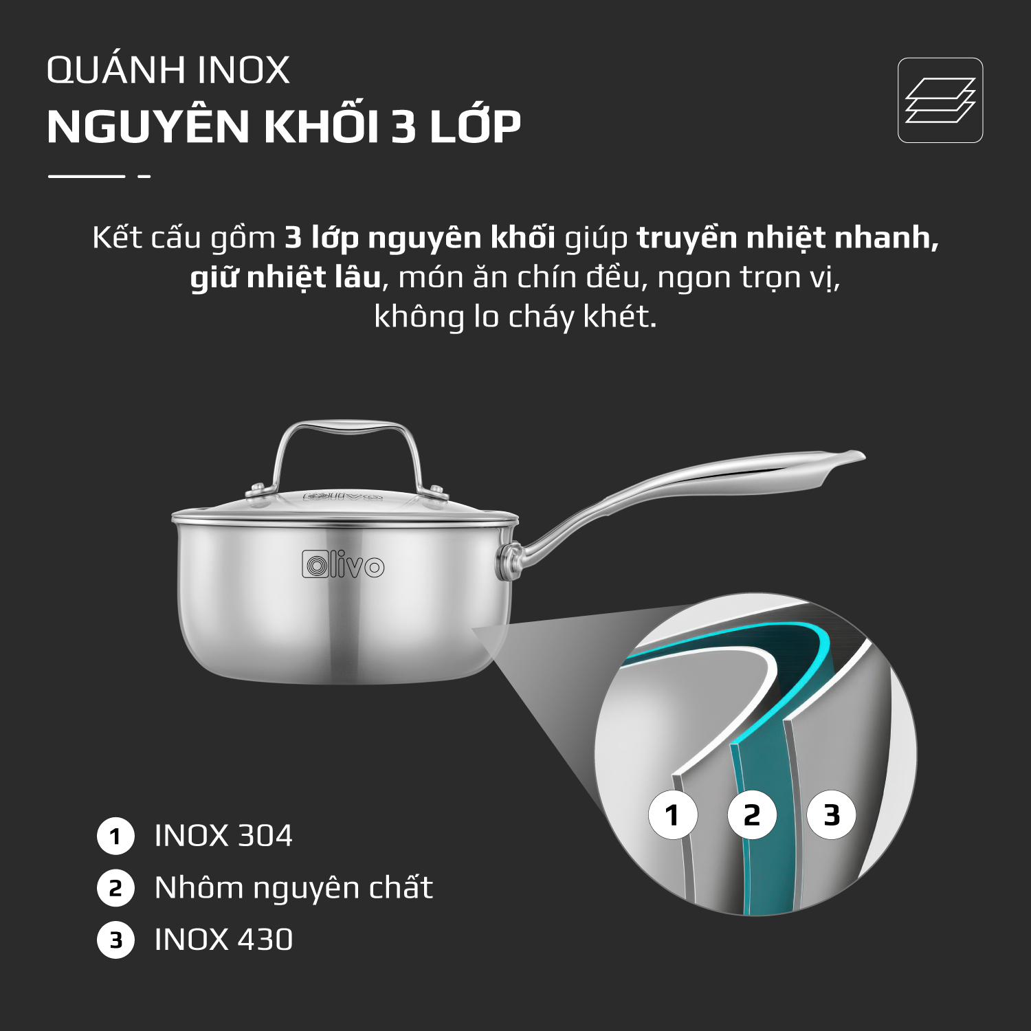 Quánh OLIVO Davinci SD1885 được cấu tạo từ 3 lớp inox cao cấp ép nguyên khối, mang đến độ bền vượt trội và khả năng dẫn nhiệt tối ưu: