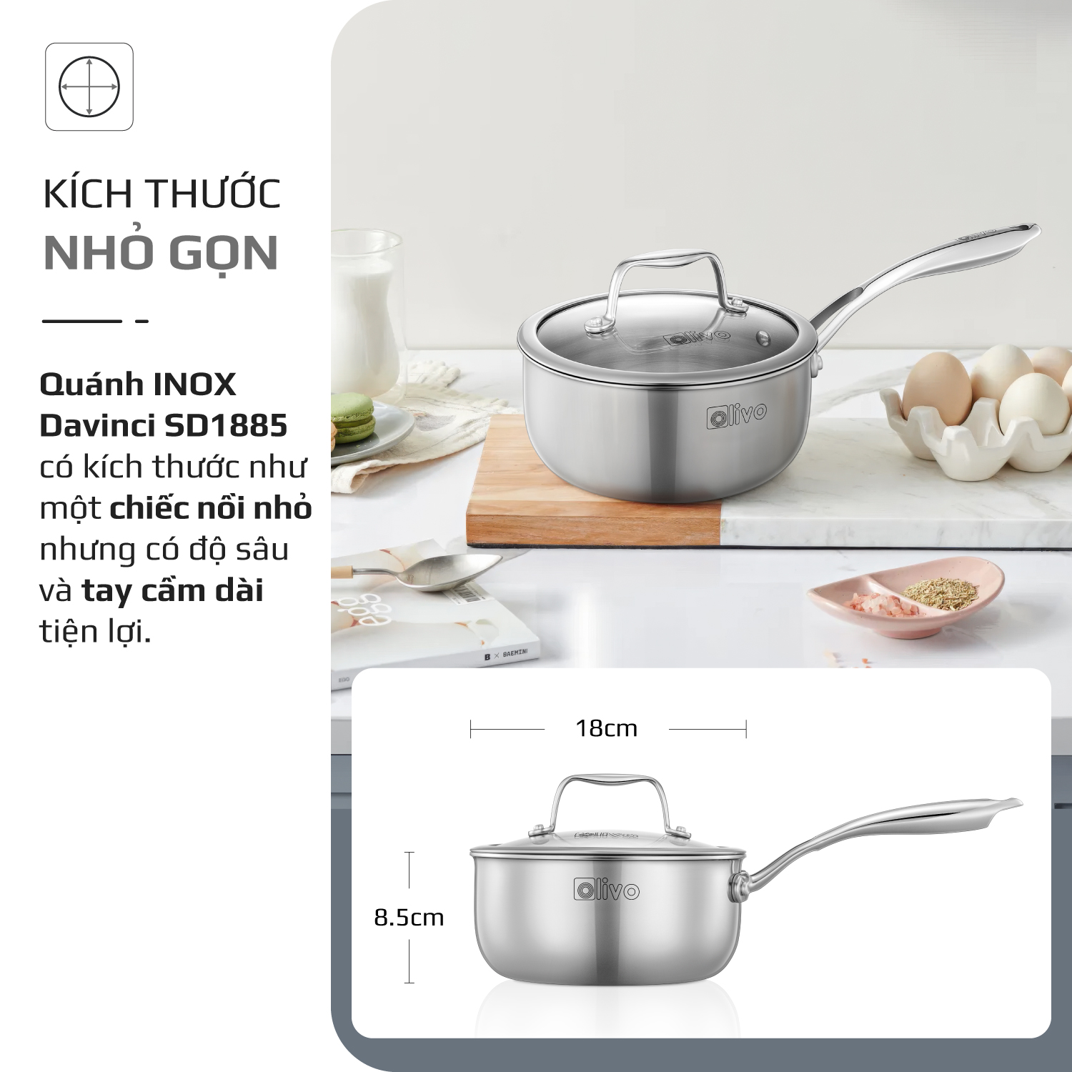 - Với kích thước nhỏ gọn nhưng độ sâu lý tưởng, cùng quai cầm dài tiện lợi, quánh Inox OLIVO Davinci SD1885 đặc biệt phù hợp cho các món nấu nhanh như luộc trứng, nấu mì hay nấu đồ ăn dặm cho bé.