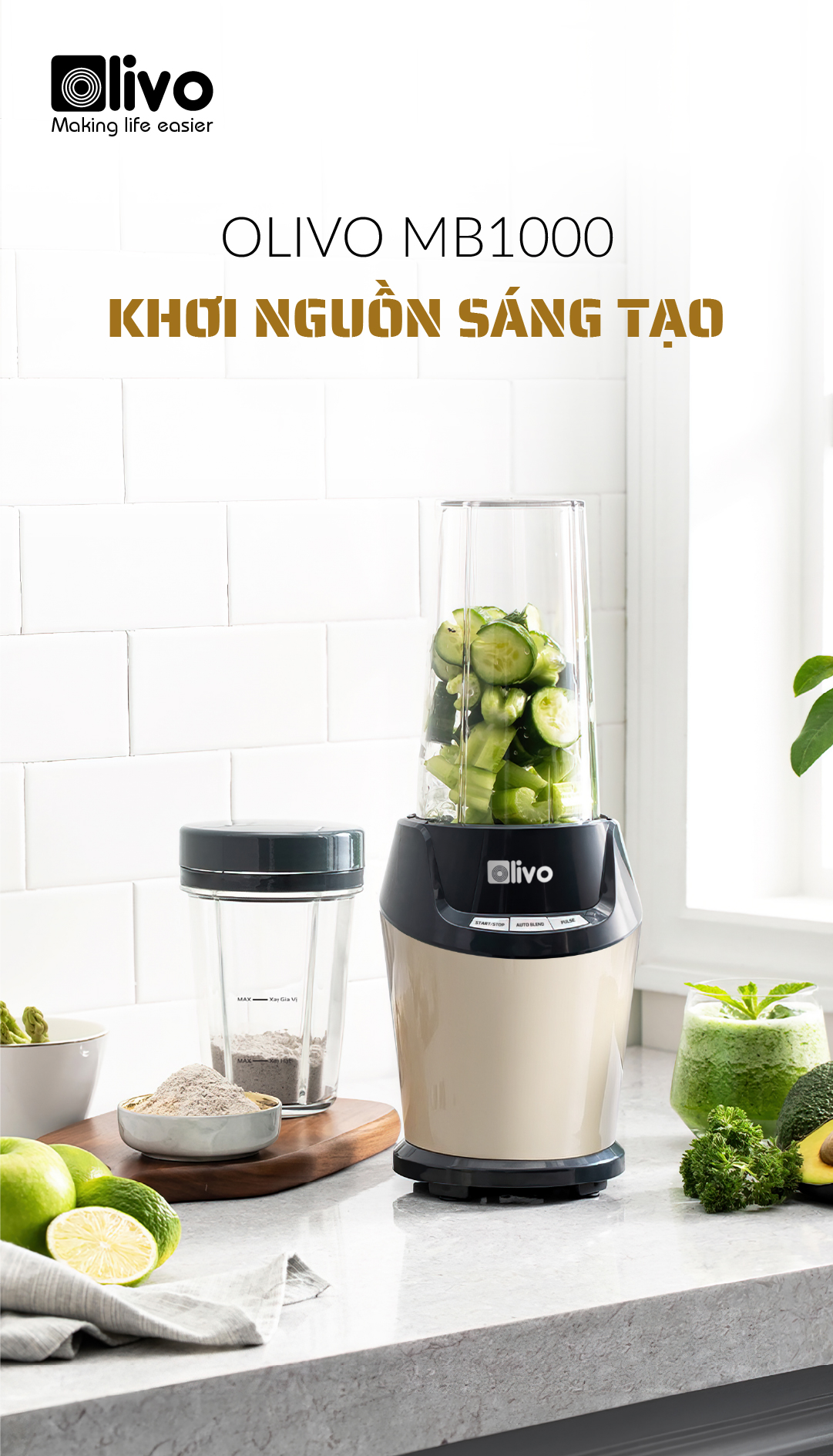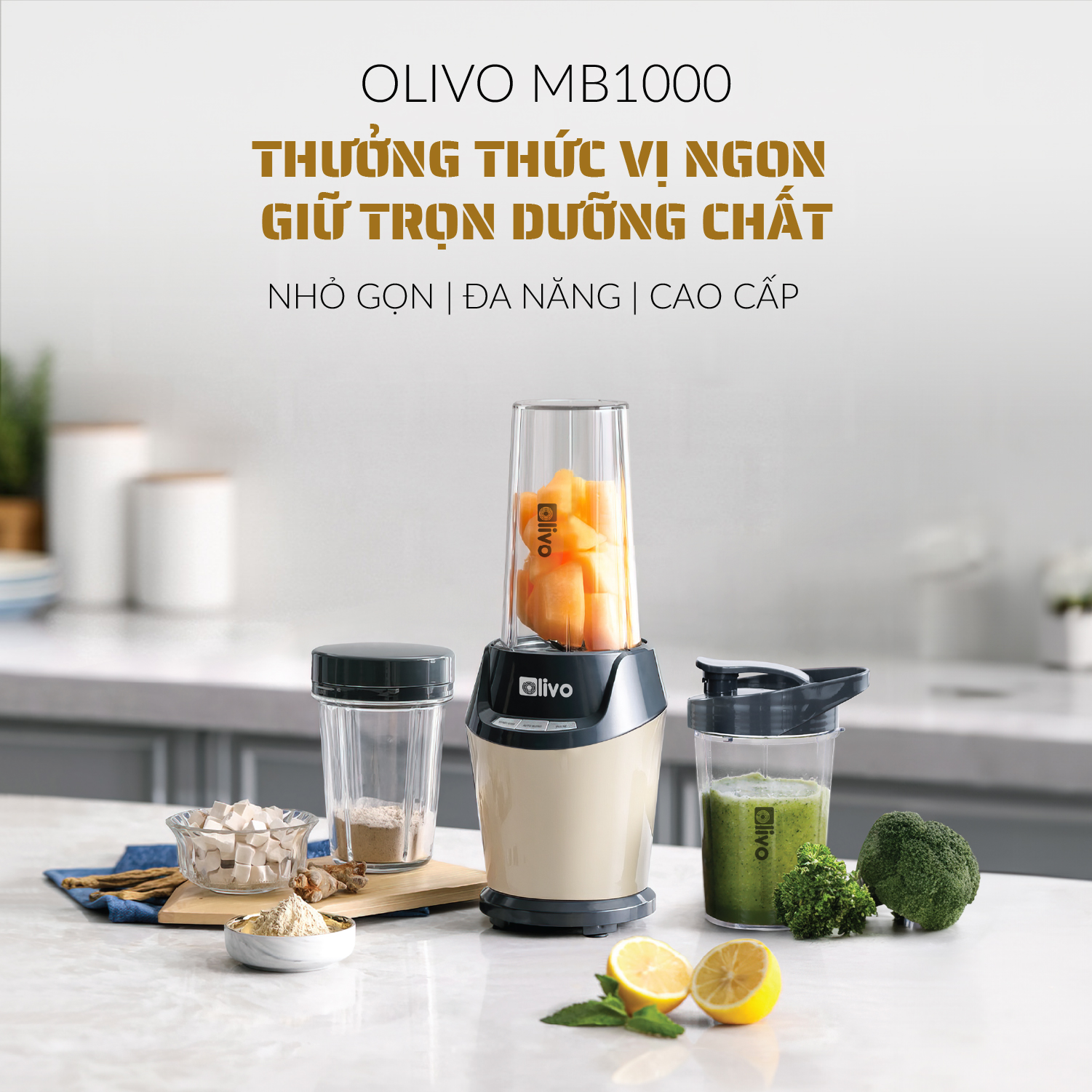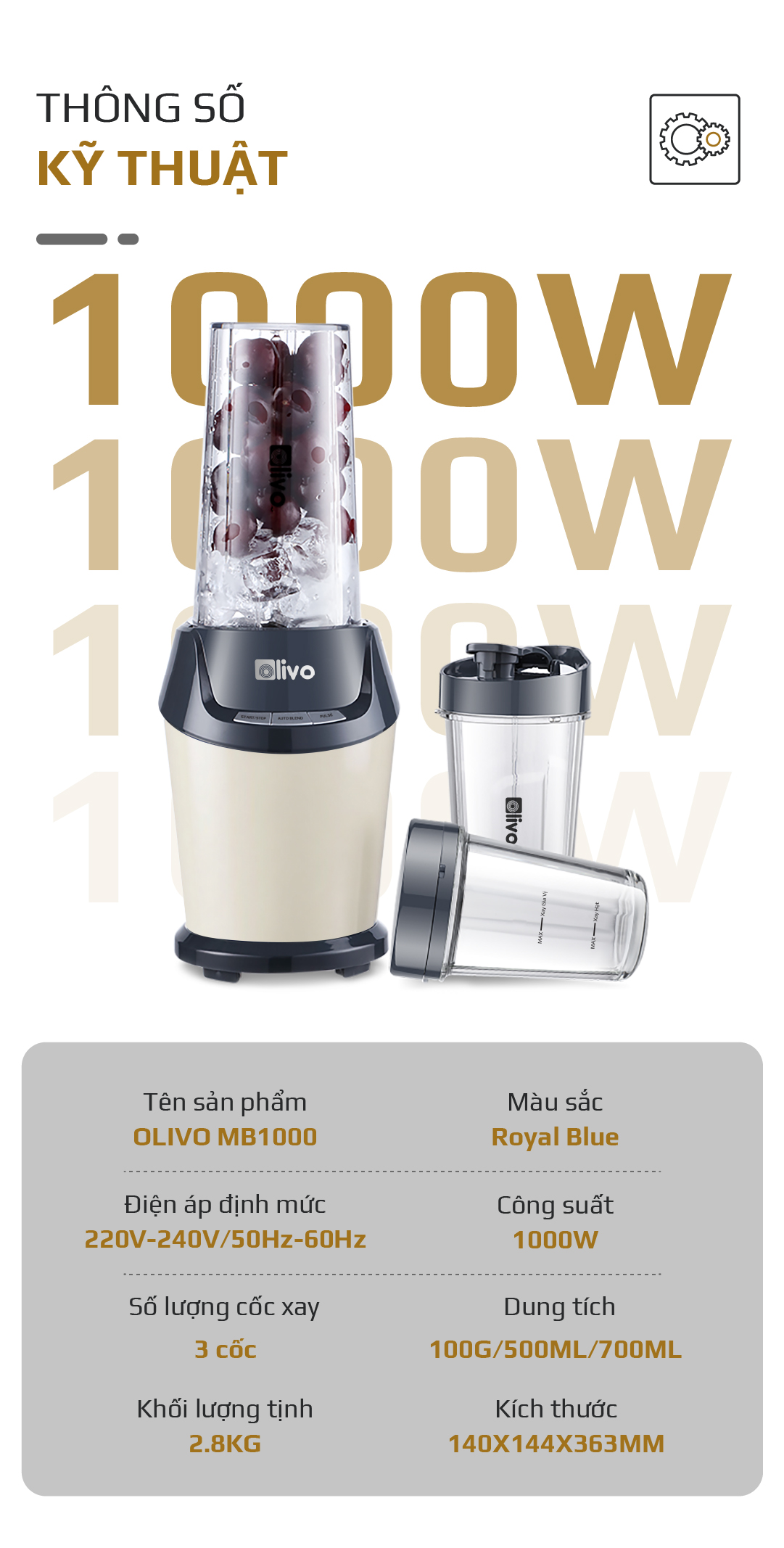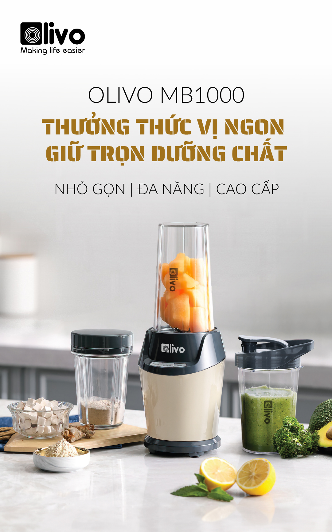 Máy Xay Sinh Tố OLIVO MB1000 – Ba Cốc Xay Linh Hoạt – Xay Đá Bào, Xay Sinh Tố, Smoothie, Đồ Ăn Dặm Cho Bé, Xay Đồ Khô – Công Suất Lớn 1000W